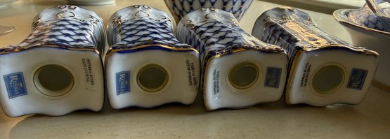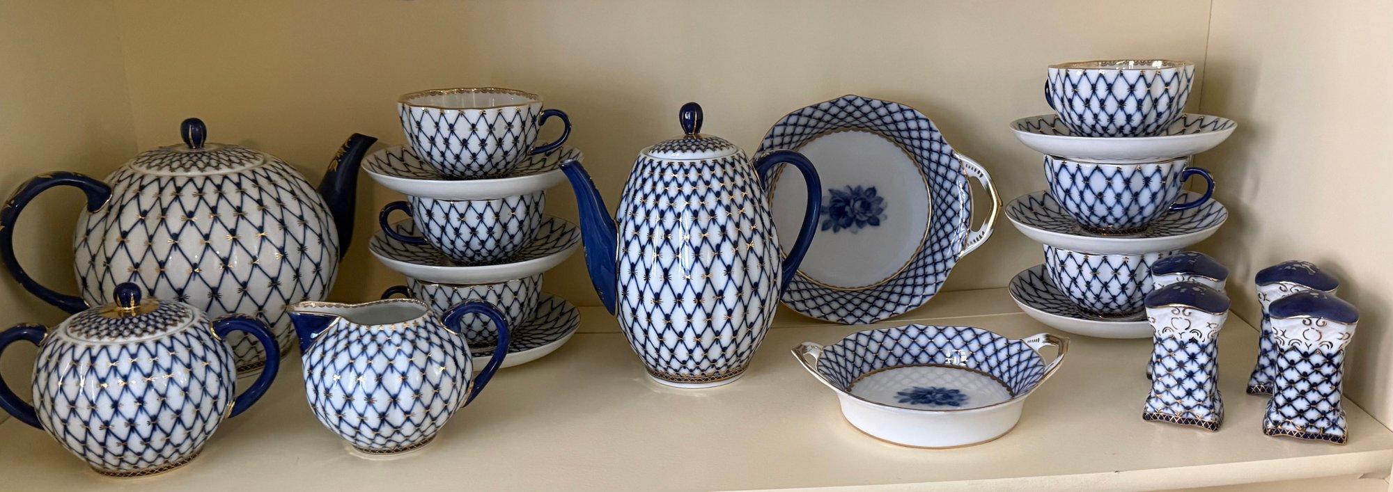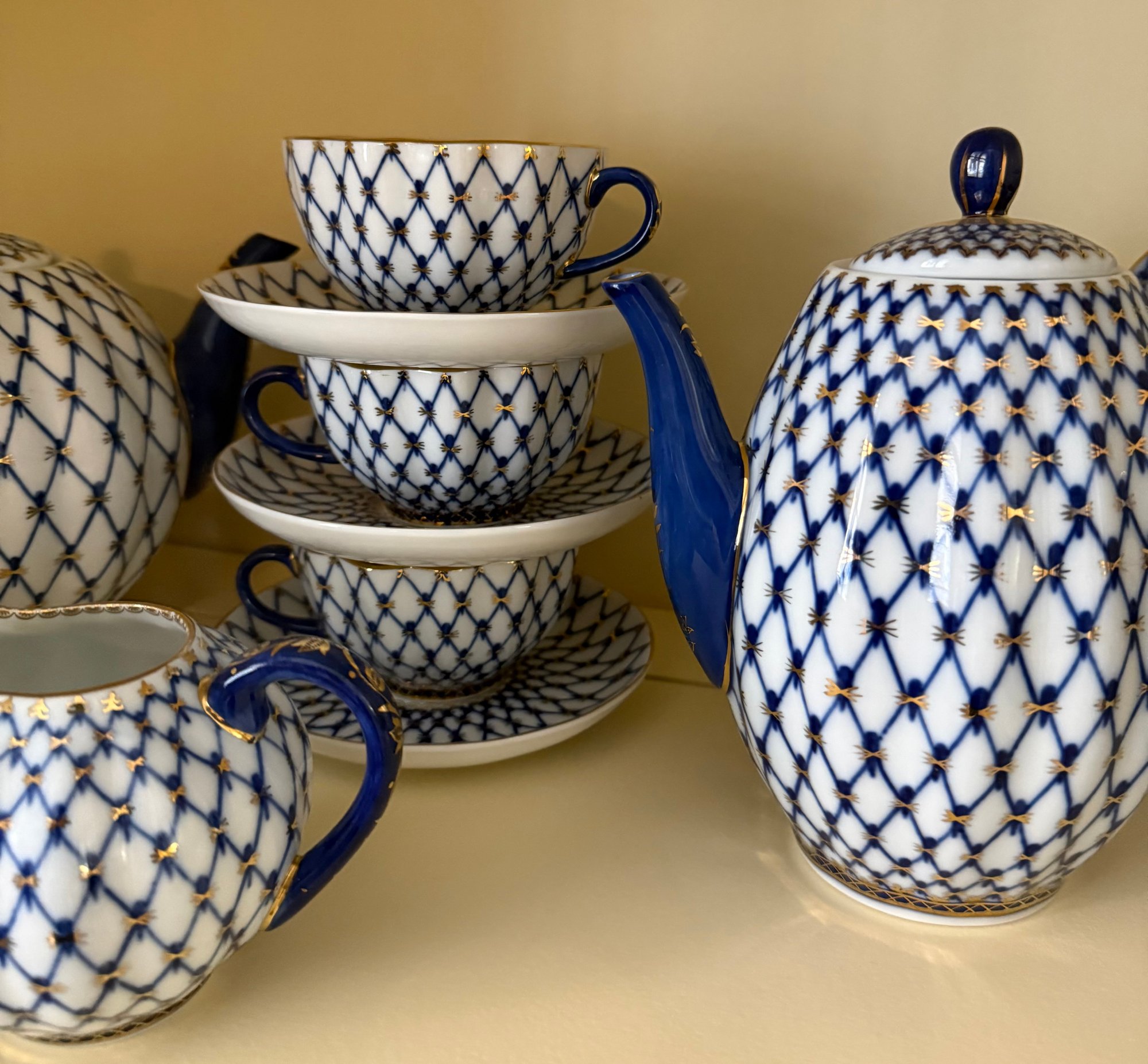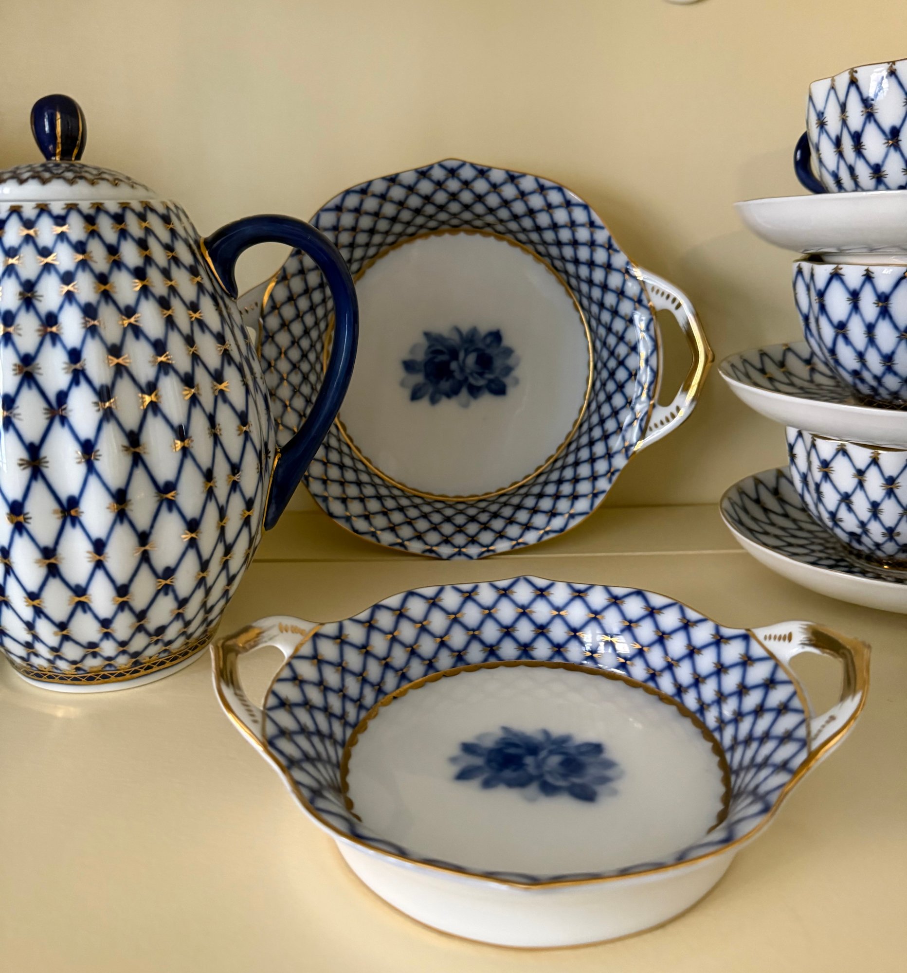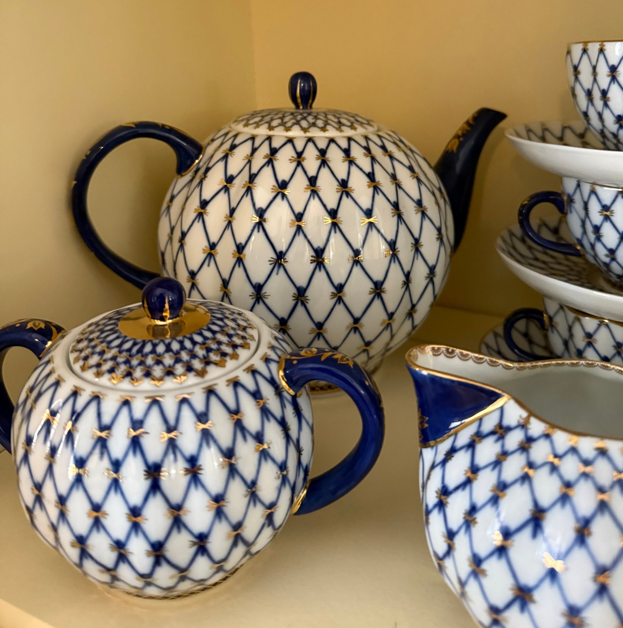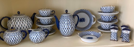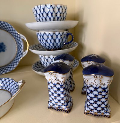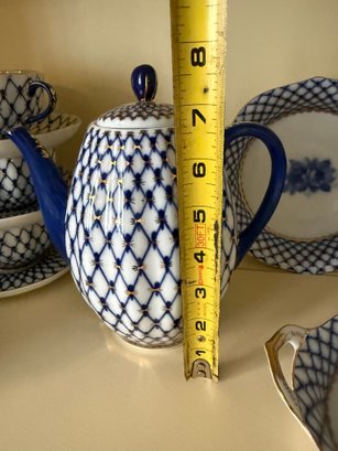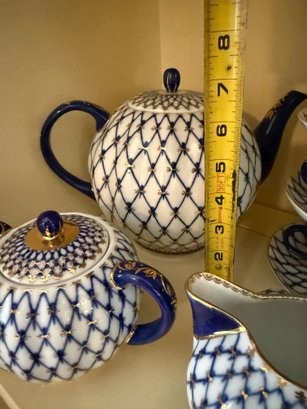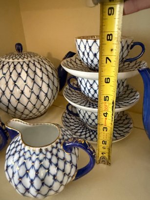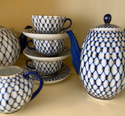 Imperial Russia Porcelain Tea Set With Cobalt Net Pattern And Tulip Shape.