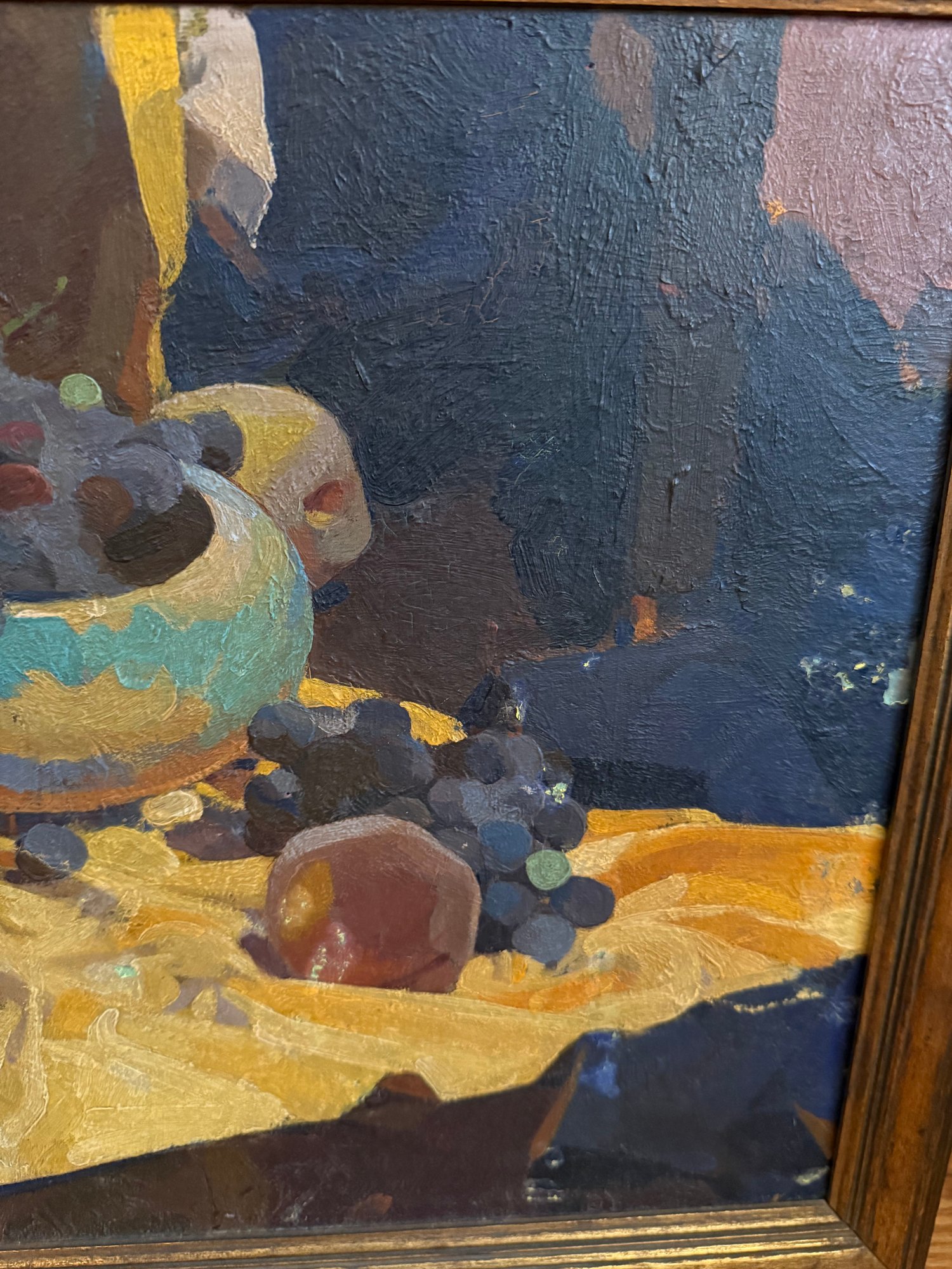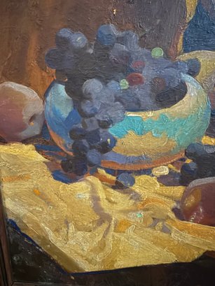 Impressionistic Oil Painting Of Grapes, Peaches, And A Bowl