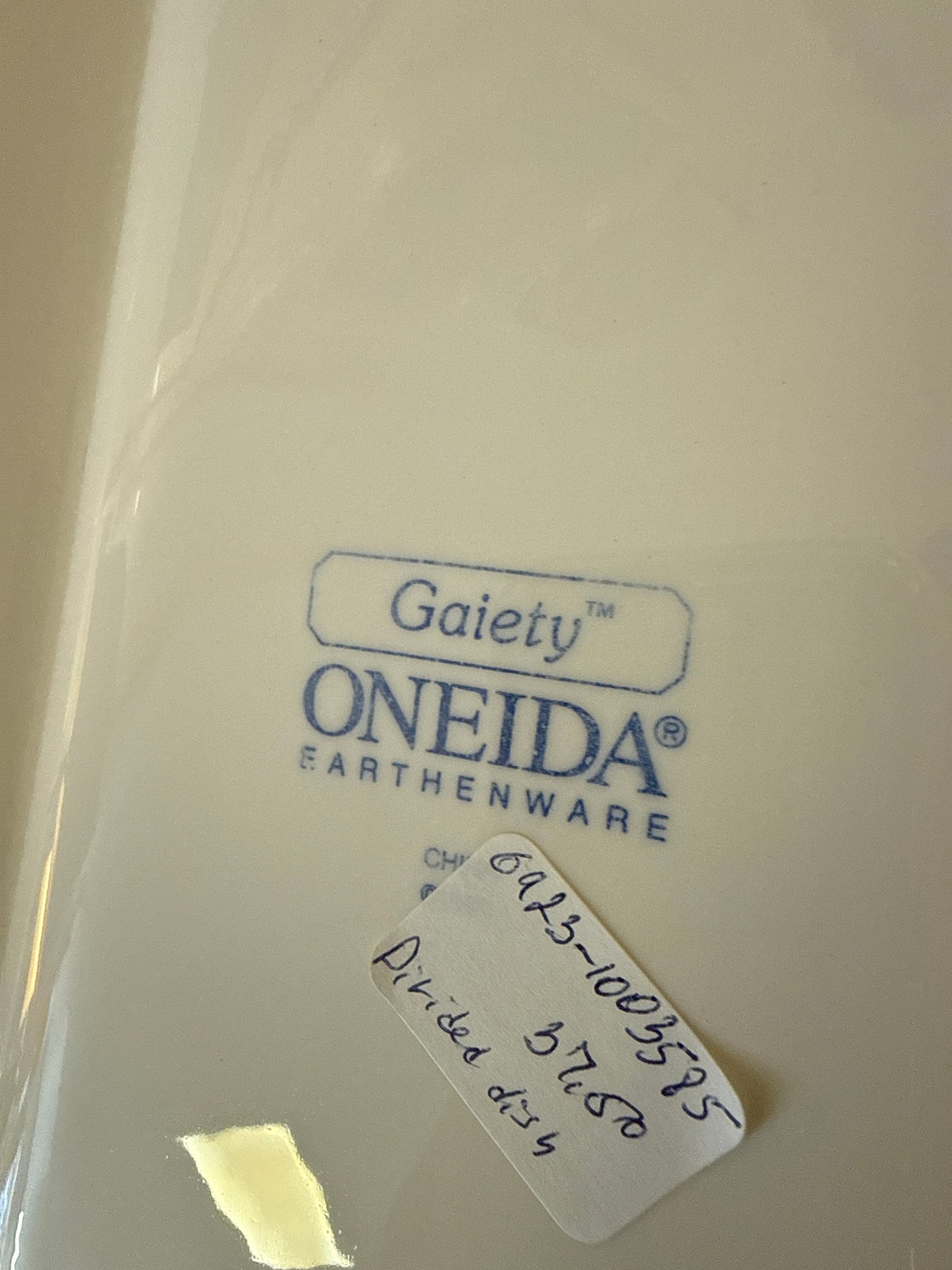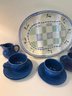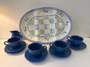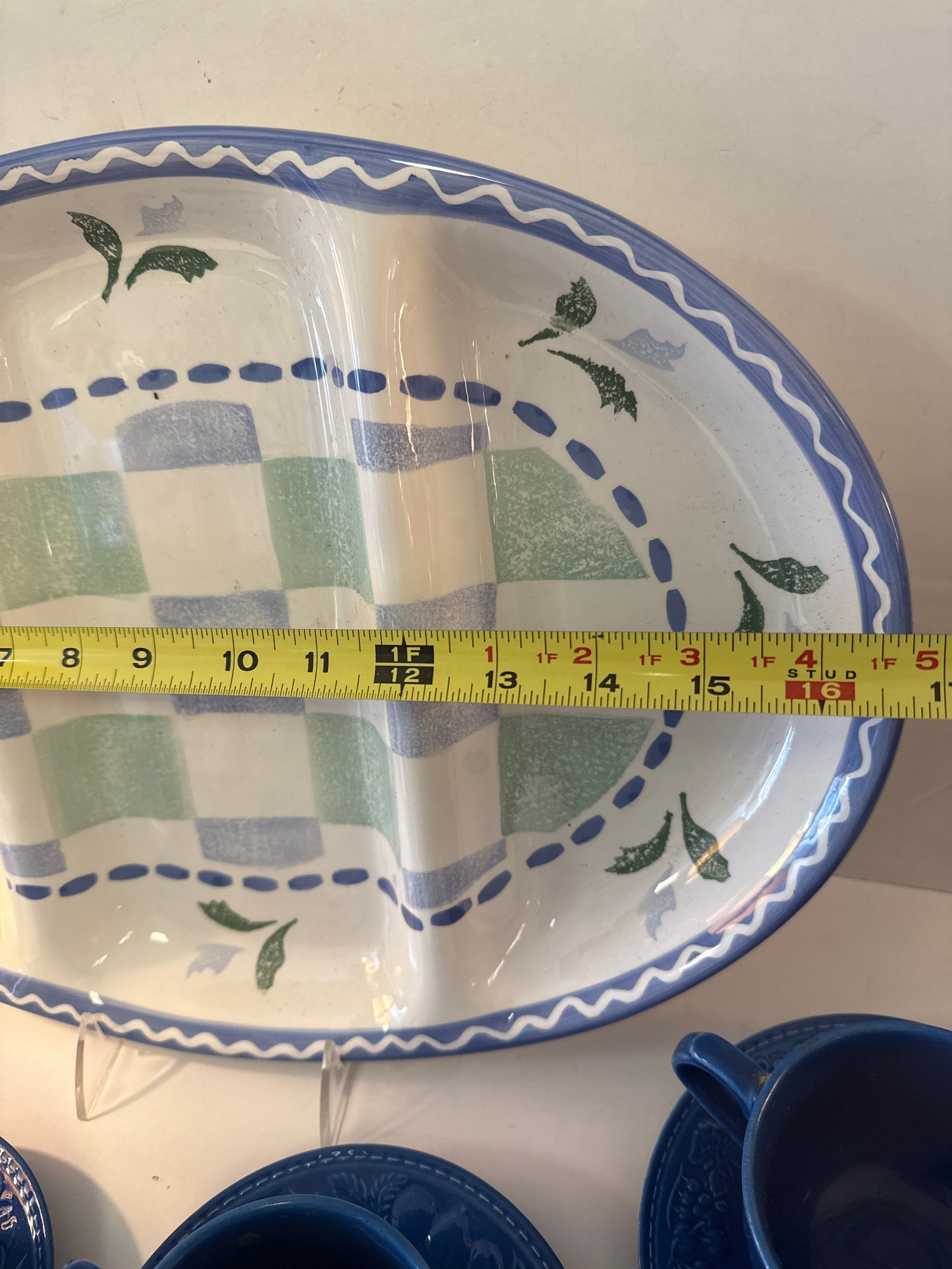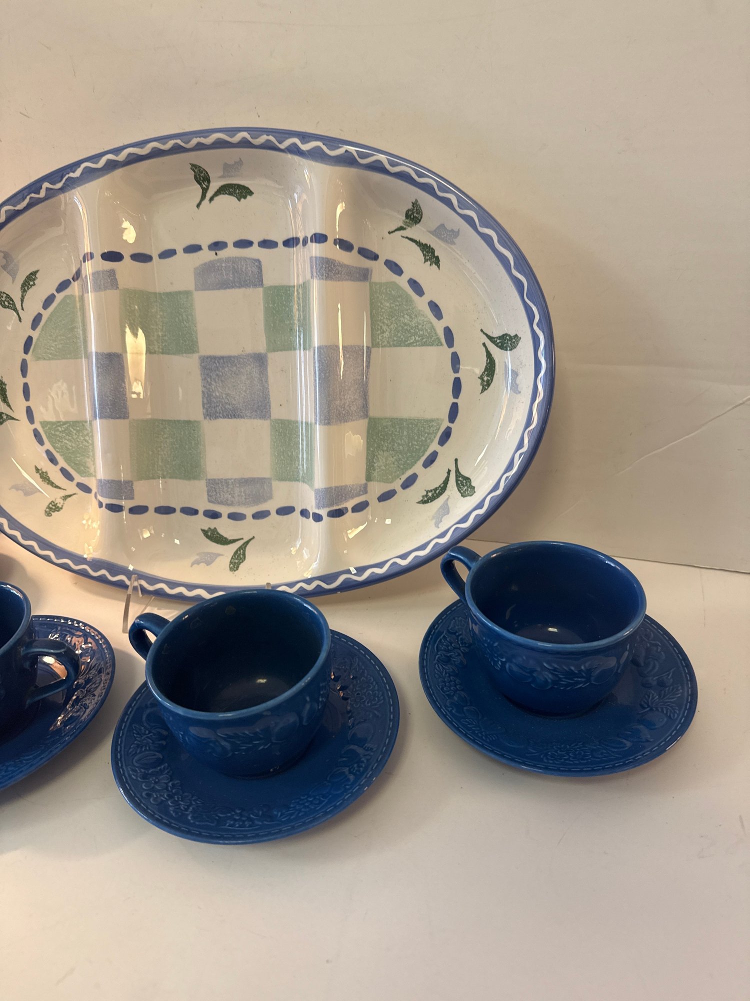 Oneida Earthenware Divided Serving Tray, Blue Tea Cups/saucers And A Creamer