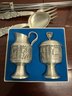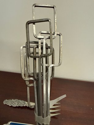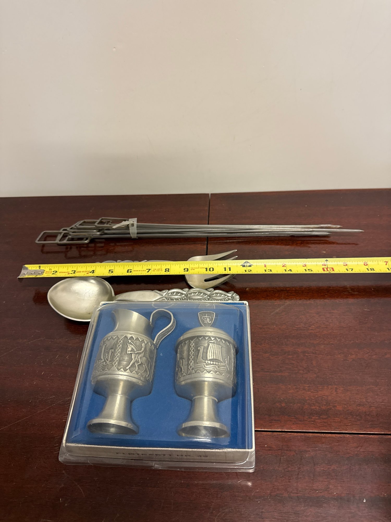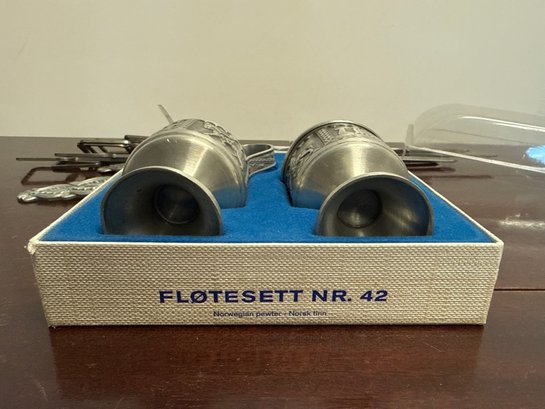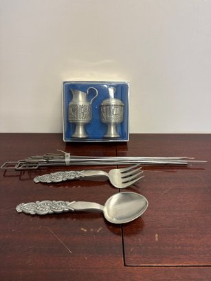 Norwegian Pewter Sugar/creamer Set With Serving Spoon/fork & Mid Century Modern Skewers