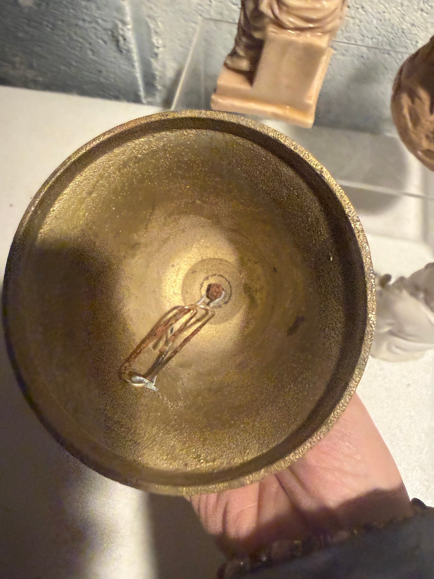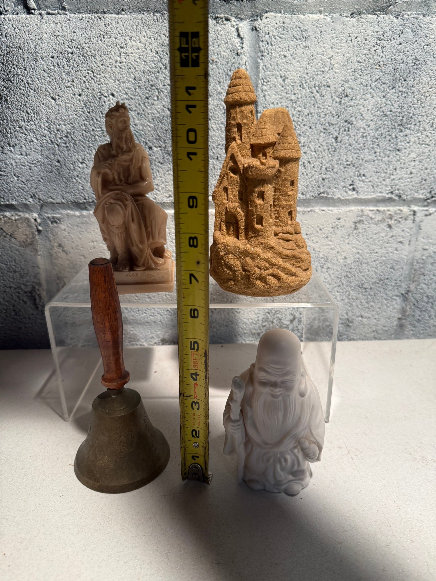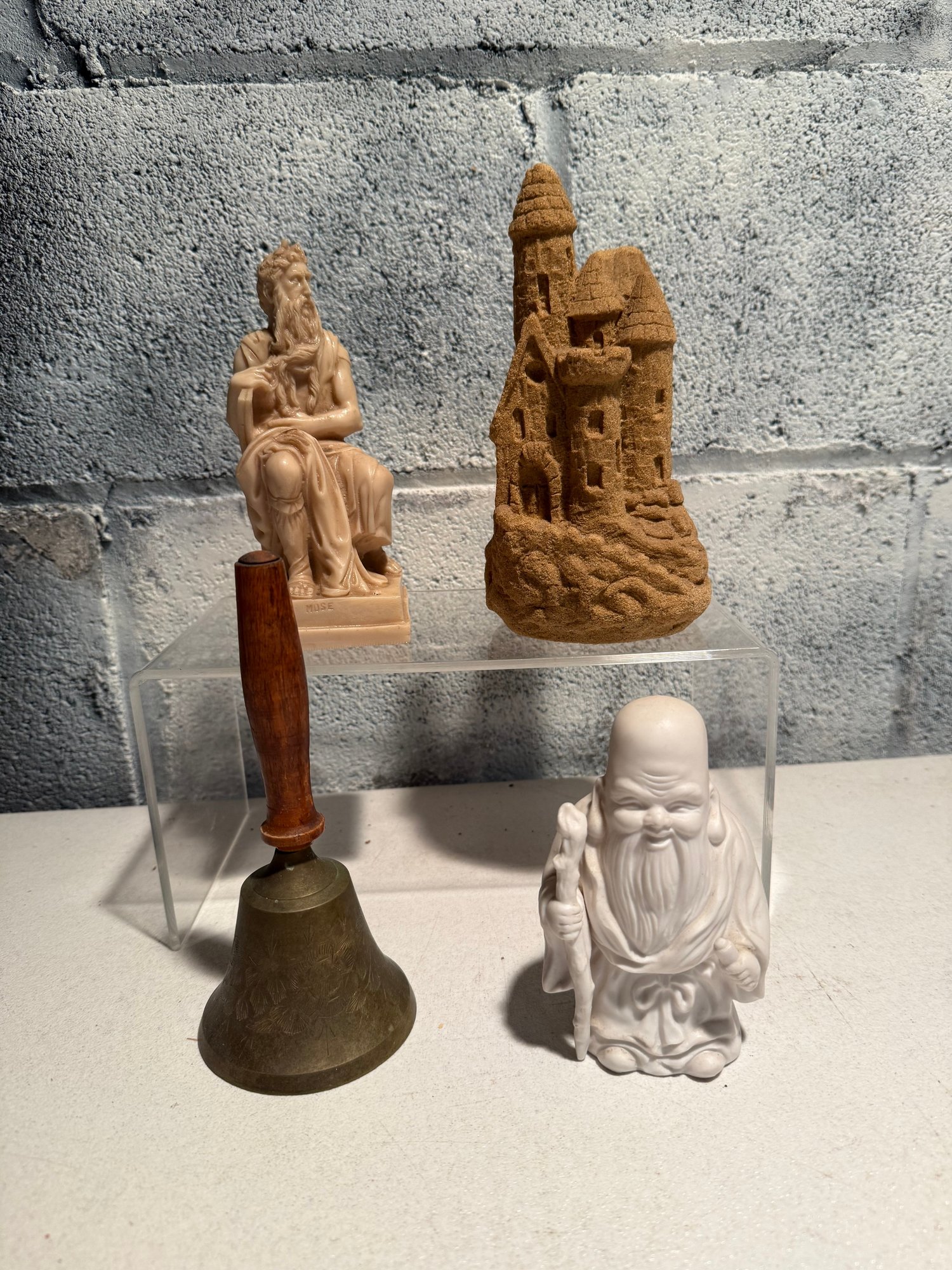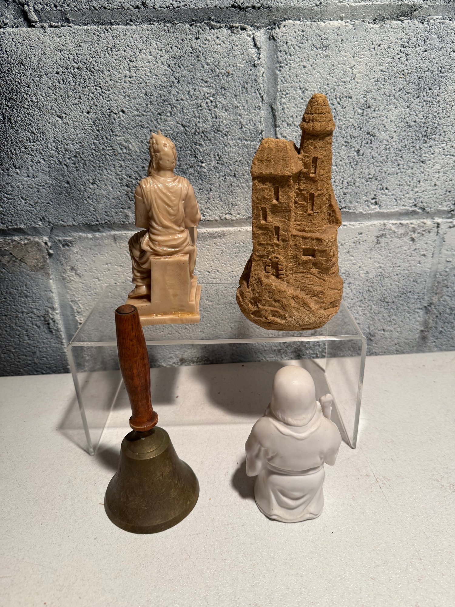 Seated Philosopher, Sandcastle Model, Metal Hand Bell With Wooden Handle, & White Bisque Holy Man