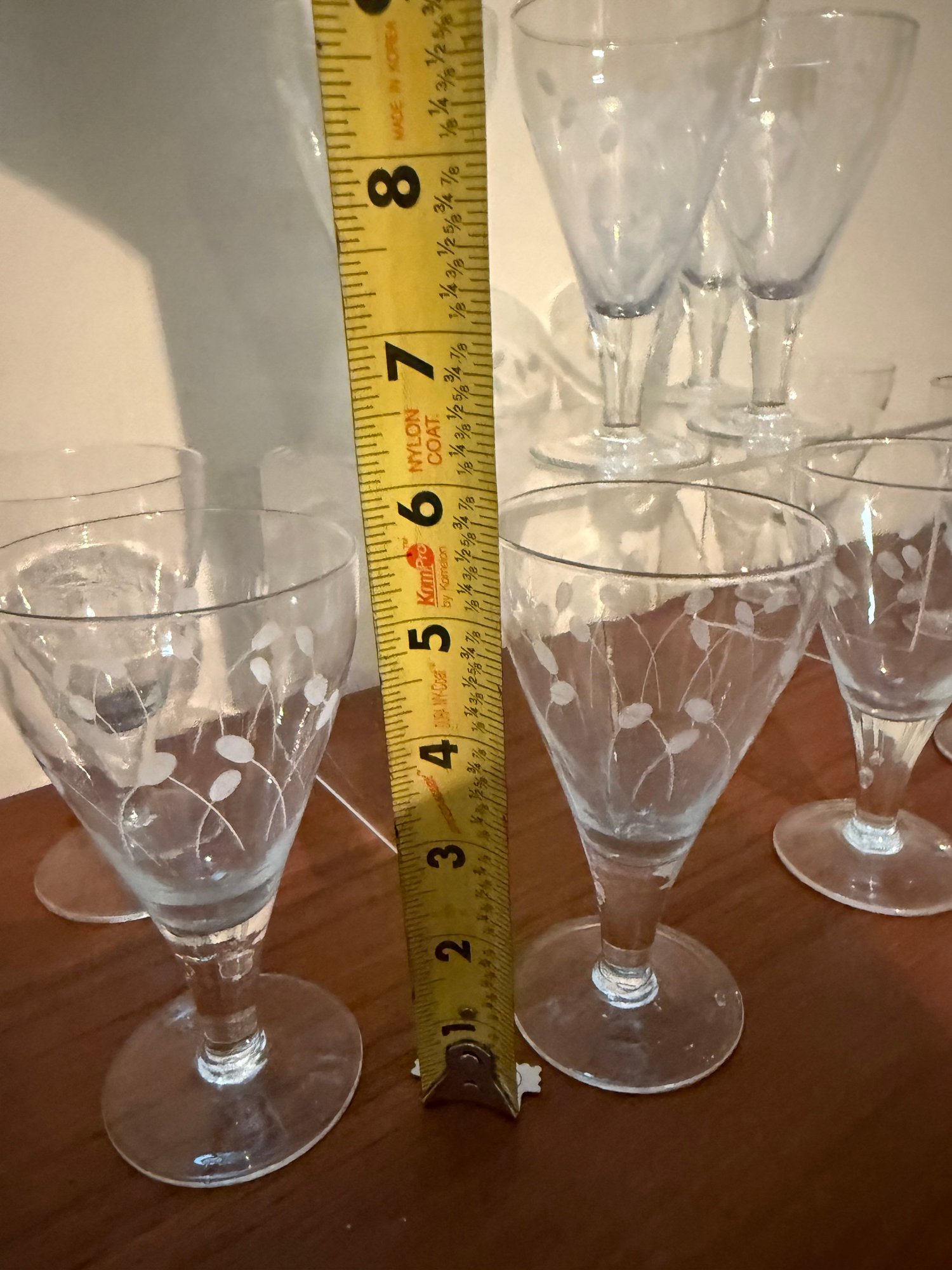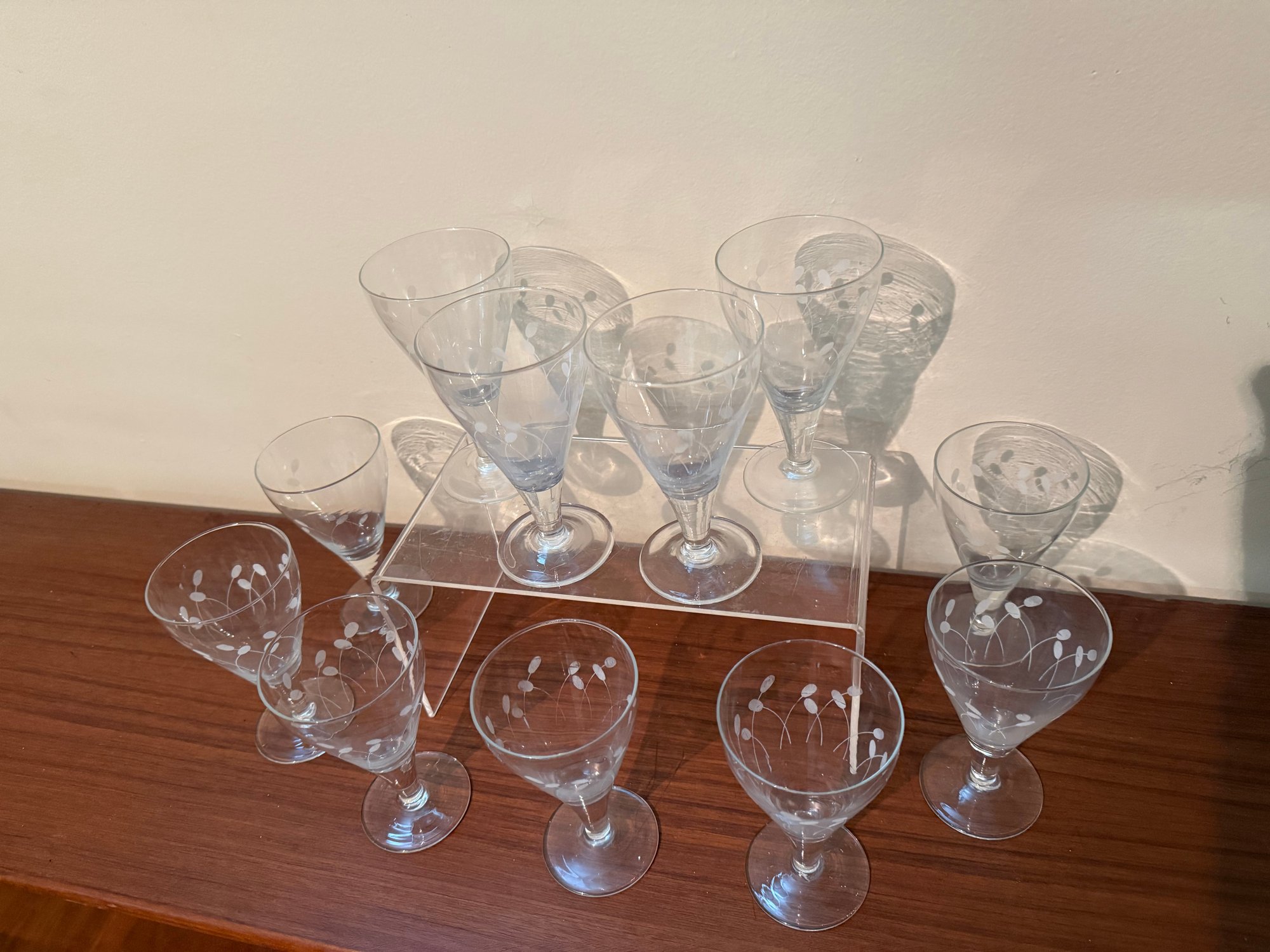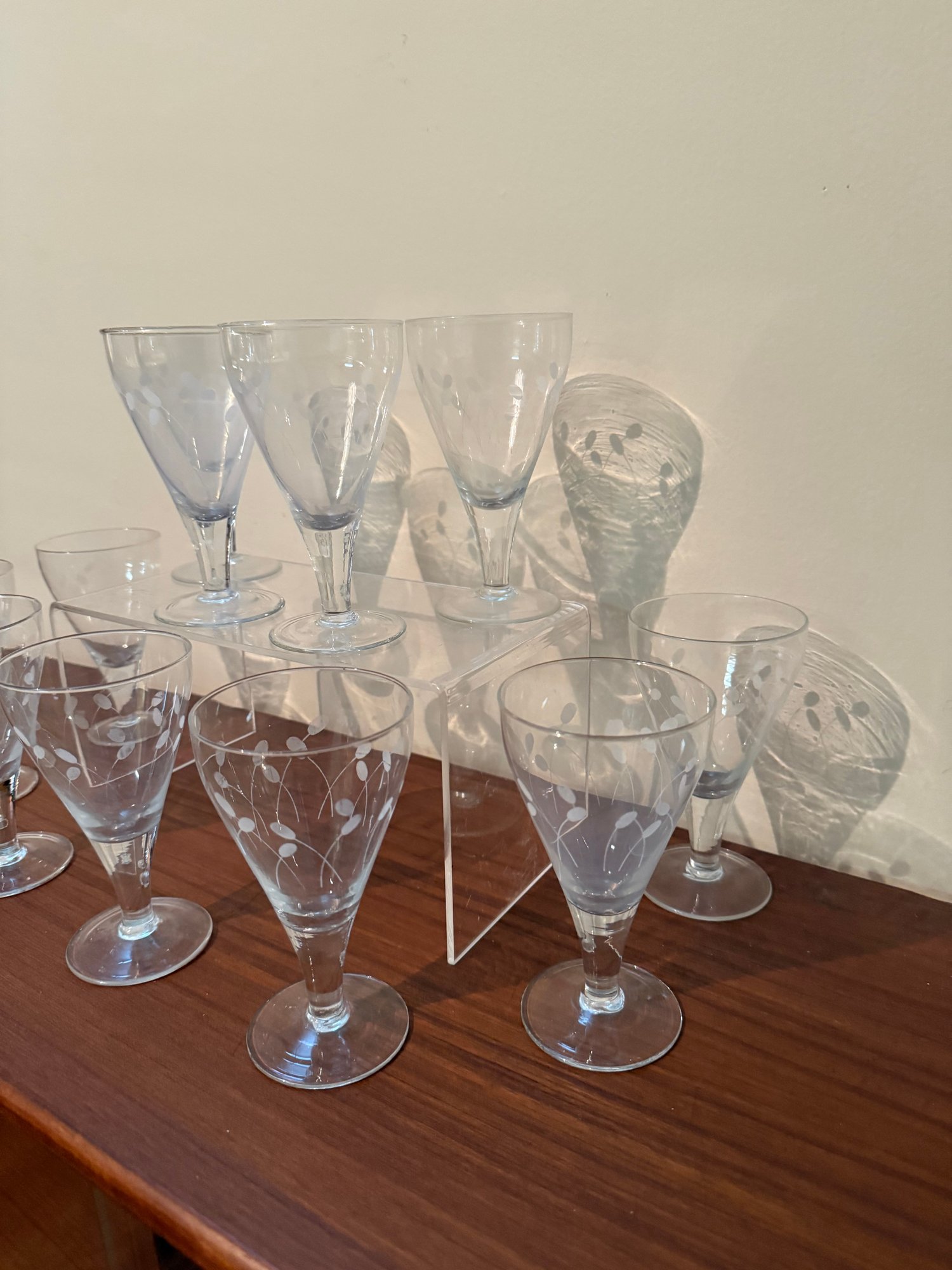 Set Of 11 Mid-century Etched Glass Cordial Or Wine Glasses.