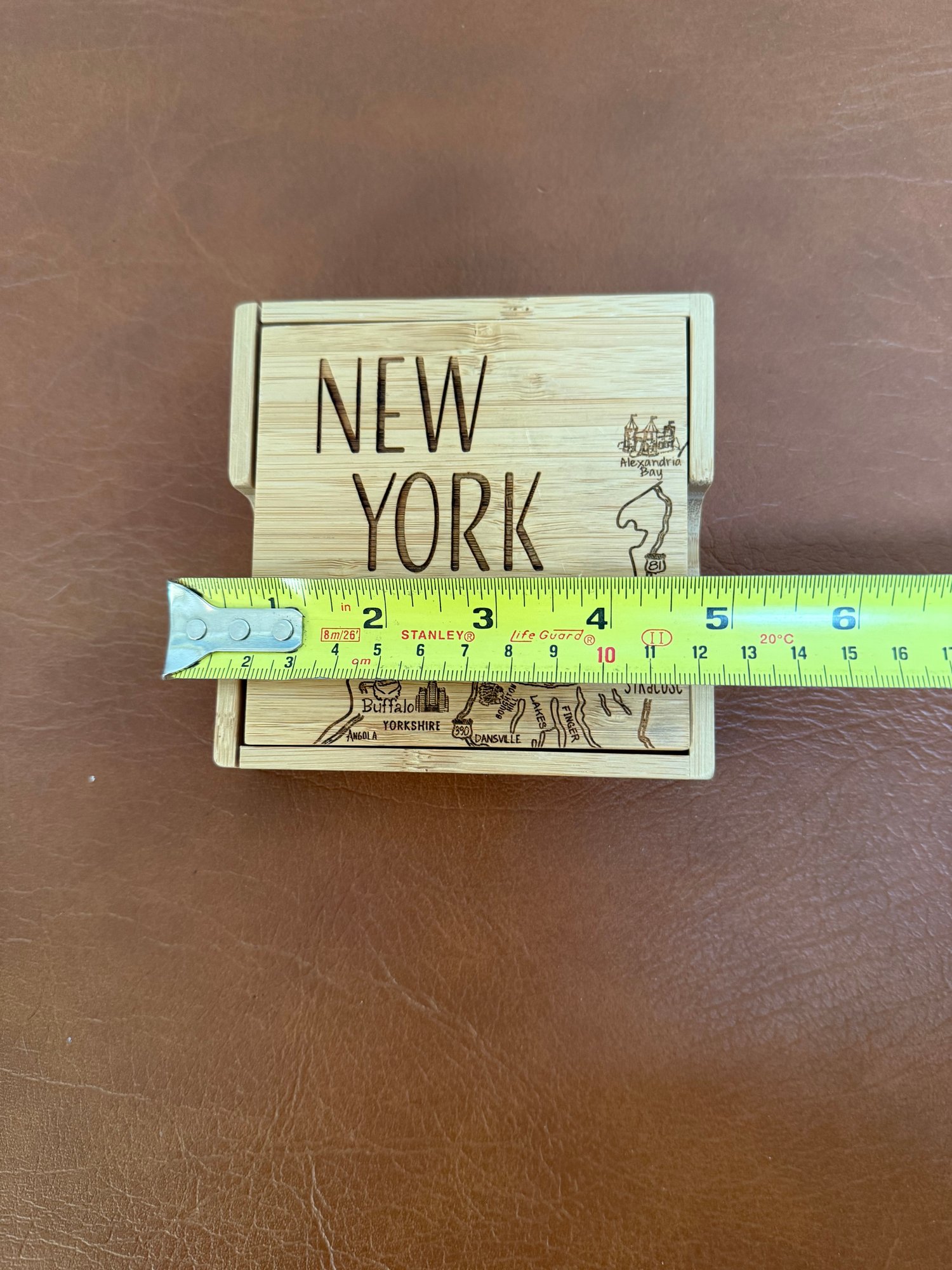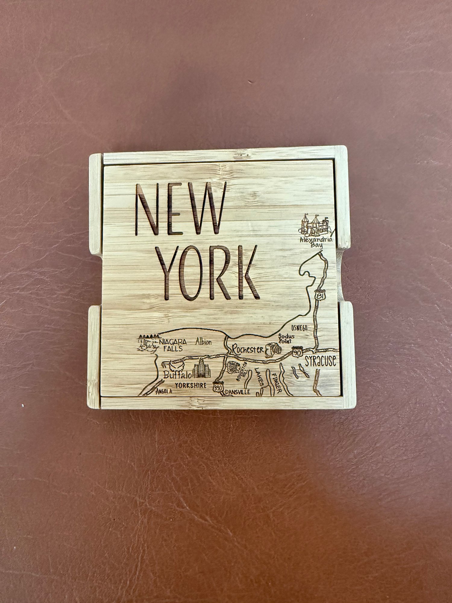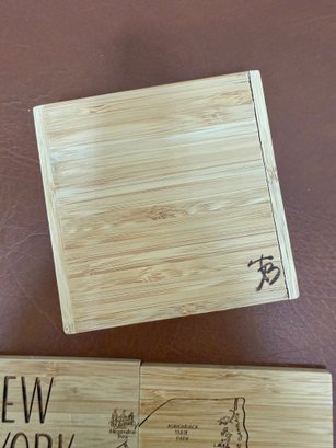 Set Of Four Bamboo Coasters With A New York State Map Design And Holder