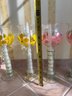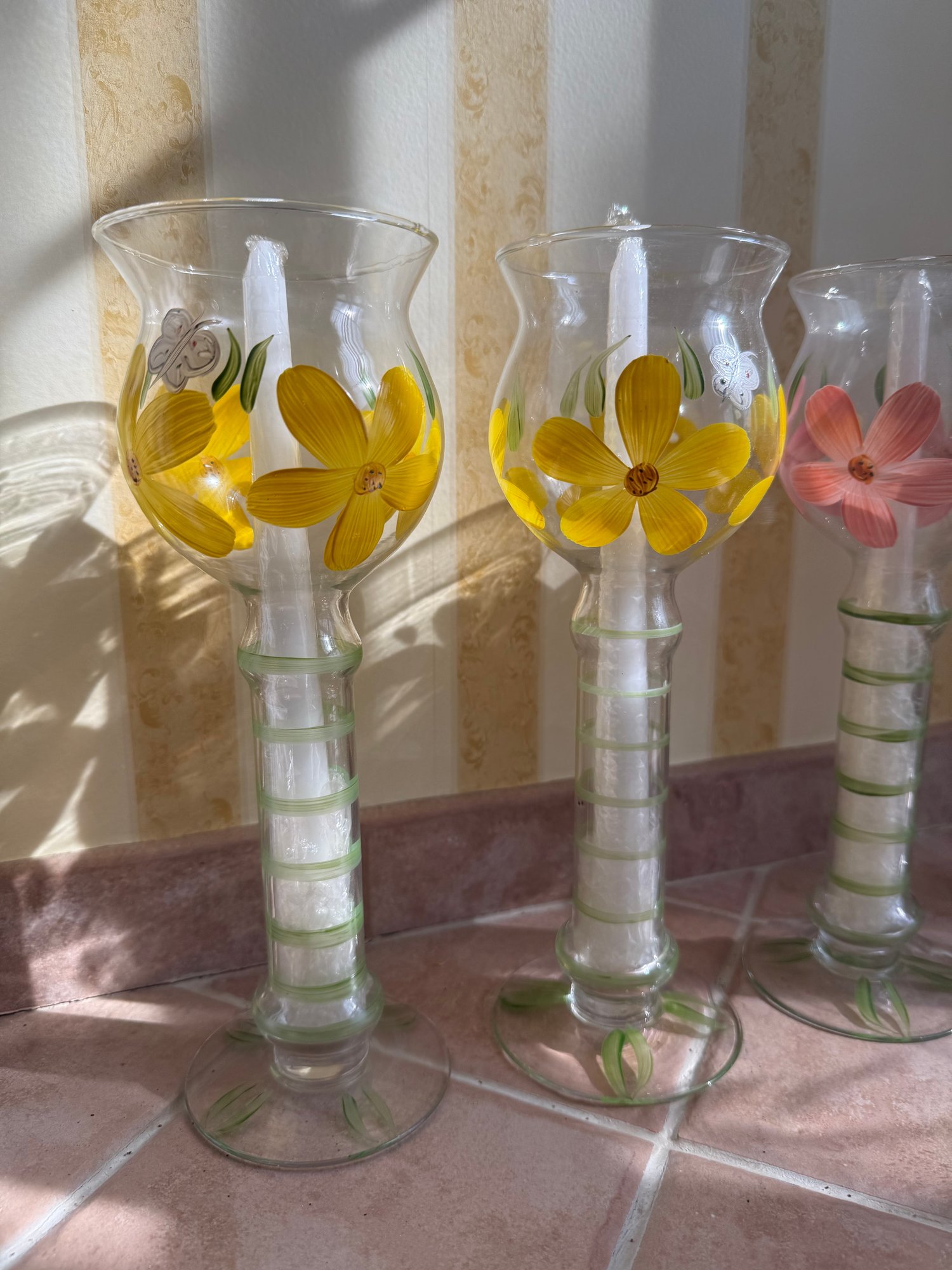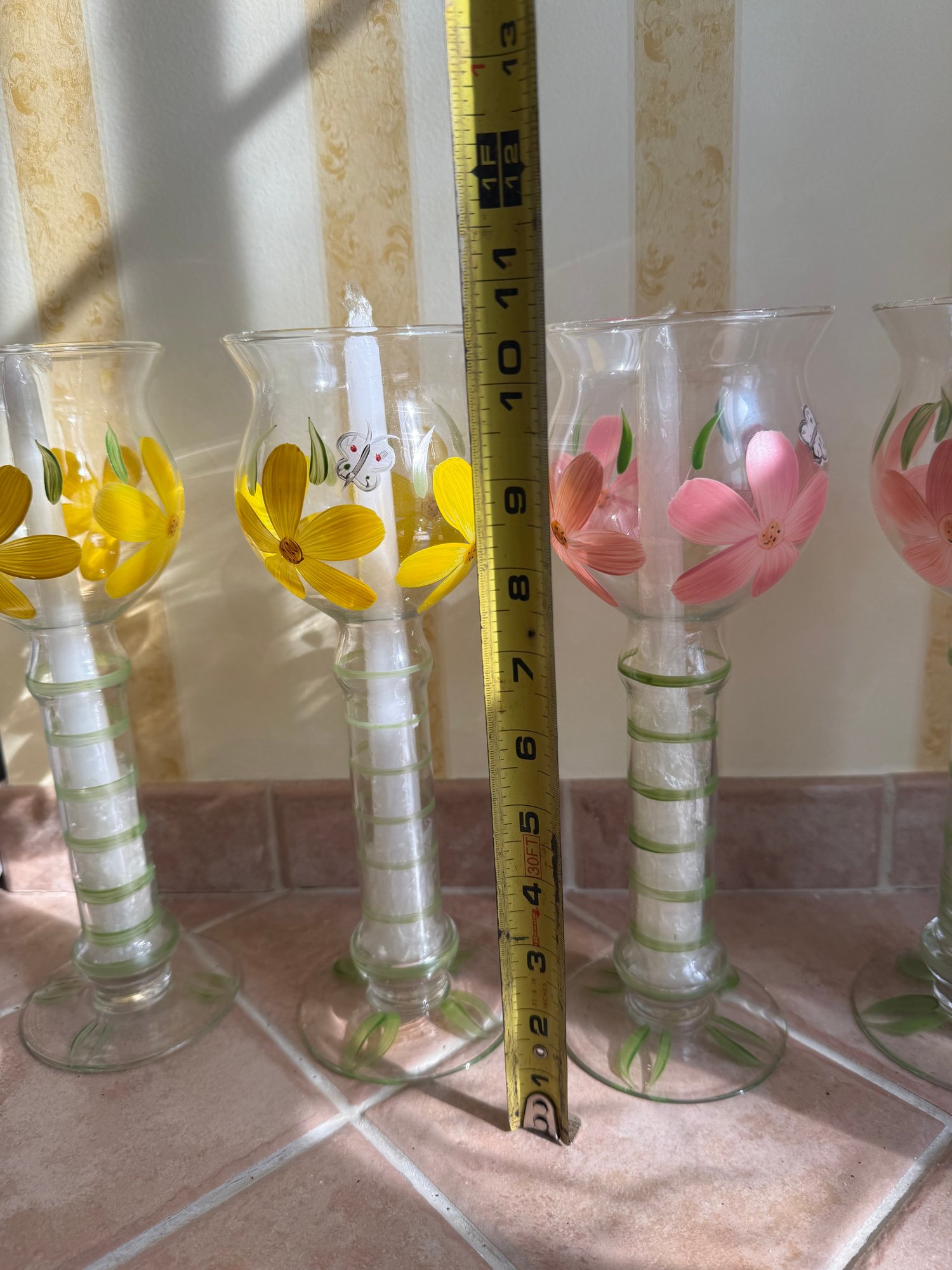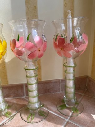 Set Of Four Vintage Hand-painted Floral Glass Hurricane Candle Holders
