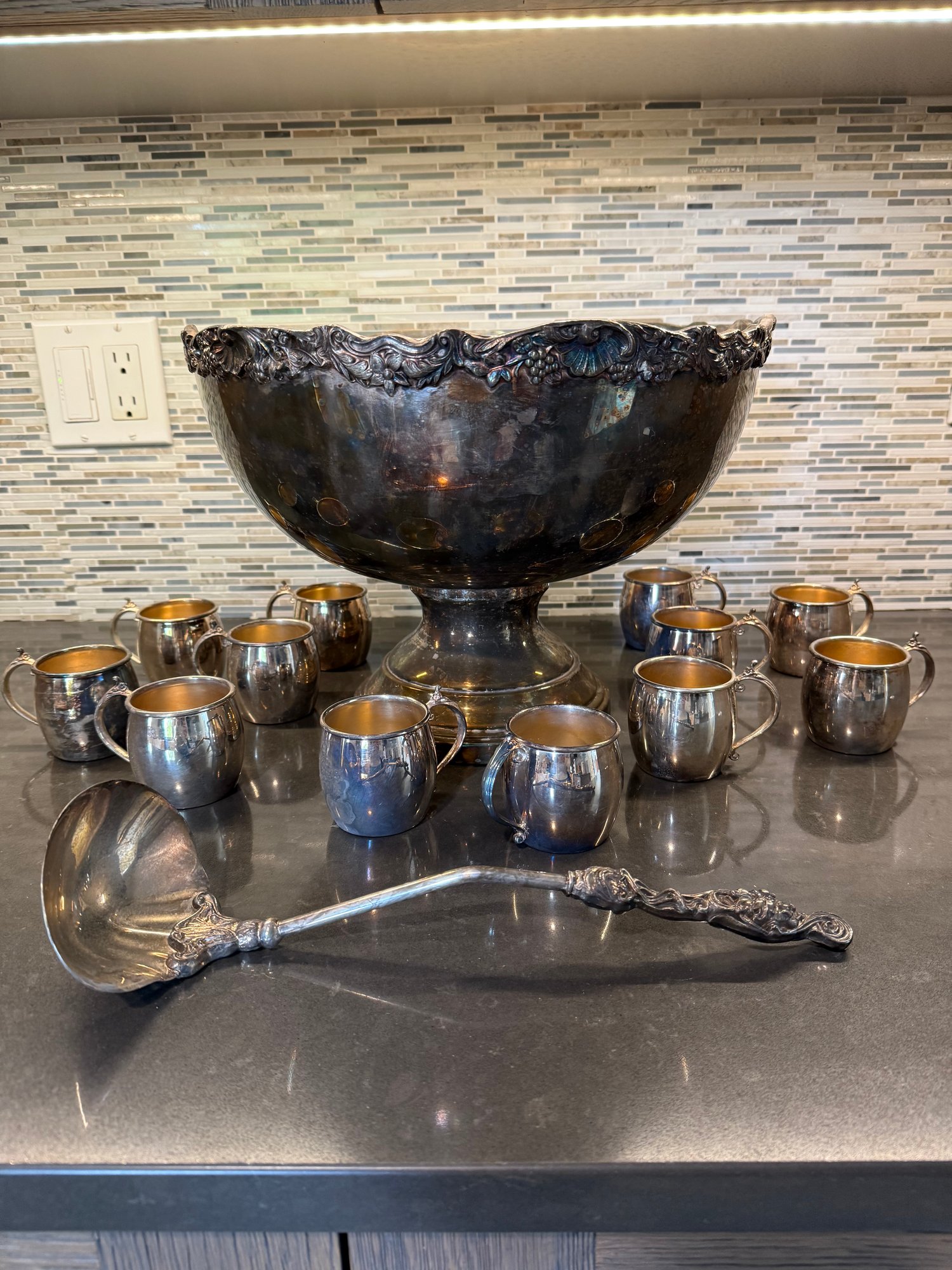 Silver Plate Punch Bowl, Cups And Ladle.