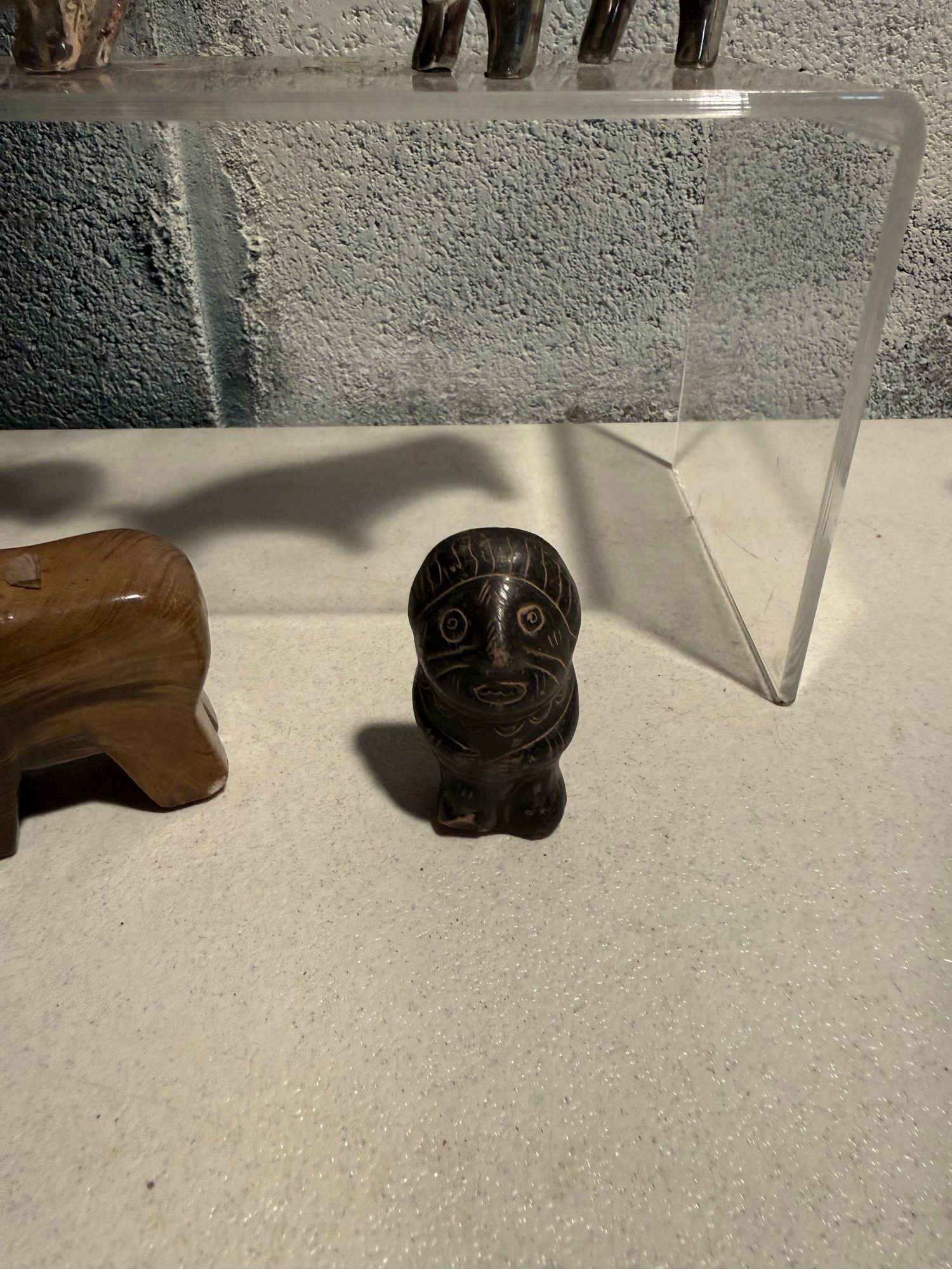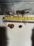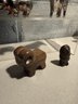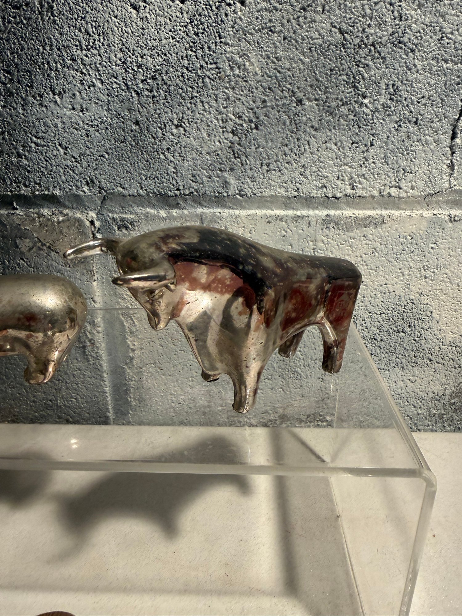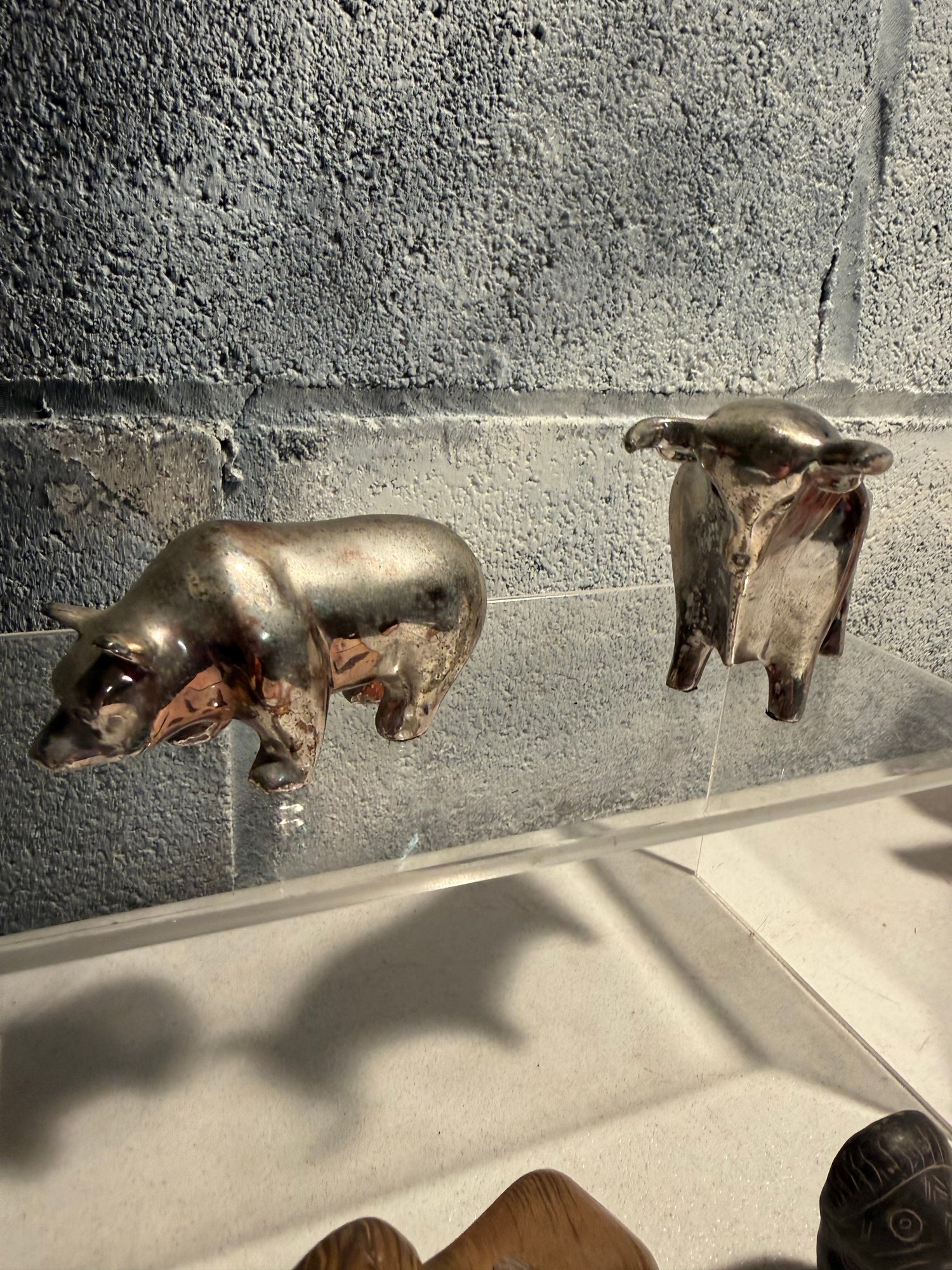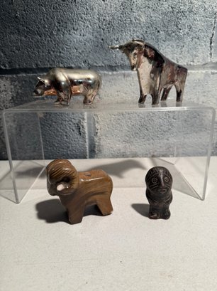 Stylized Chrome Bull/bear Figurine, Tano Stone Zem Figure & Wood Glazed Ram