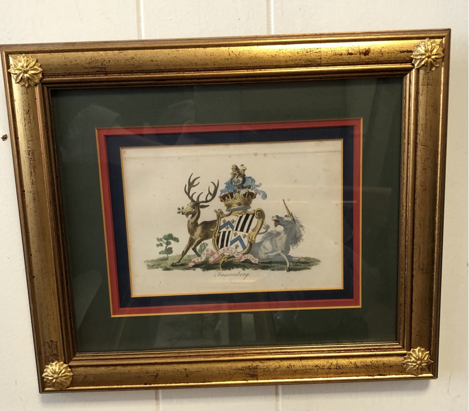 Distressed Gilt Framed with Hand Gilded Metal Leaf Rosettes.