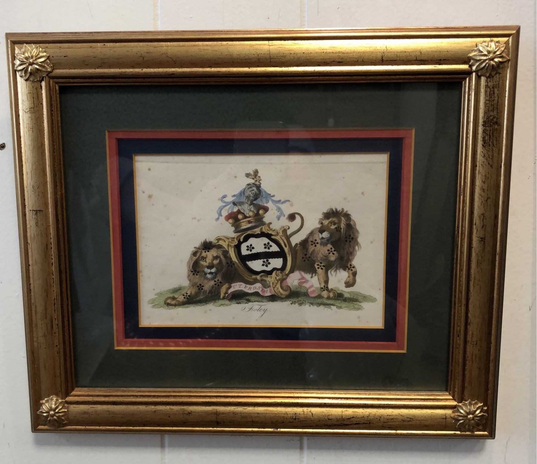 Distressed Gilt Framed with Hand Gilded Metal Leaf Rosettes.