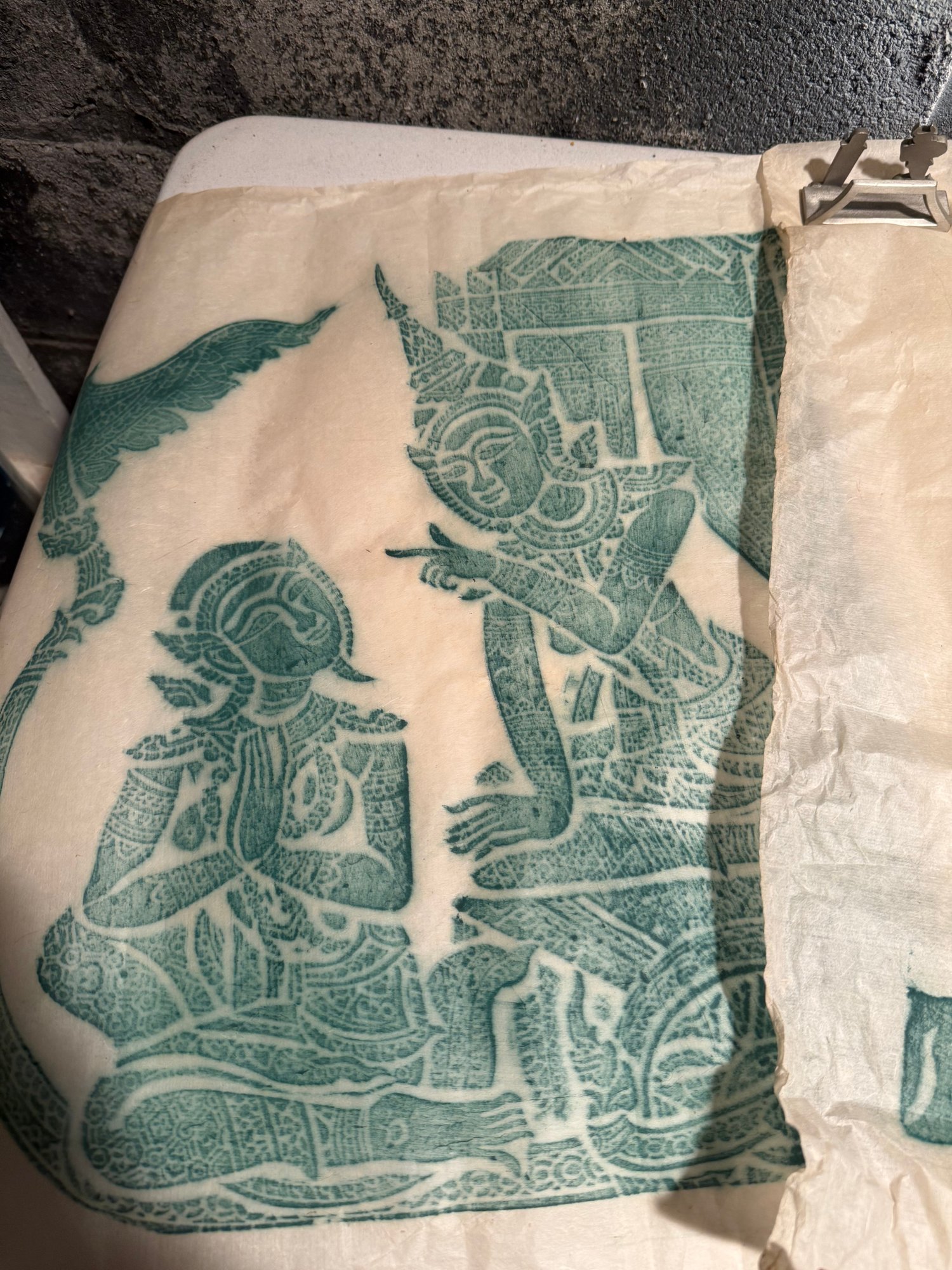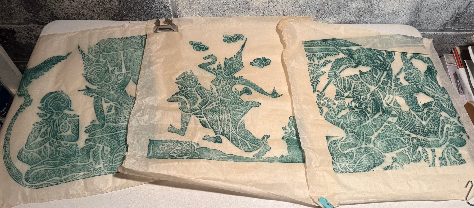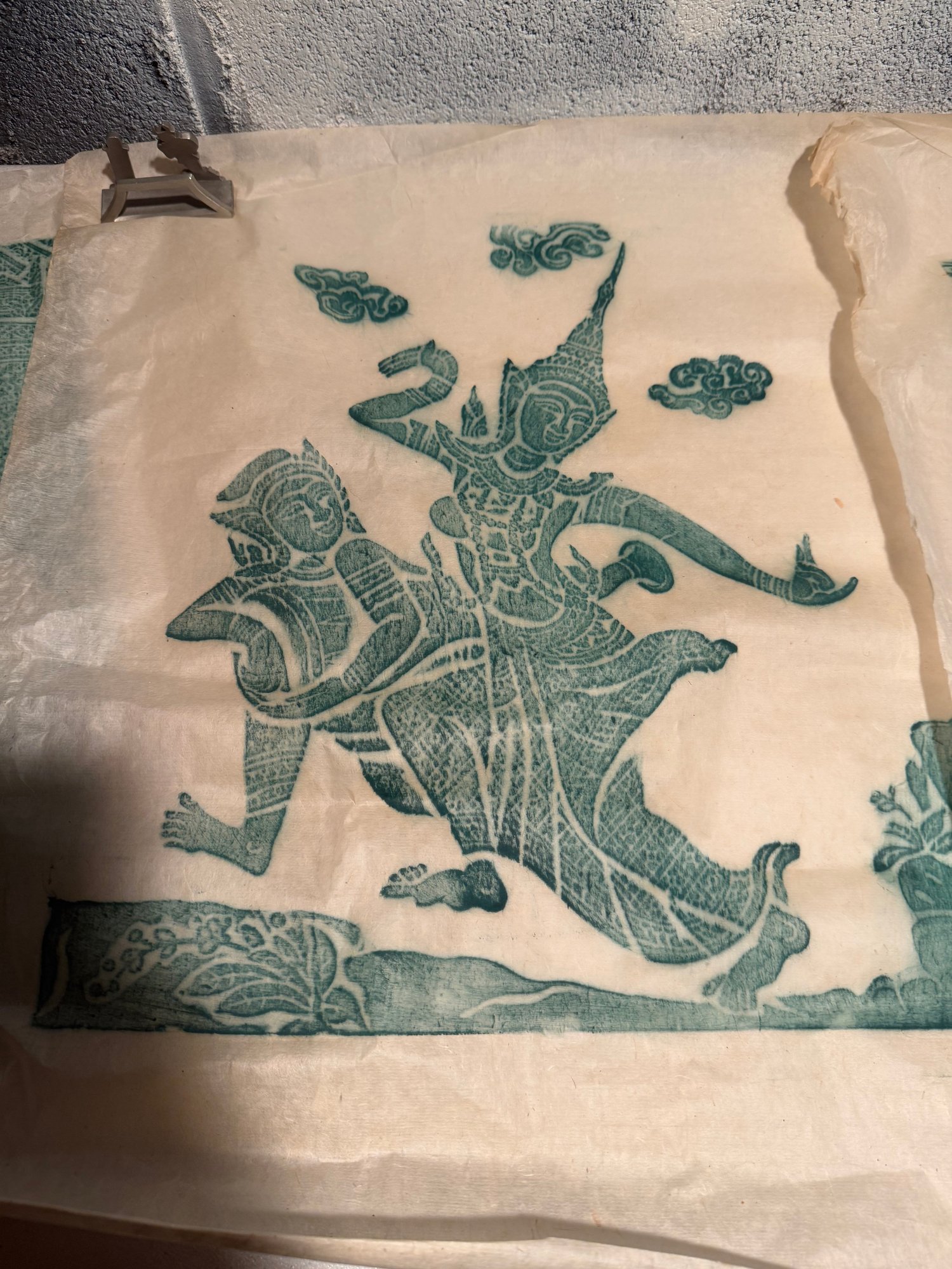 Traditional Southeast Asian Temple Rubbings On Rice Paper With Green Pigment