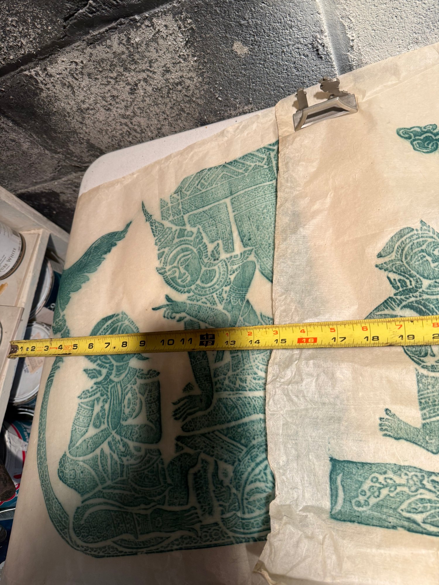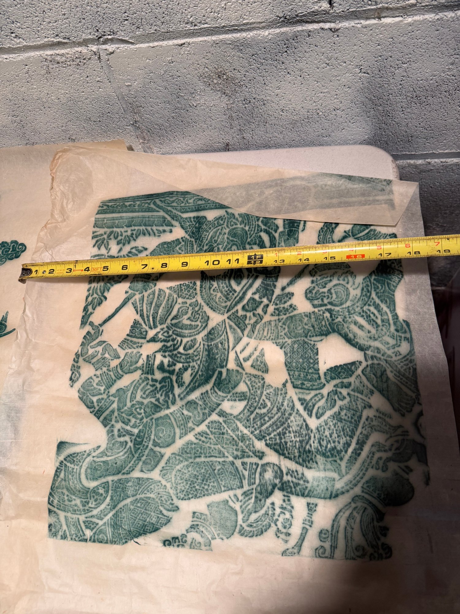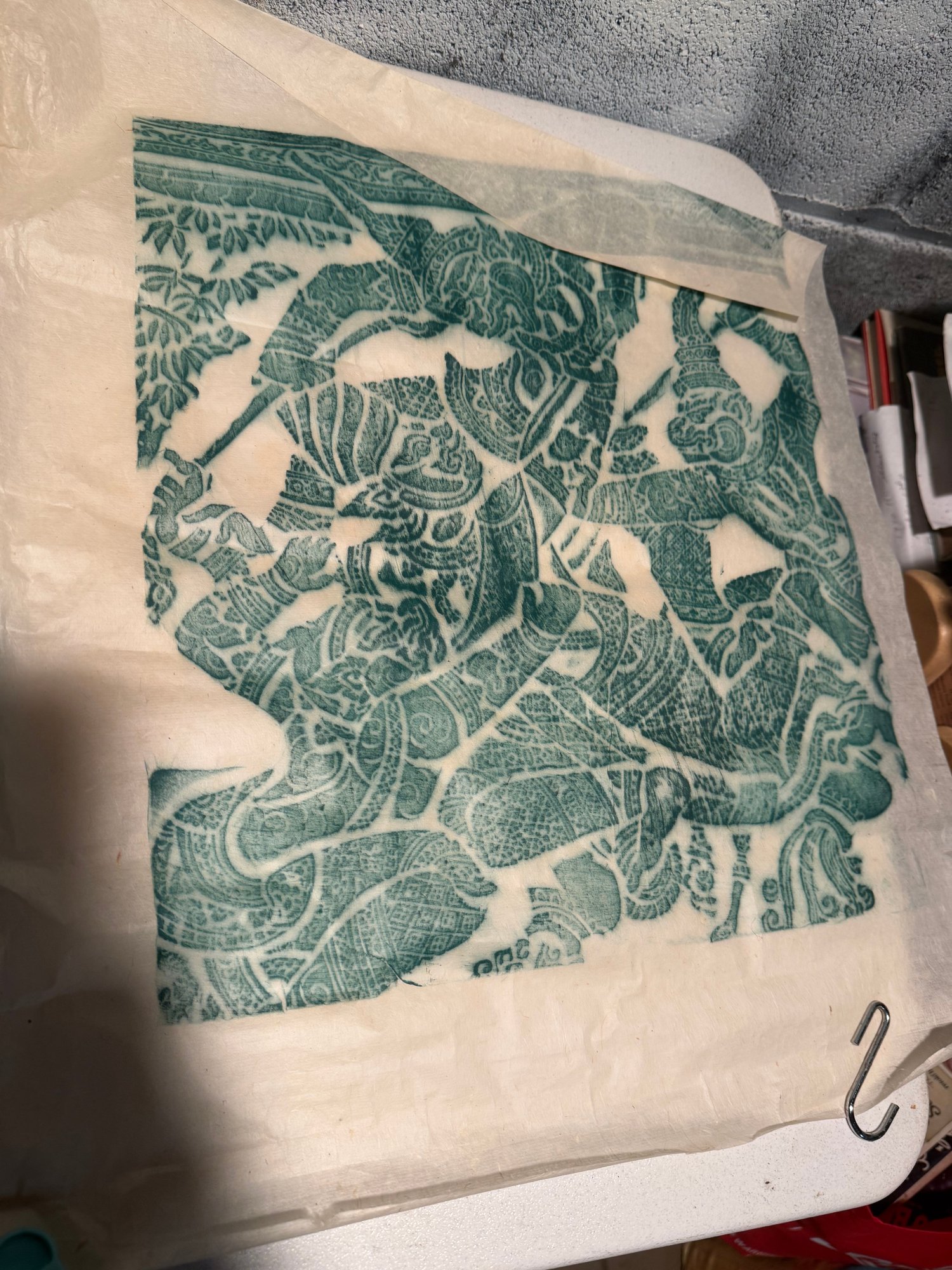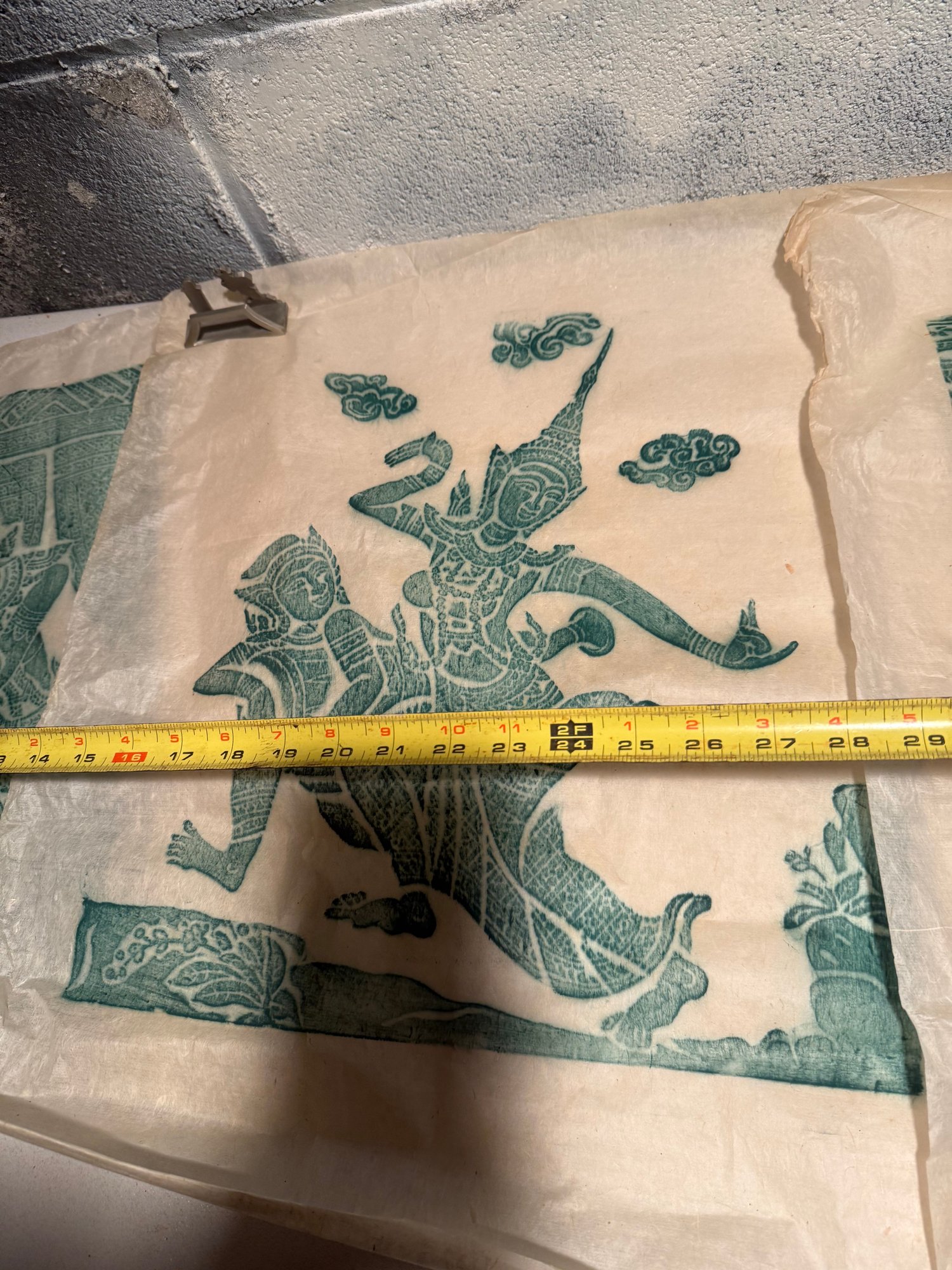 Traditional Southeast Asian Temple Rubbings On Rice Paper With Green Pigment