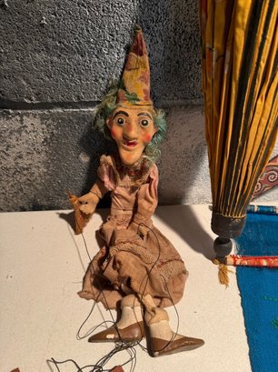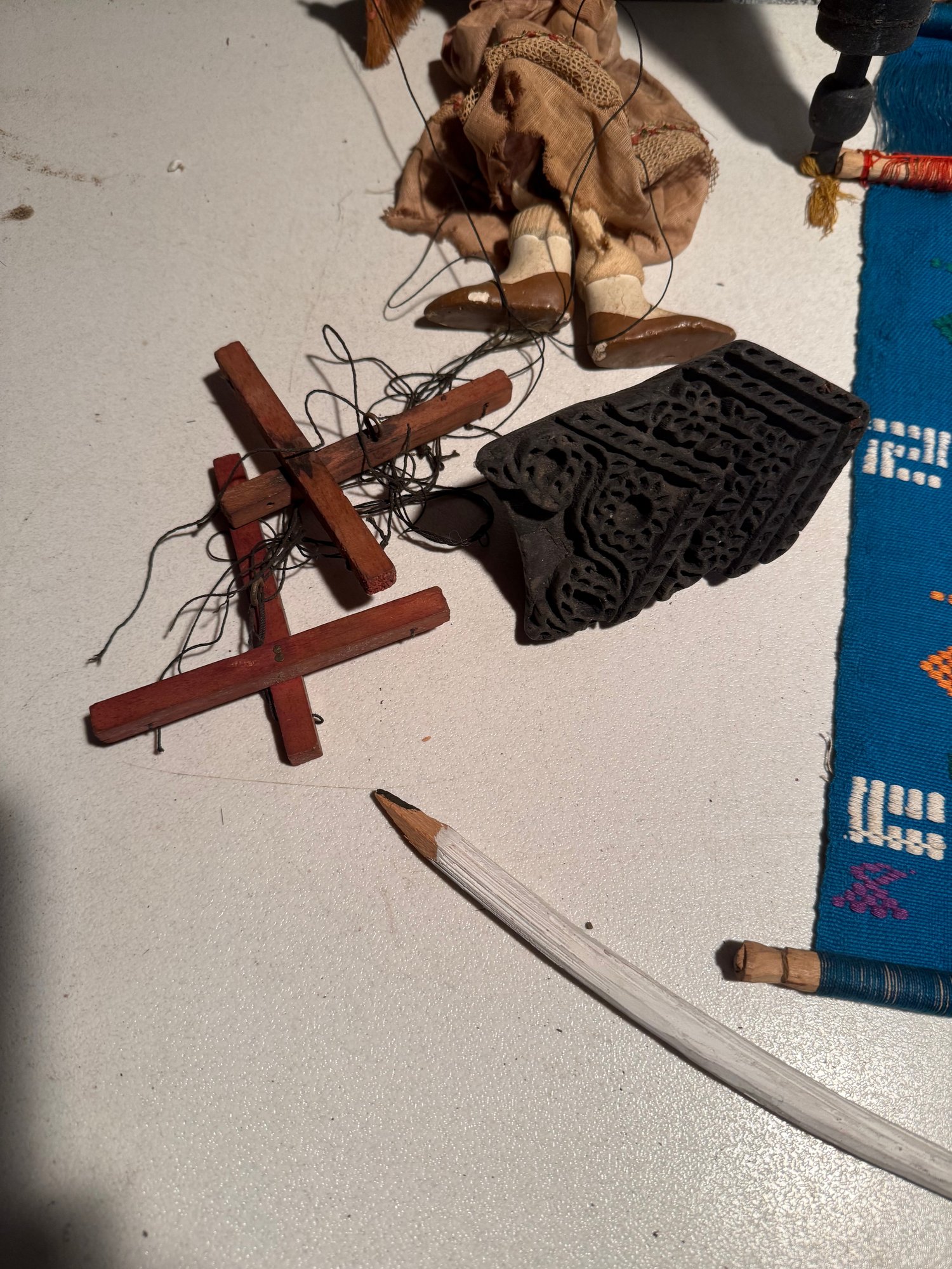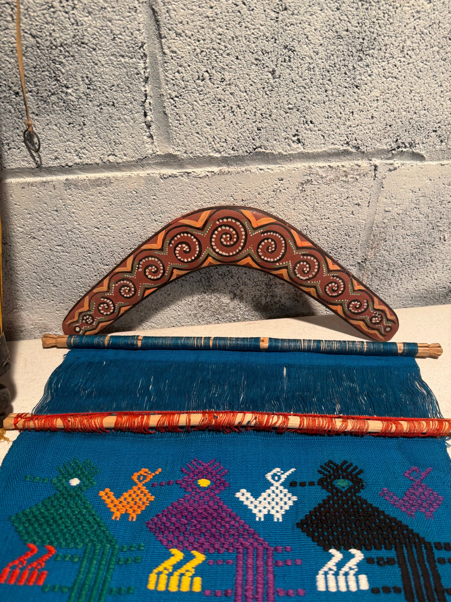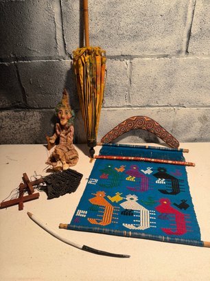 Guatemalan Textile Wall Hanging, Marionette Puppet, Boomerang, Parasol, Wooden Stamp, & Carved Pencil