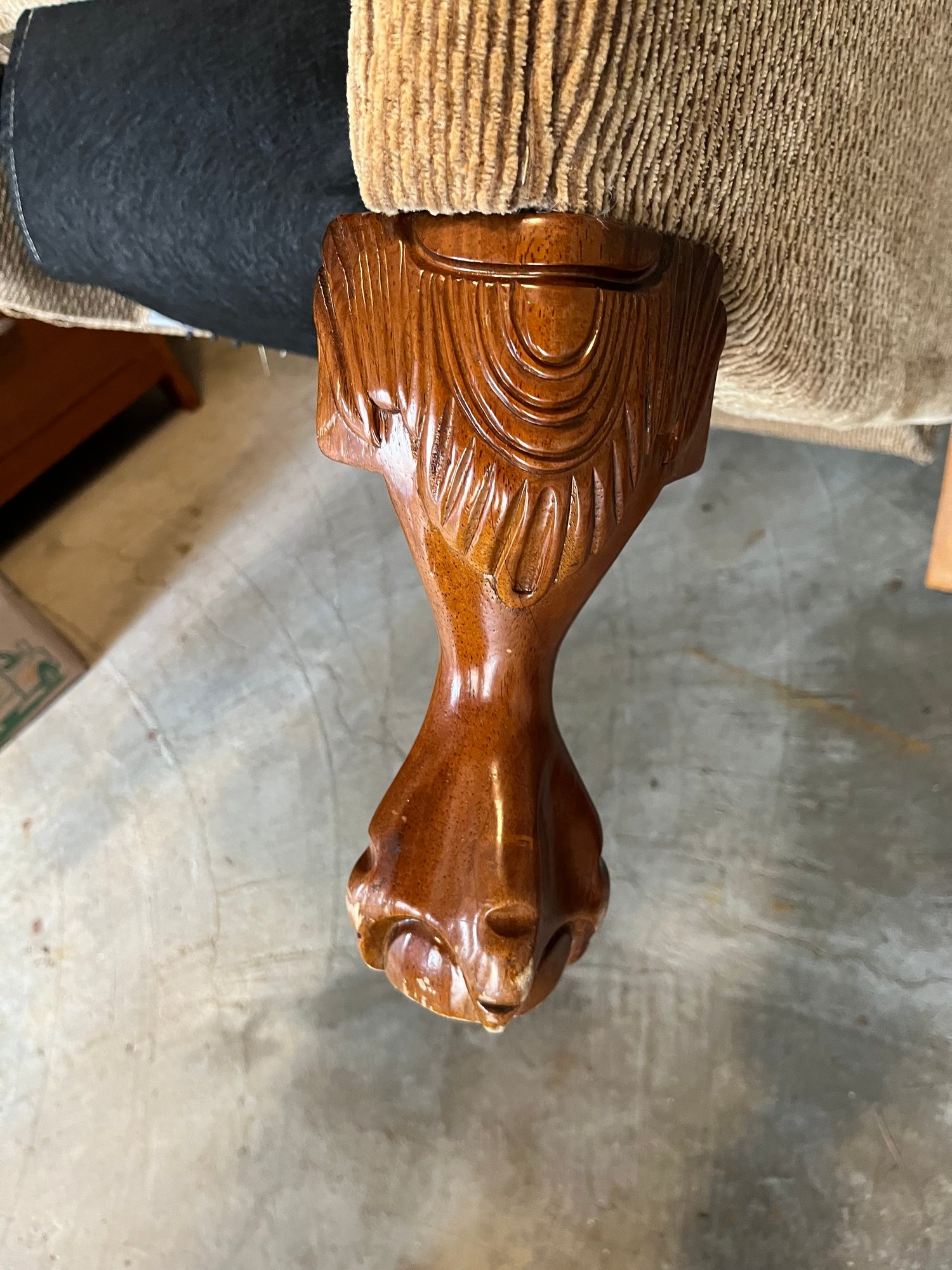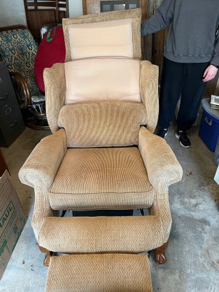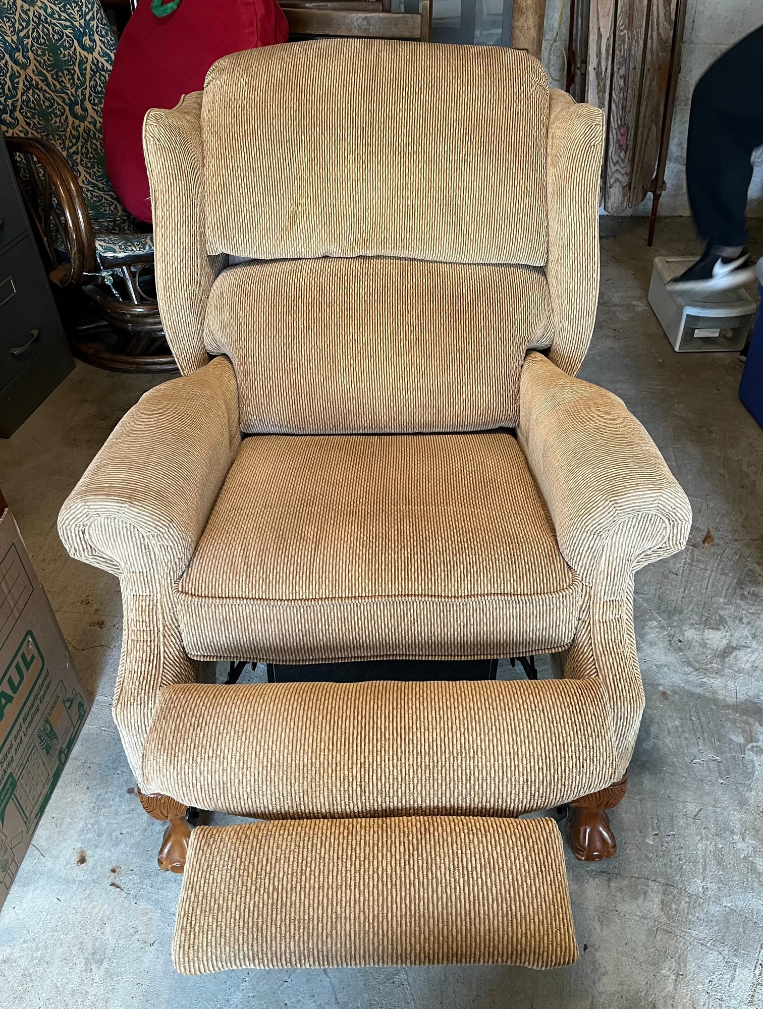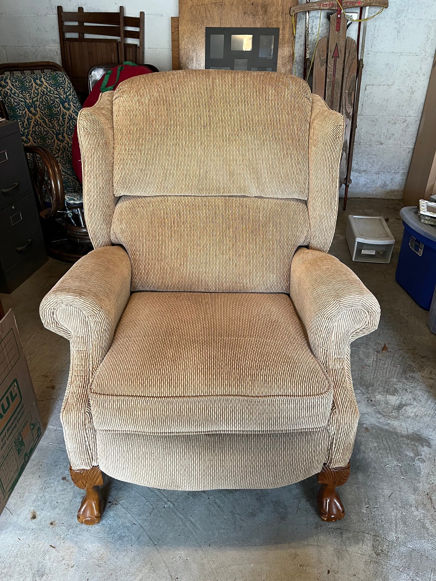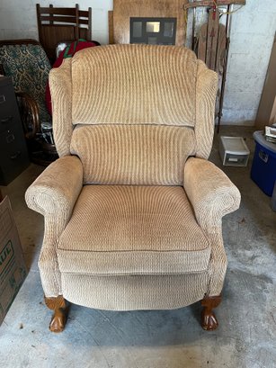 Upholstered Recliner Chair With Carved Wooden Feet.