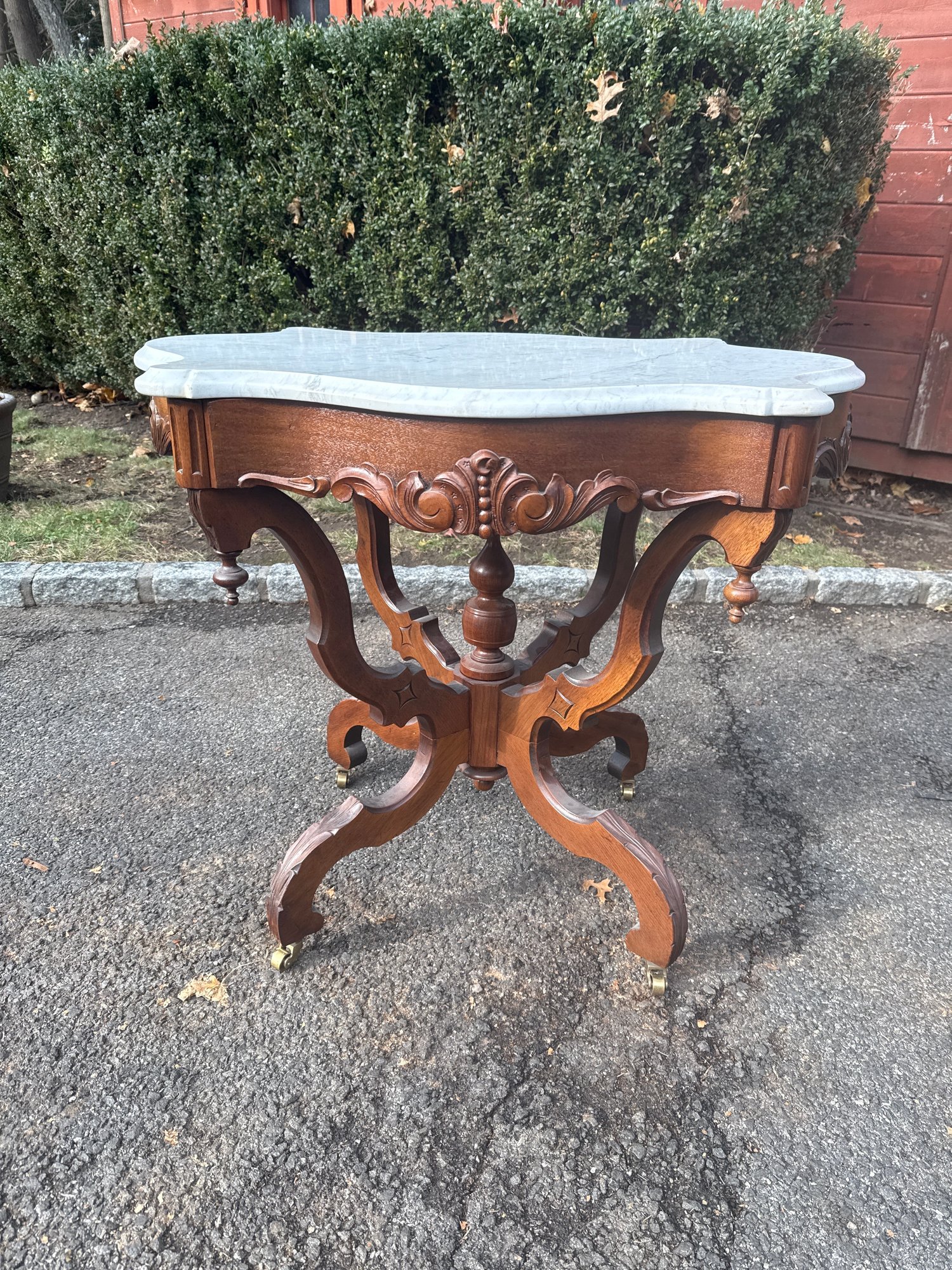 Victorian Rococo Carved Walnut Marble-top Turtle Table.