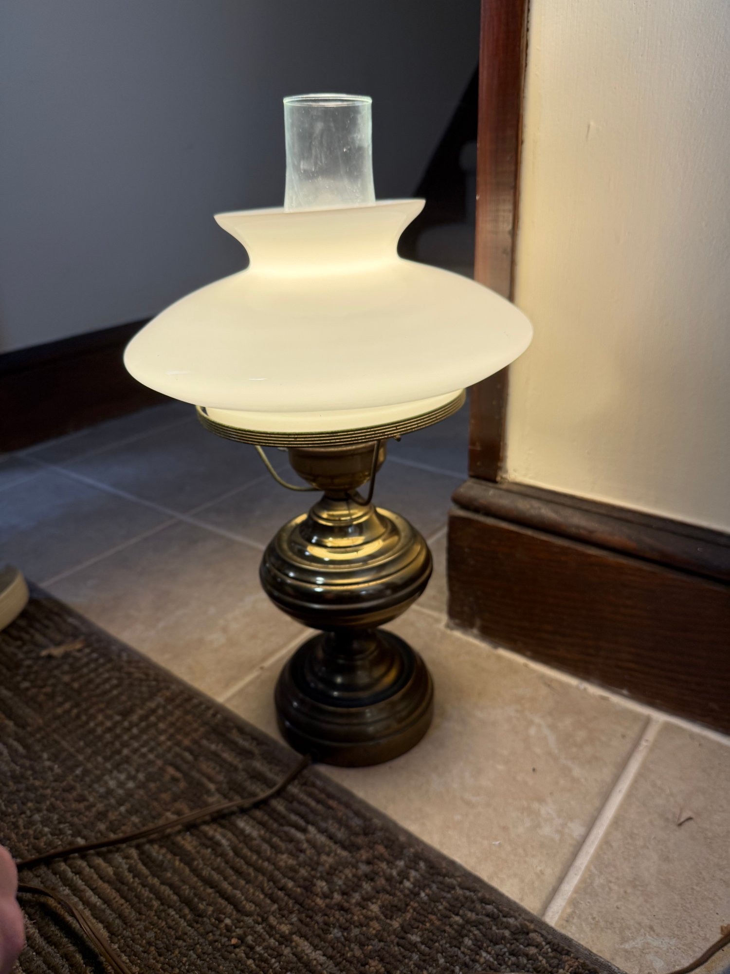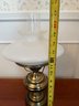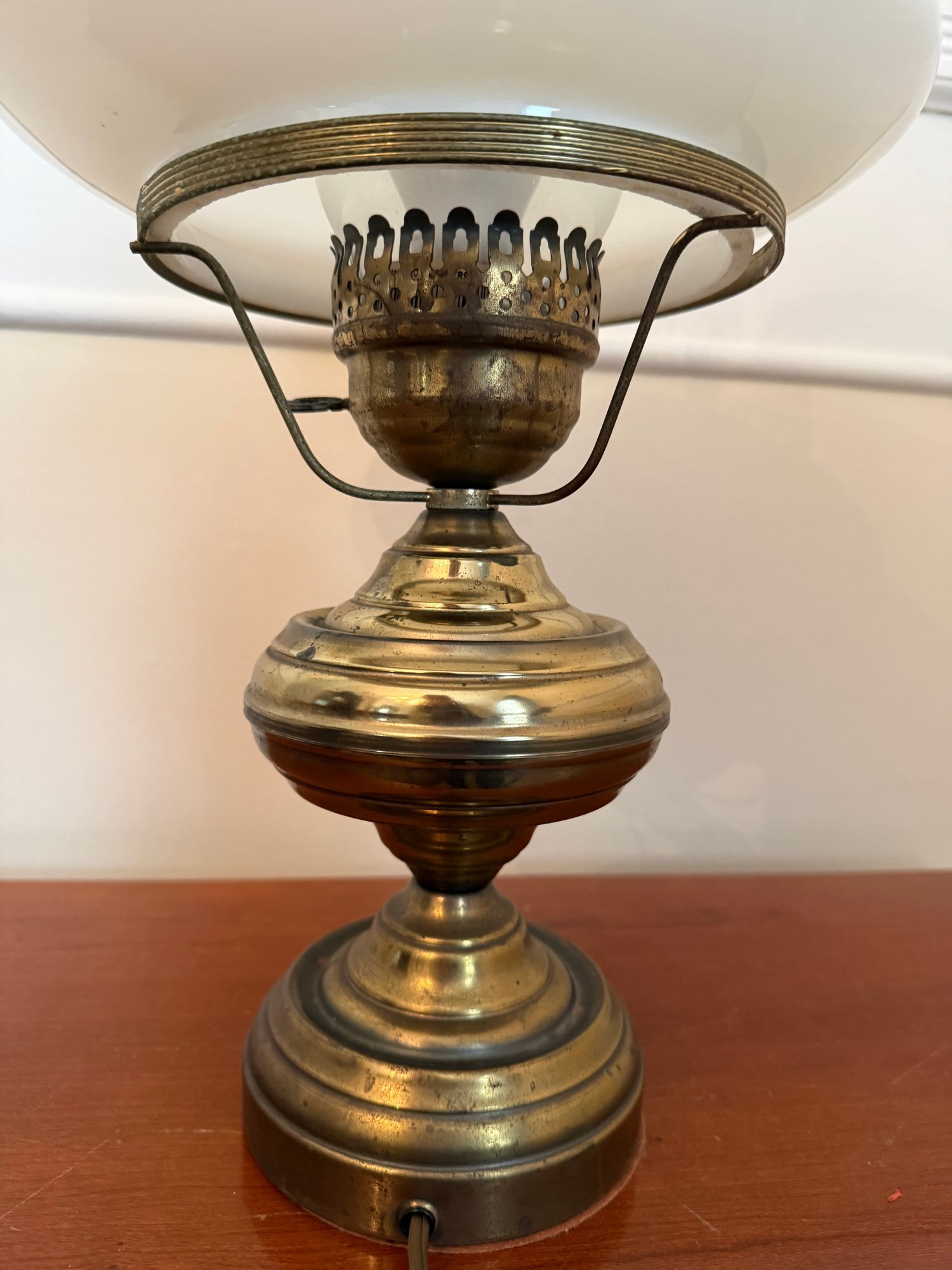 Vintage Brass Electric Lamp With Ribbed Base And Opal Glass Shade