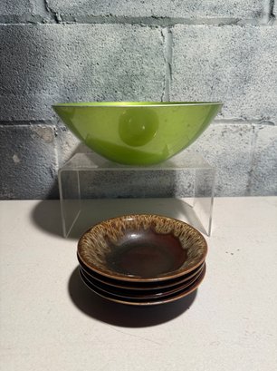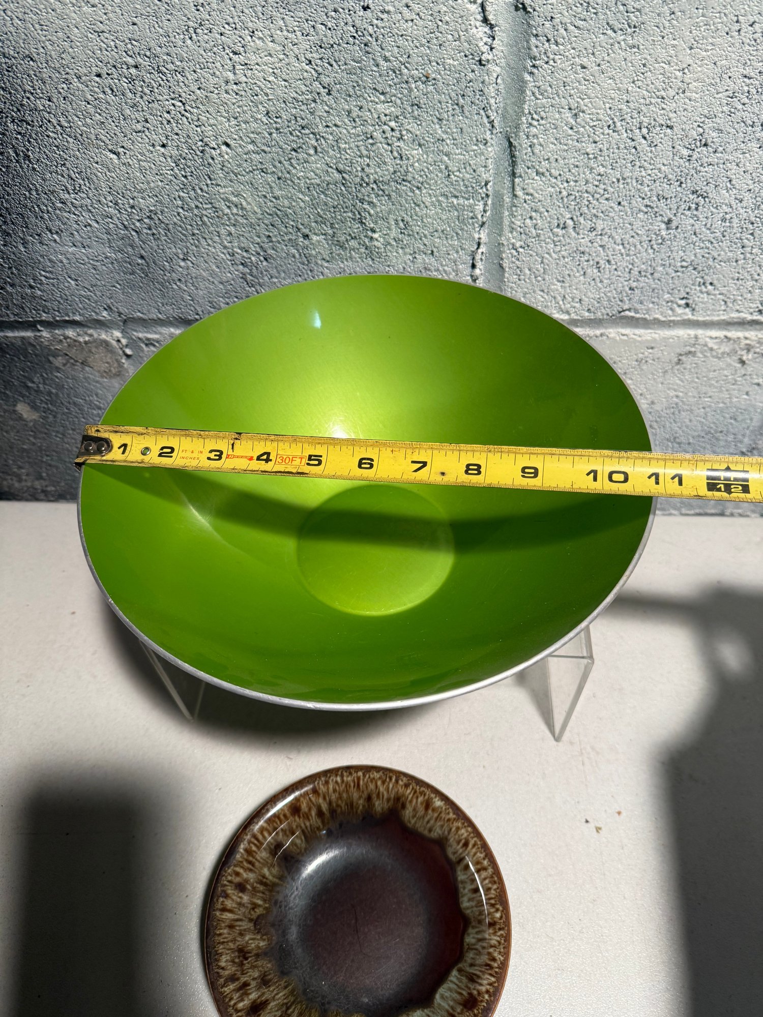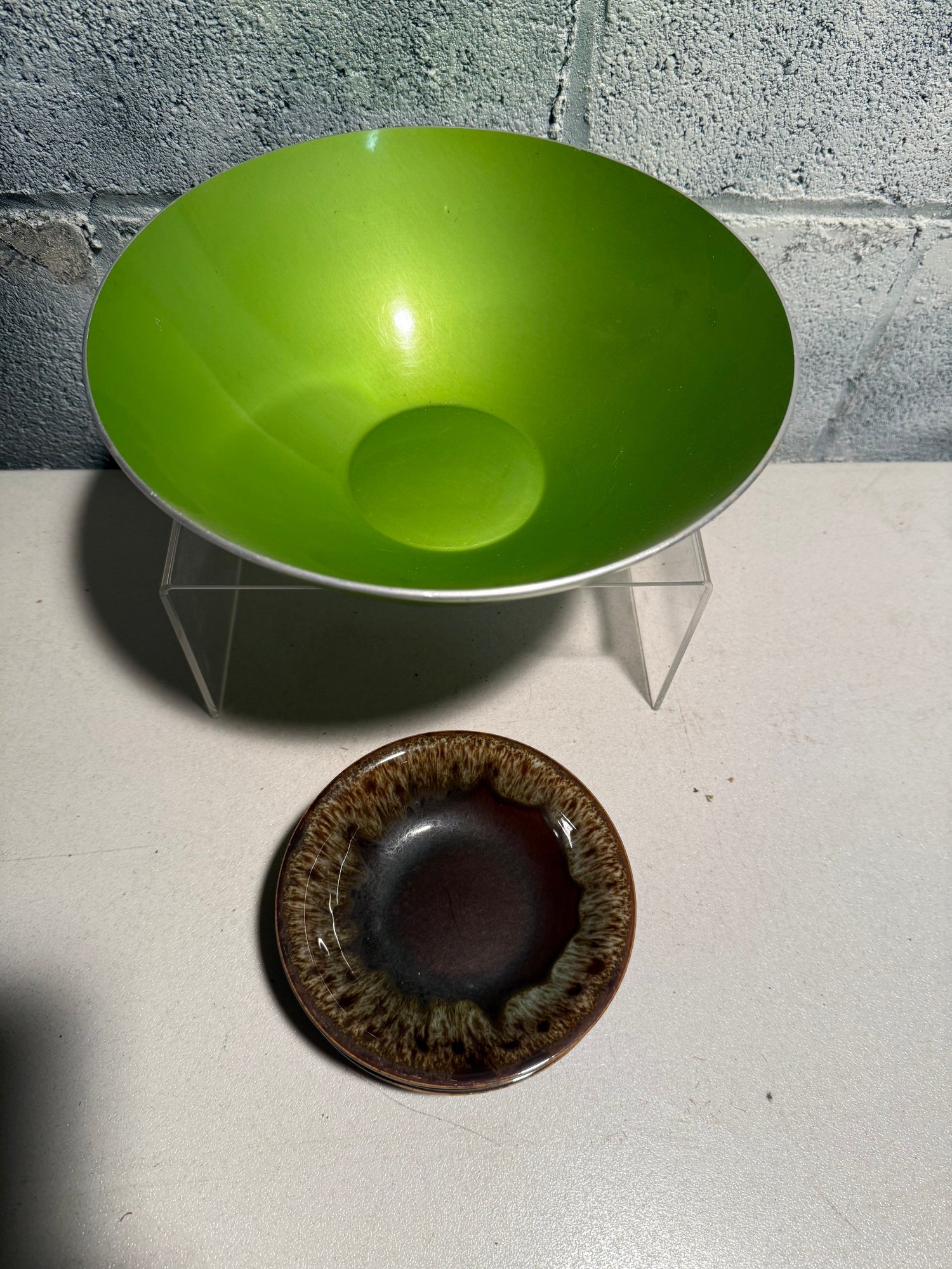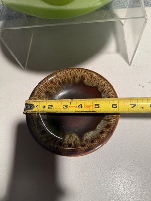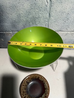 Vintage Ceramic Bowls, Likely Featuring A Brown Drip Glaze Pattern & Vibrant Lime Green Enamel Bowl