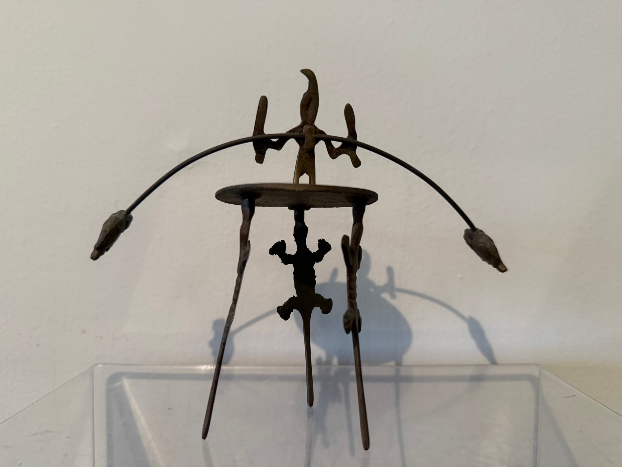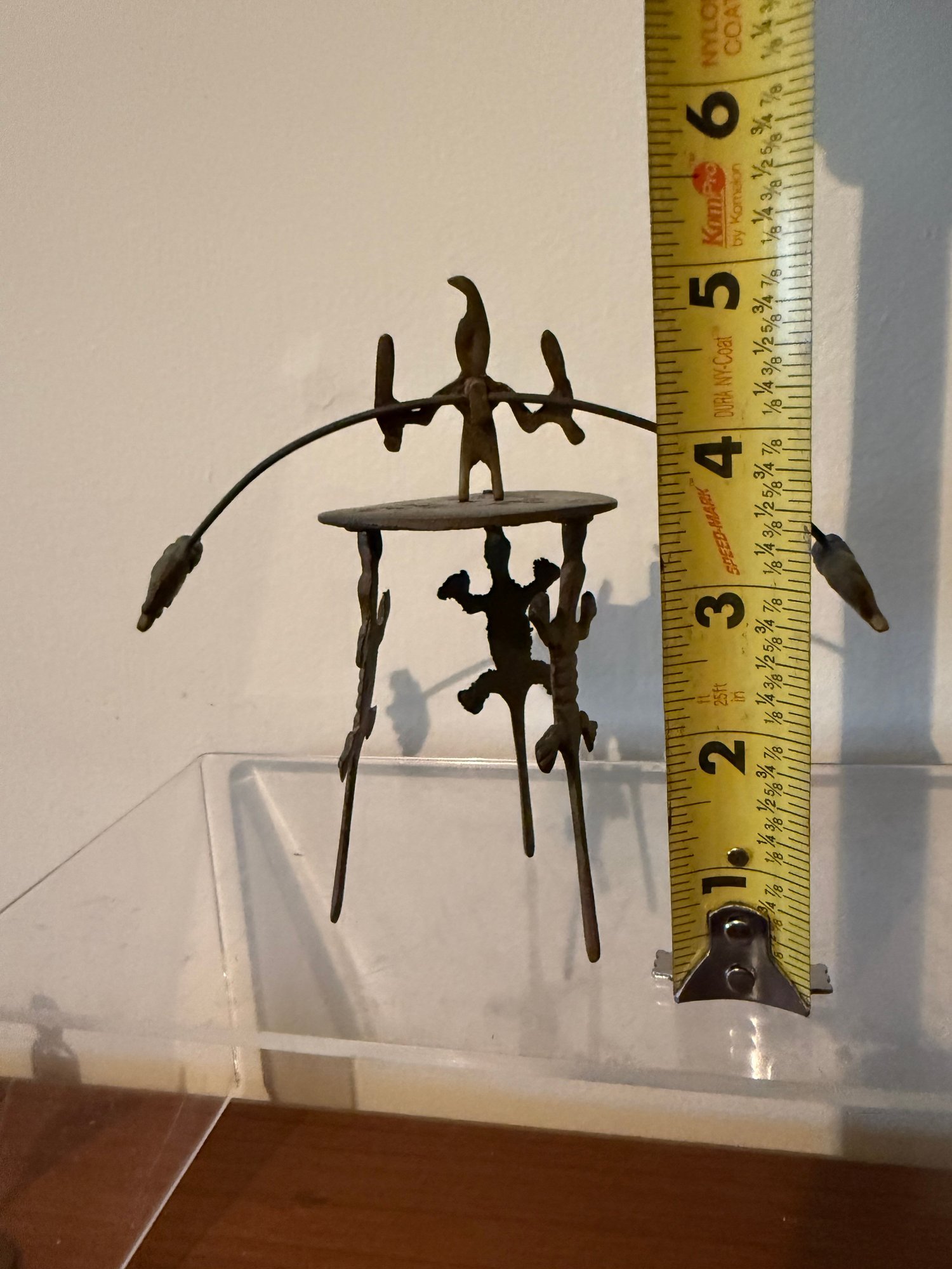 Vintage Folk Art Brass Balancing Sculpture With Human And Alligator Figures.