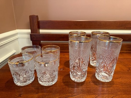 Vintage Gold-rimmed Cut Glass Tumblers And Rocks Glasses