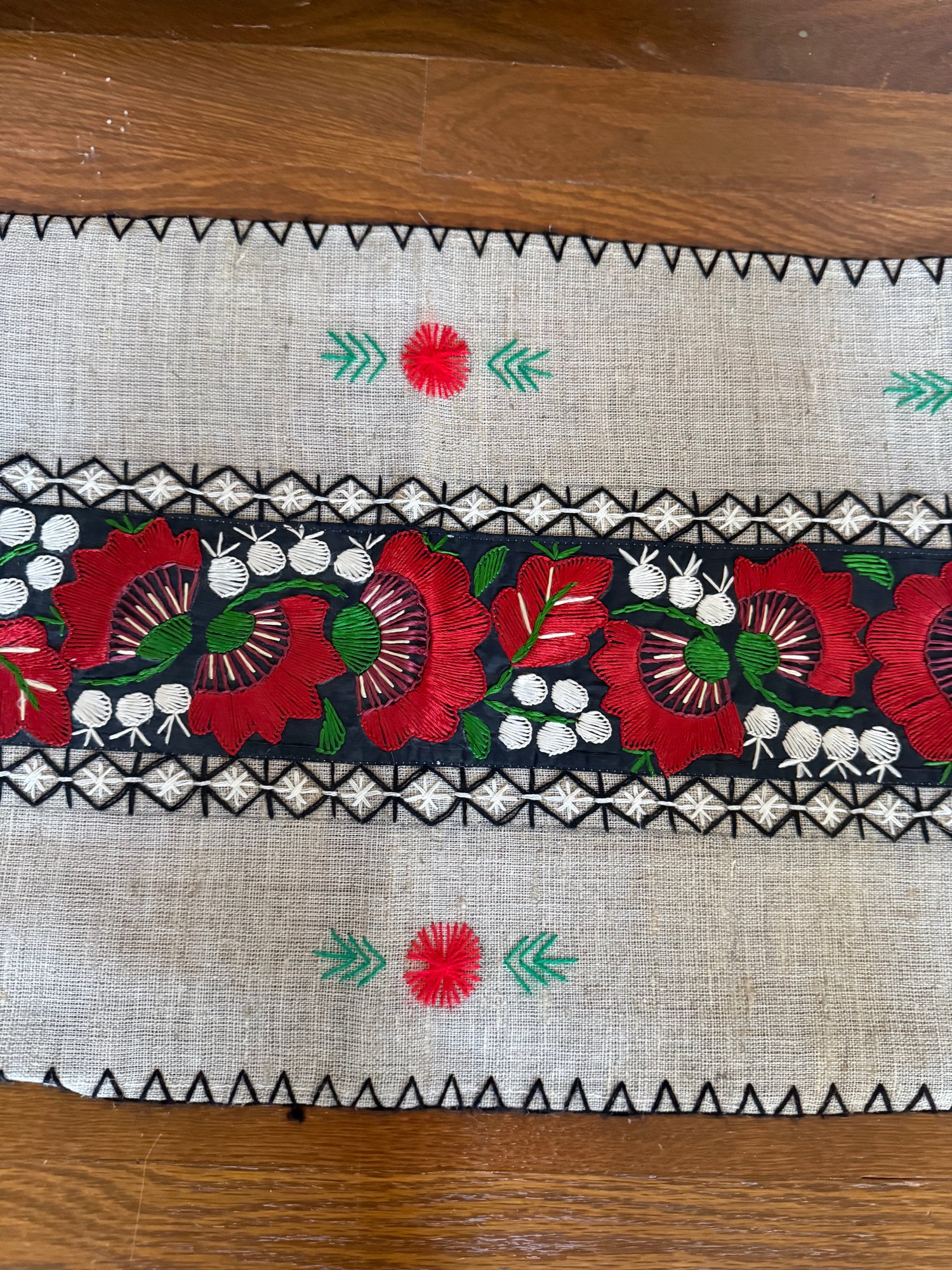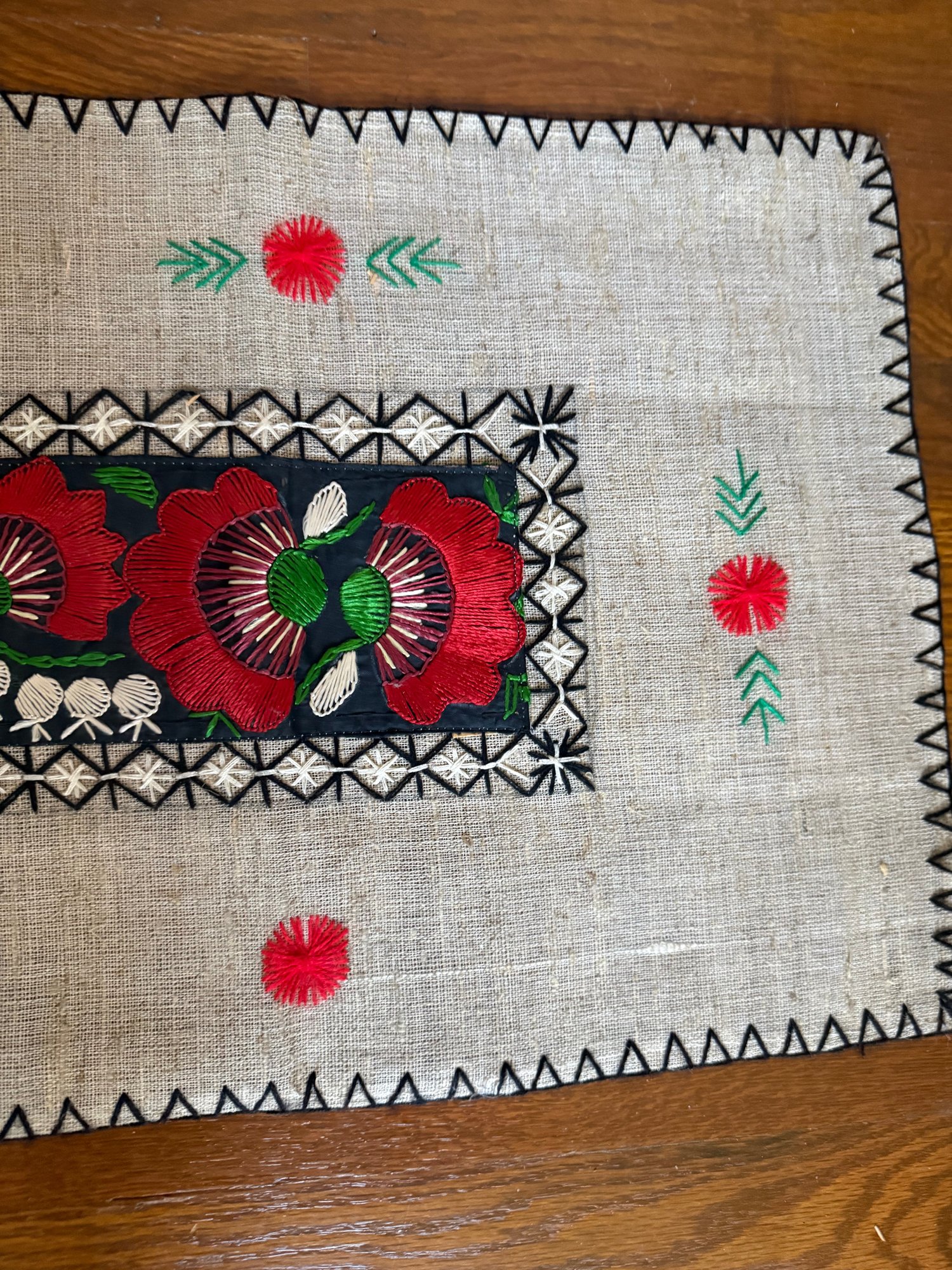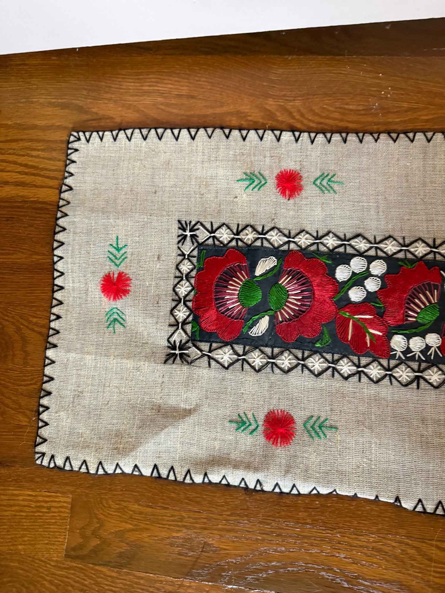 Vintage Hungarian Hand-embroidered Linen Table Runner With Floral Motifs
