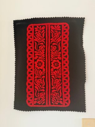 Vintage Hungarian Red And Black Felt Applique Textile With Floral Motifs