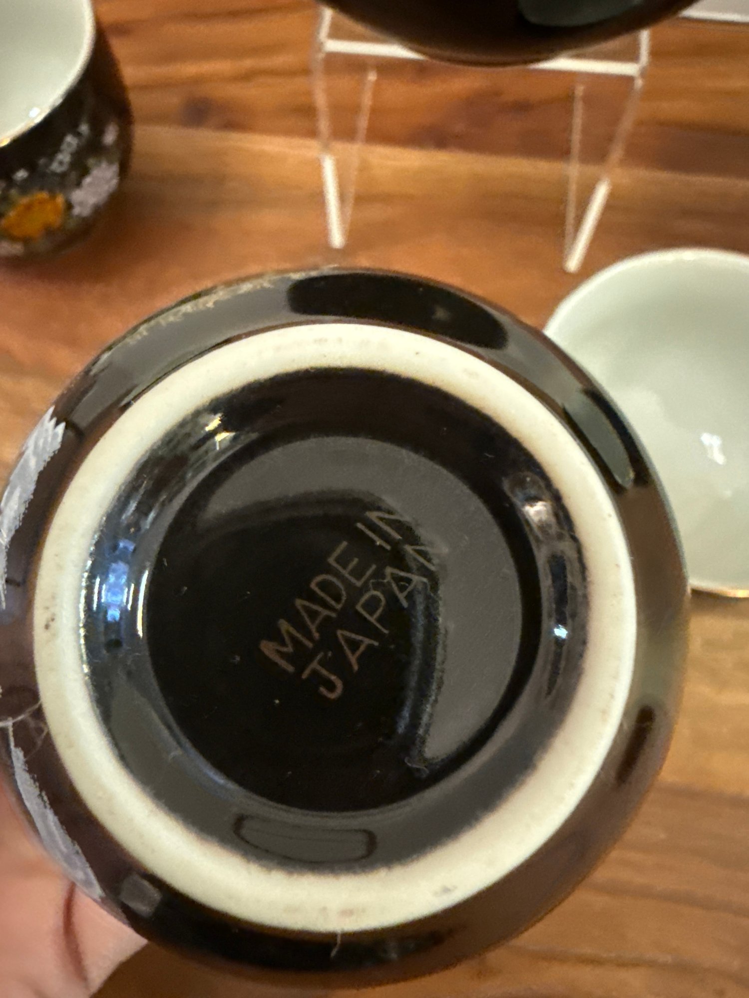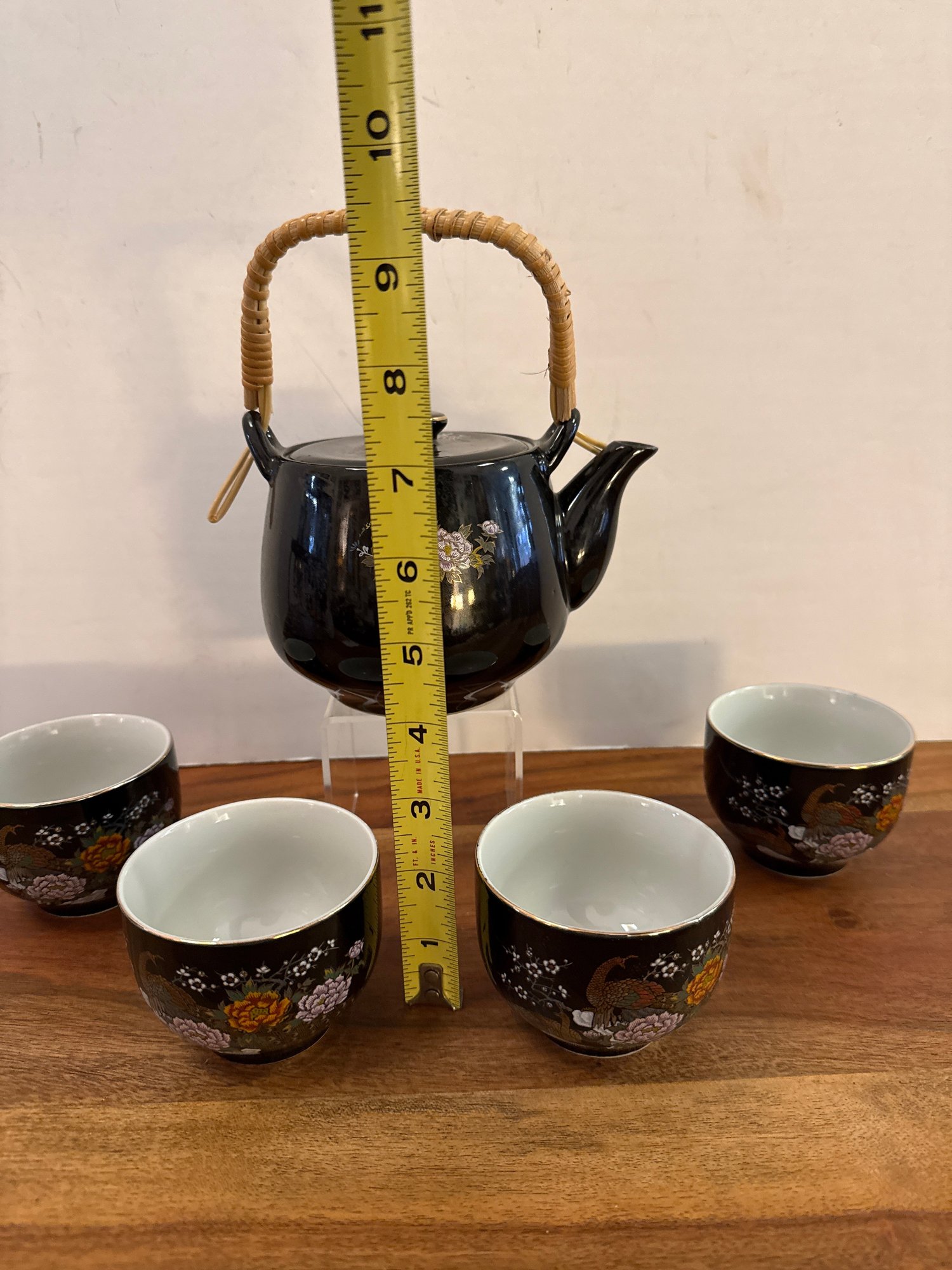 Vintage Japanese Black Porcelain Tea Set With Floral Motifs And Wicker Handle