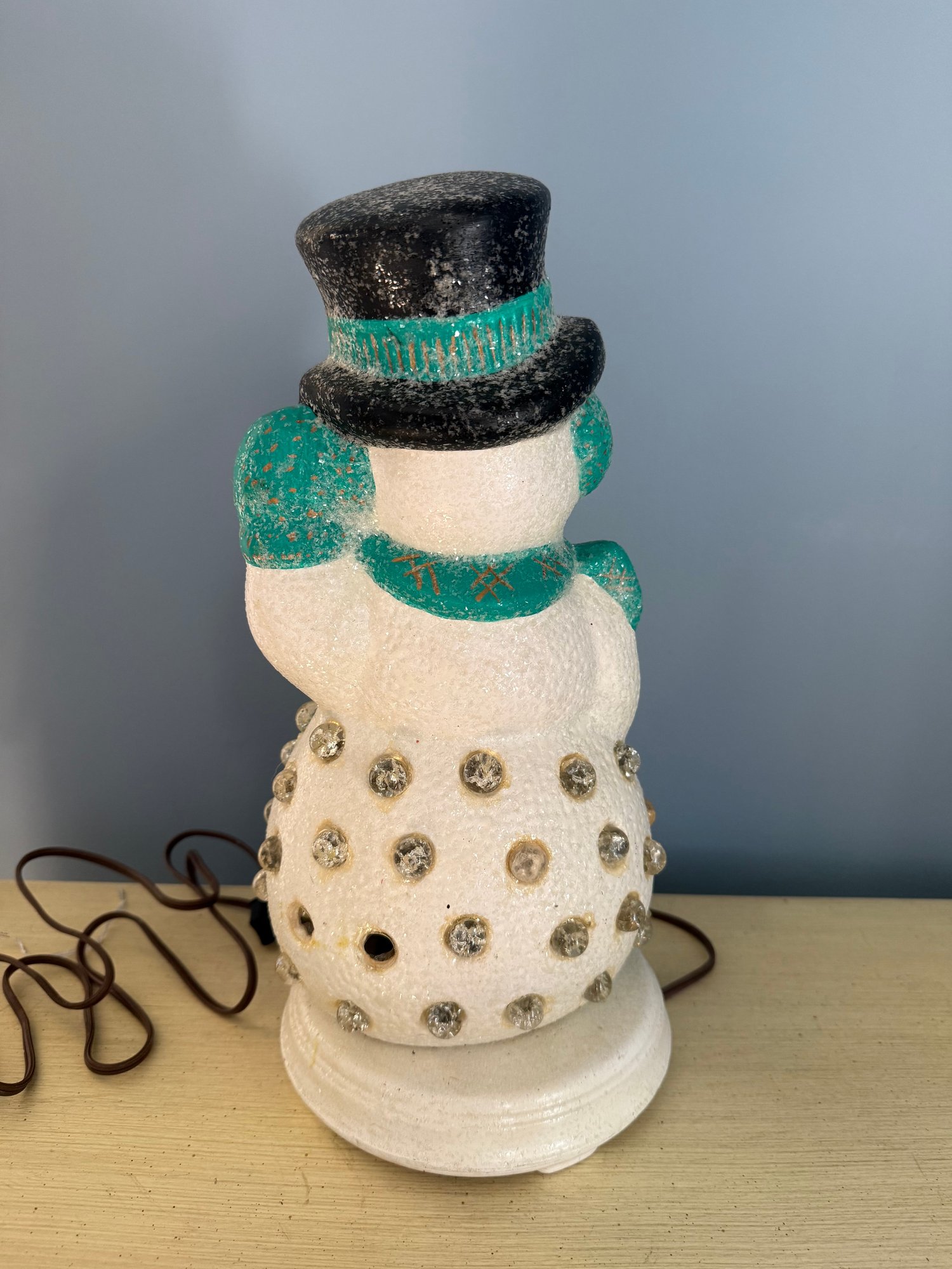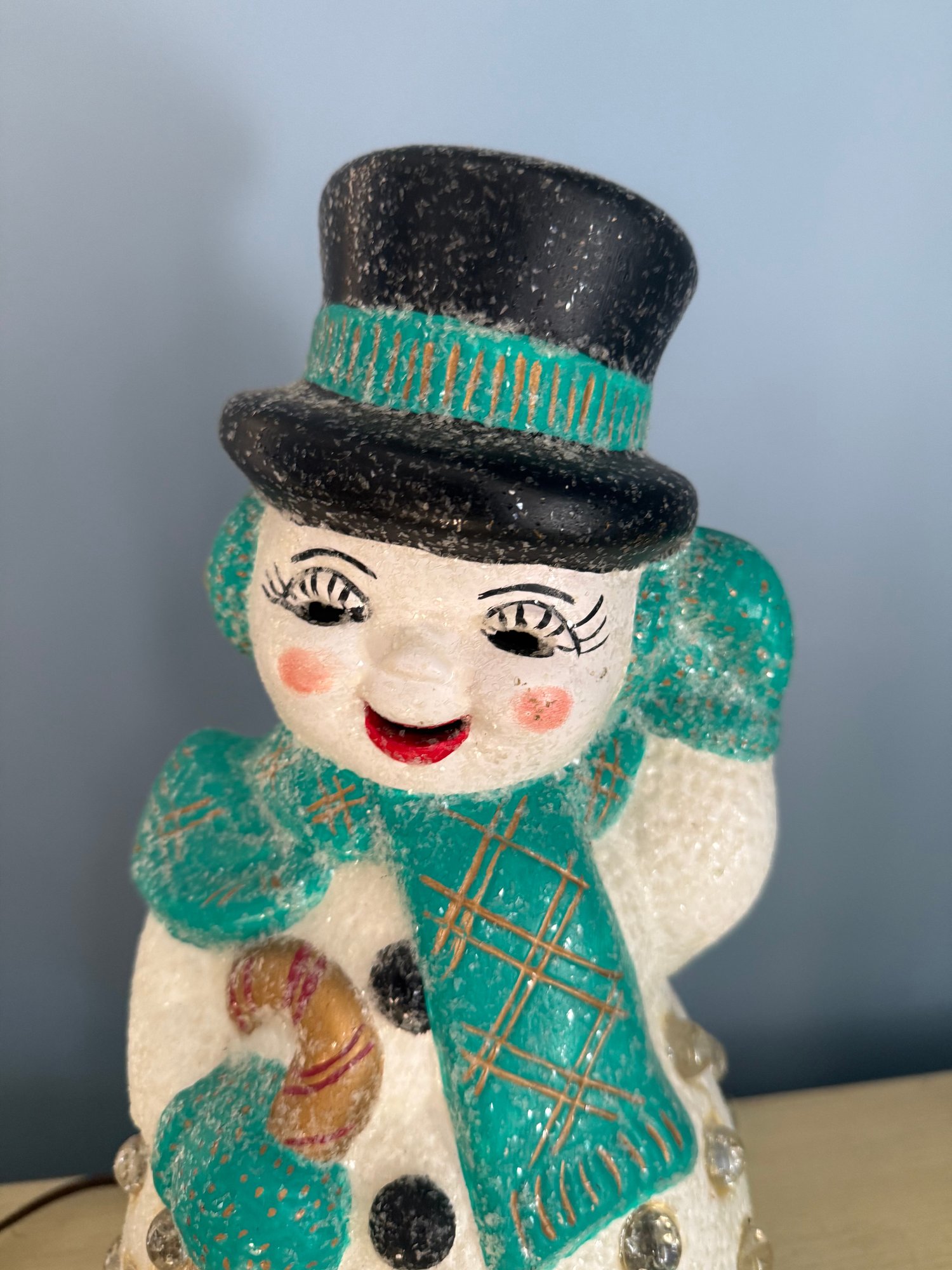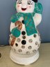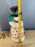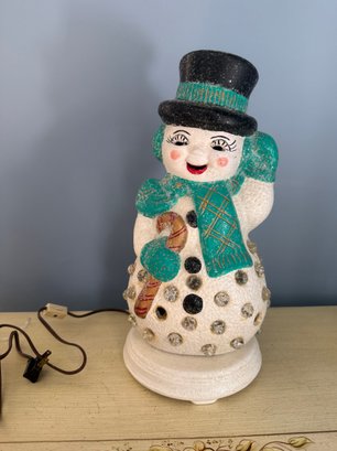 Vintage Lighted Ceramic Snowman With Glitter And Plastic Gem Accents