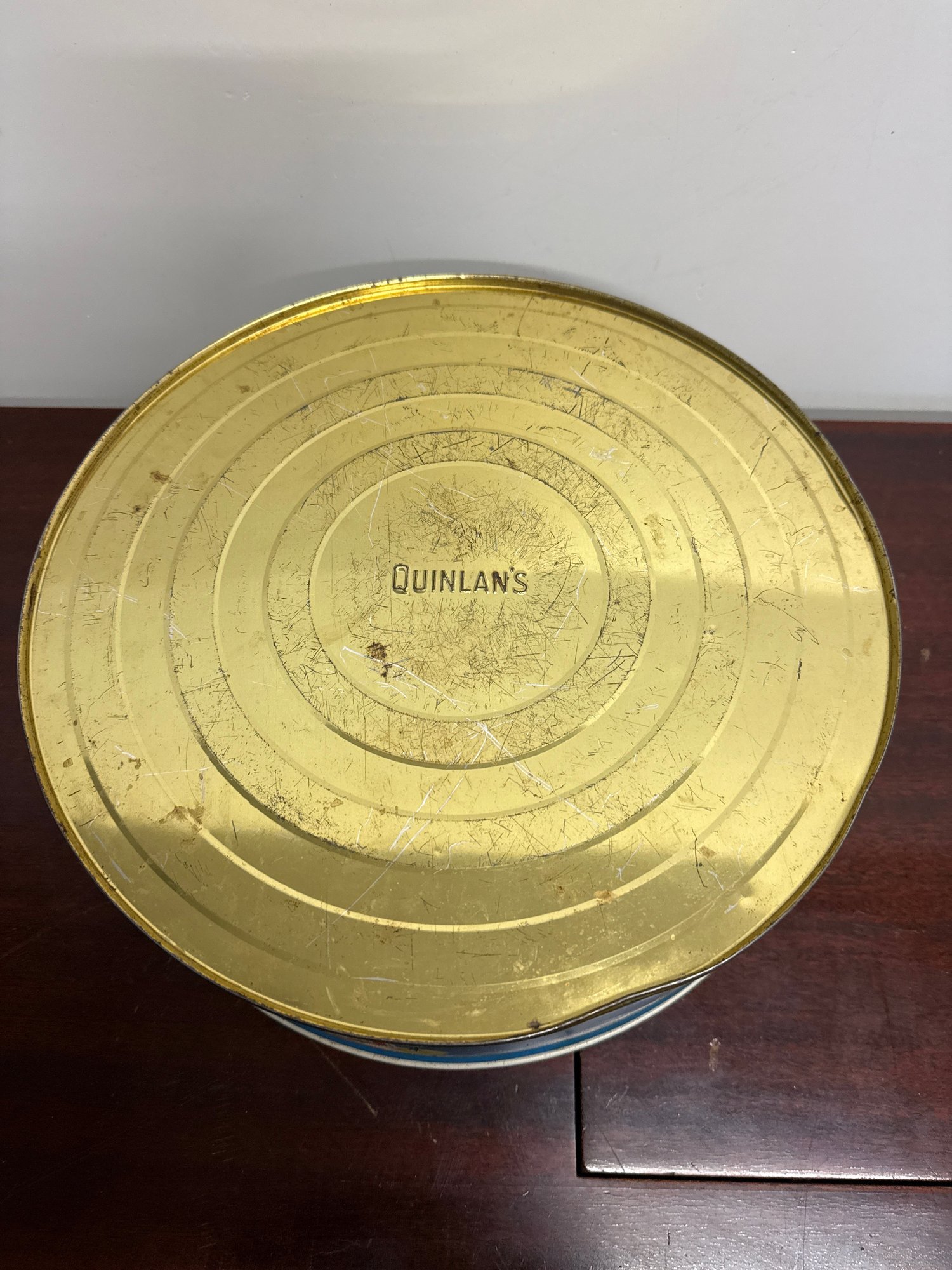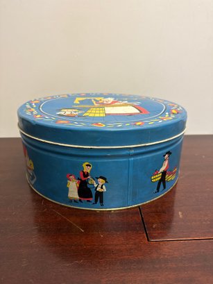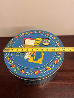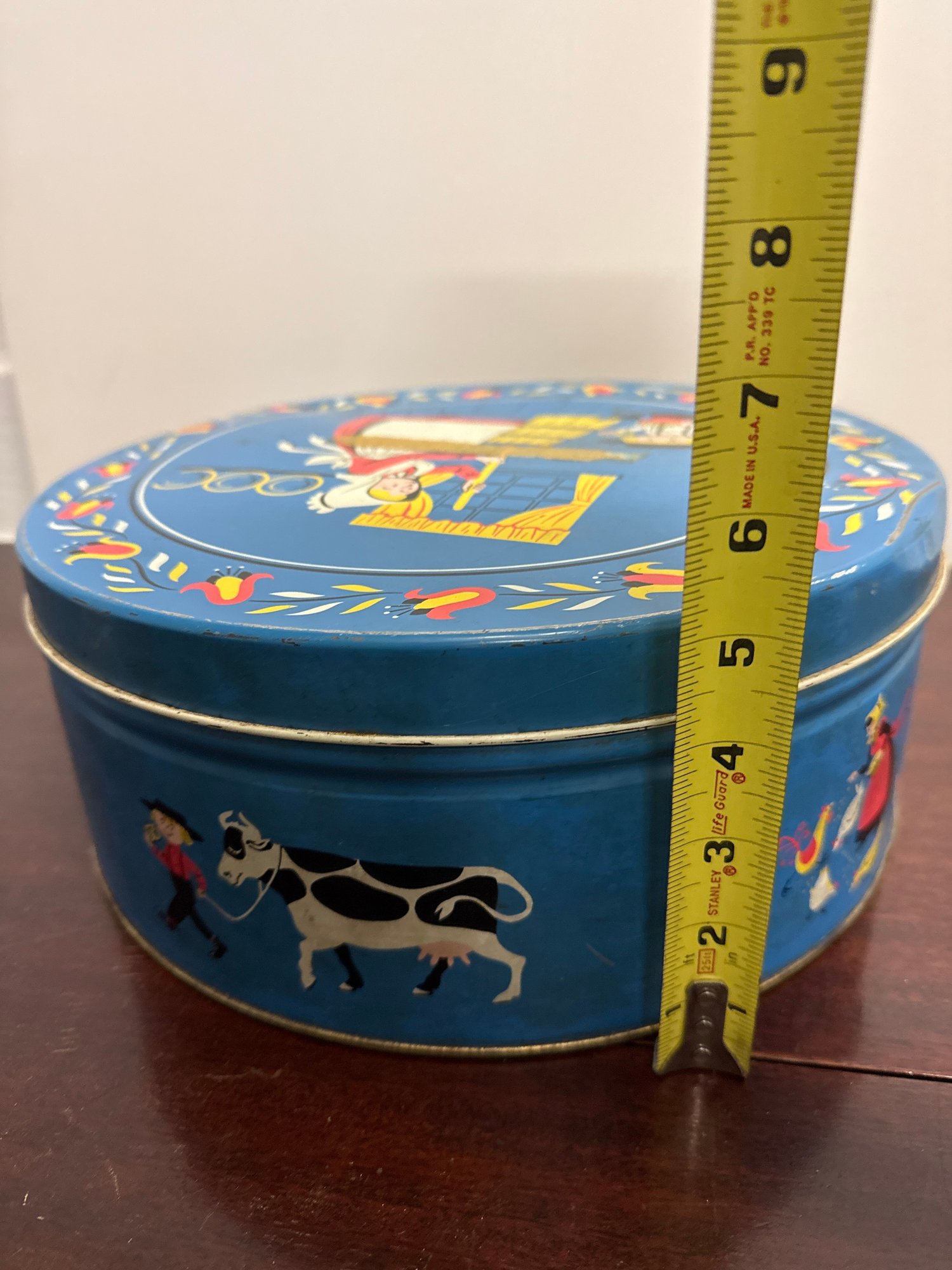Vintage Quinlan's Amish Dutch Round Tin With Farm And Pretzel Motif
