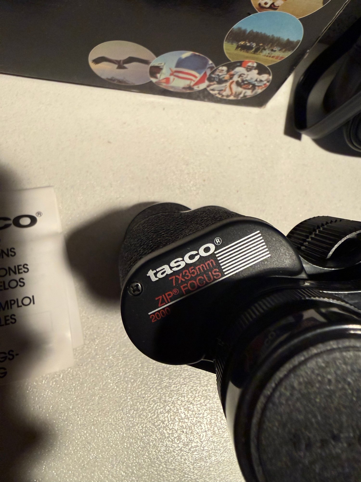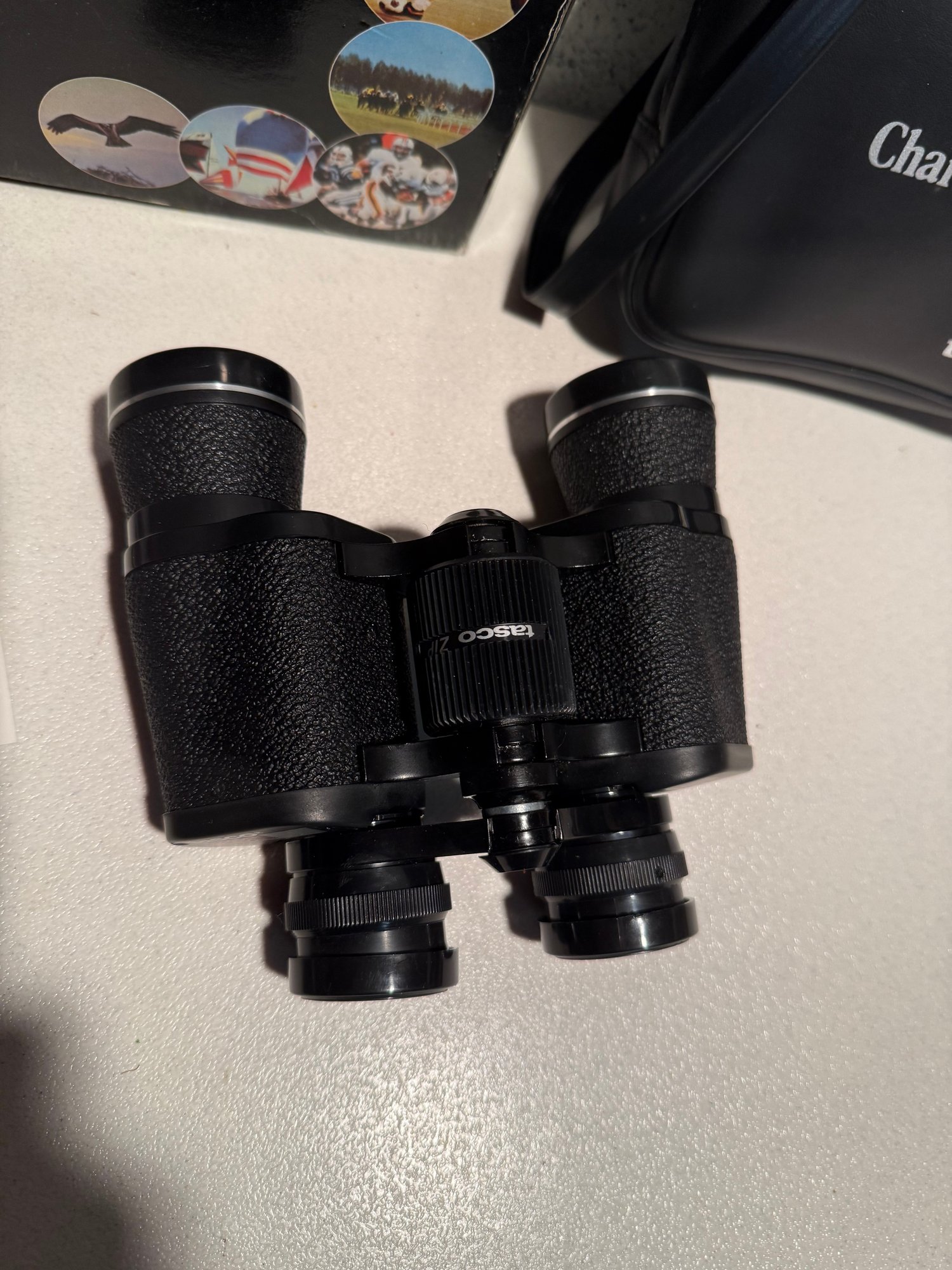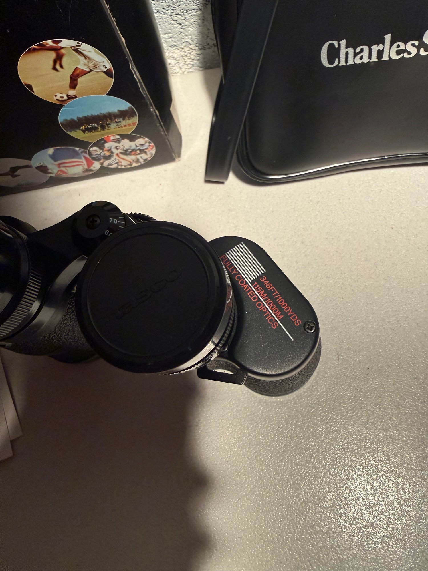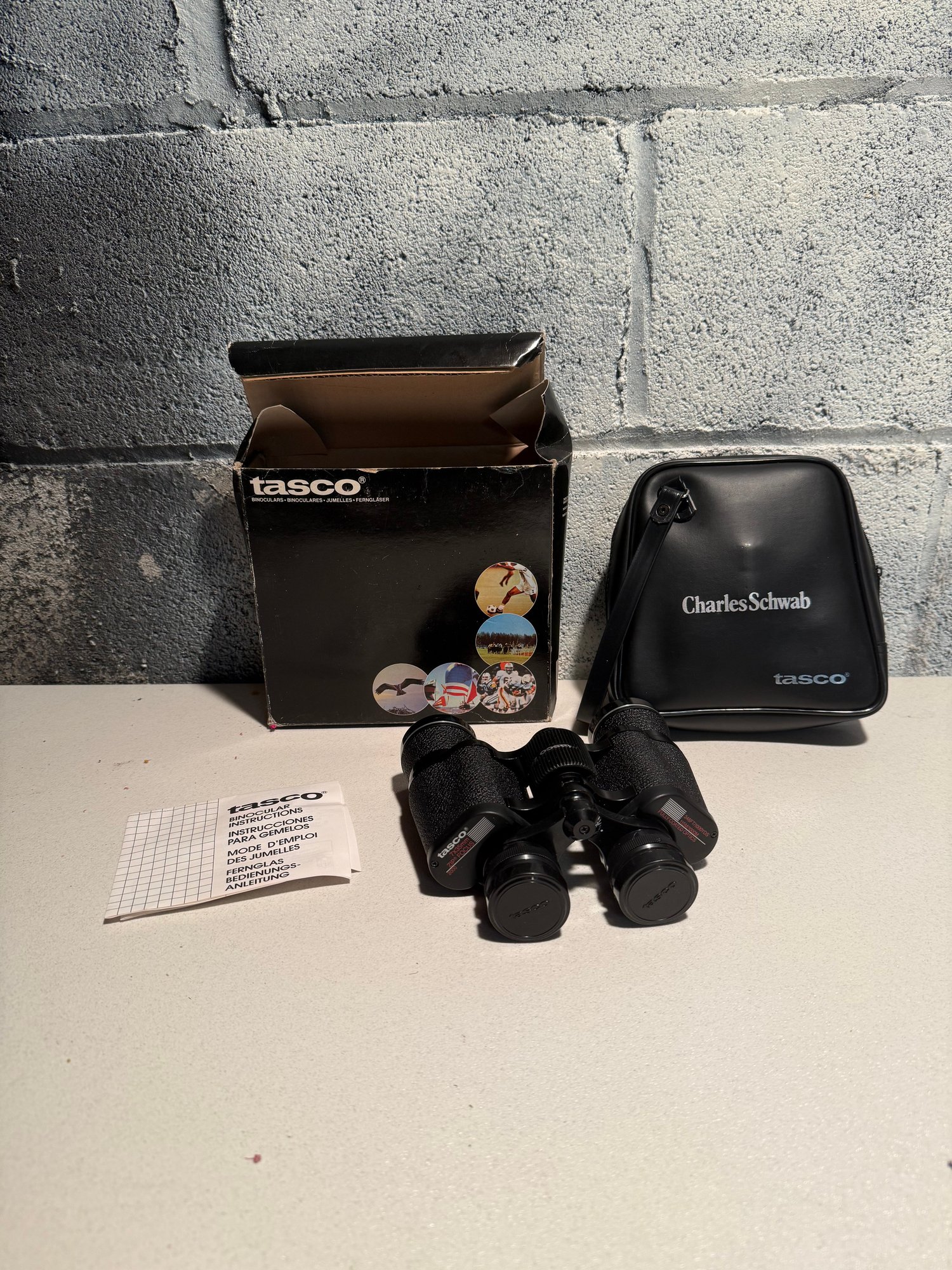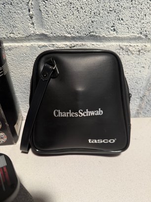 Vintage Tasco Binoculars Featuring A Charles Schwab Branding On The Carrying Case.