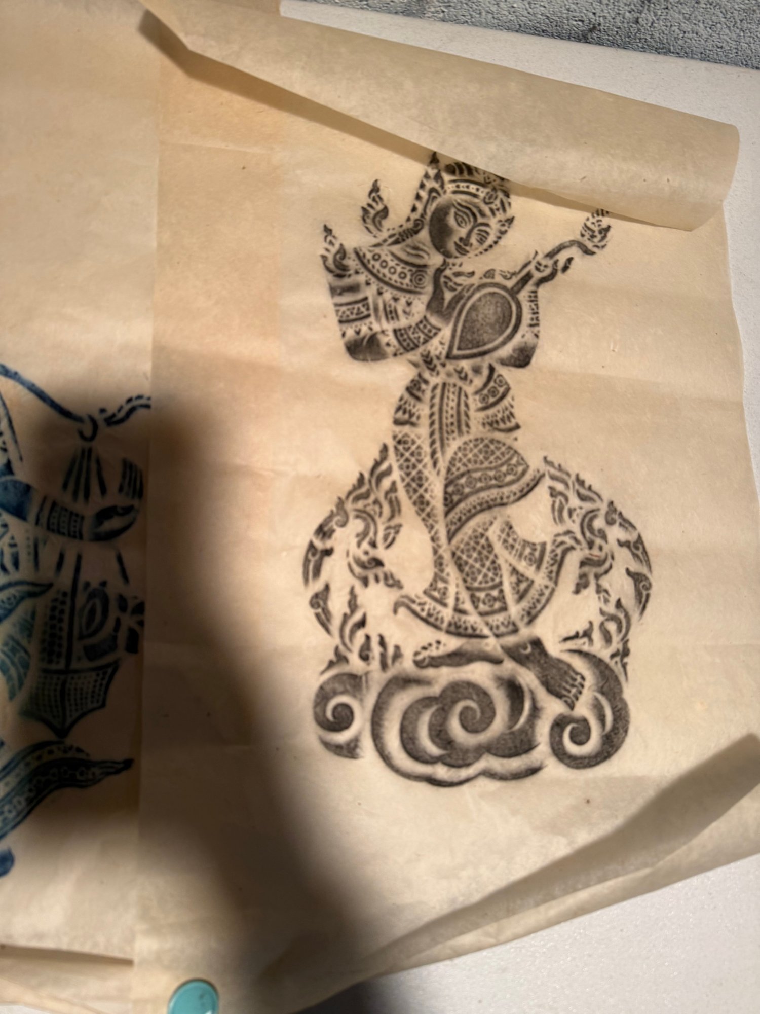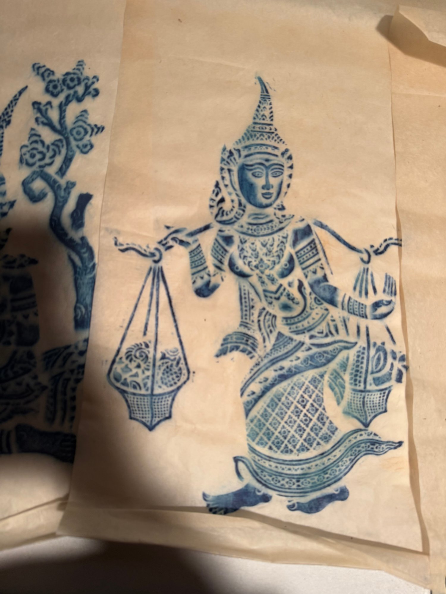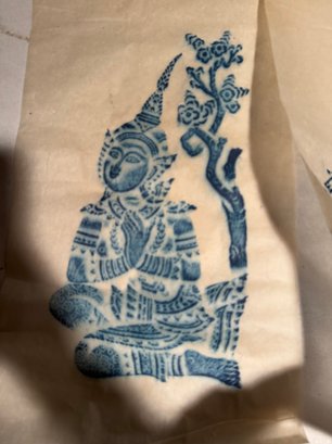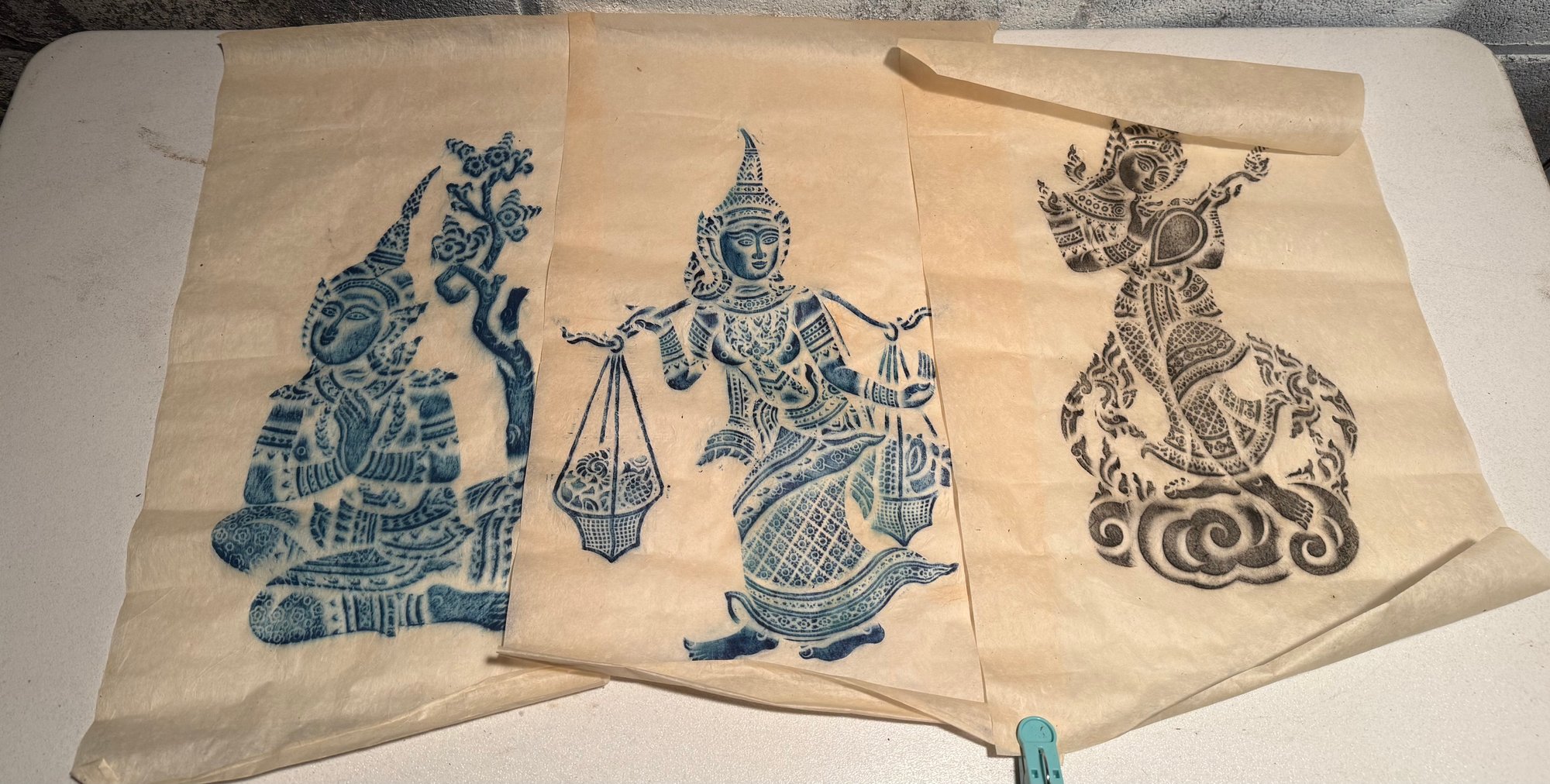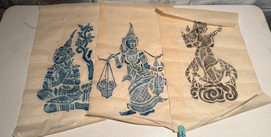 Vintage Thai Temple Rubbings On Rice Paper Featuring Traditional Figures 2 Blue 1 Black