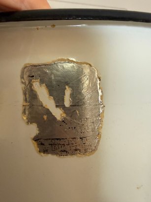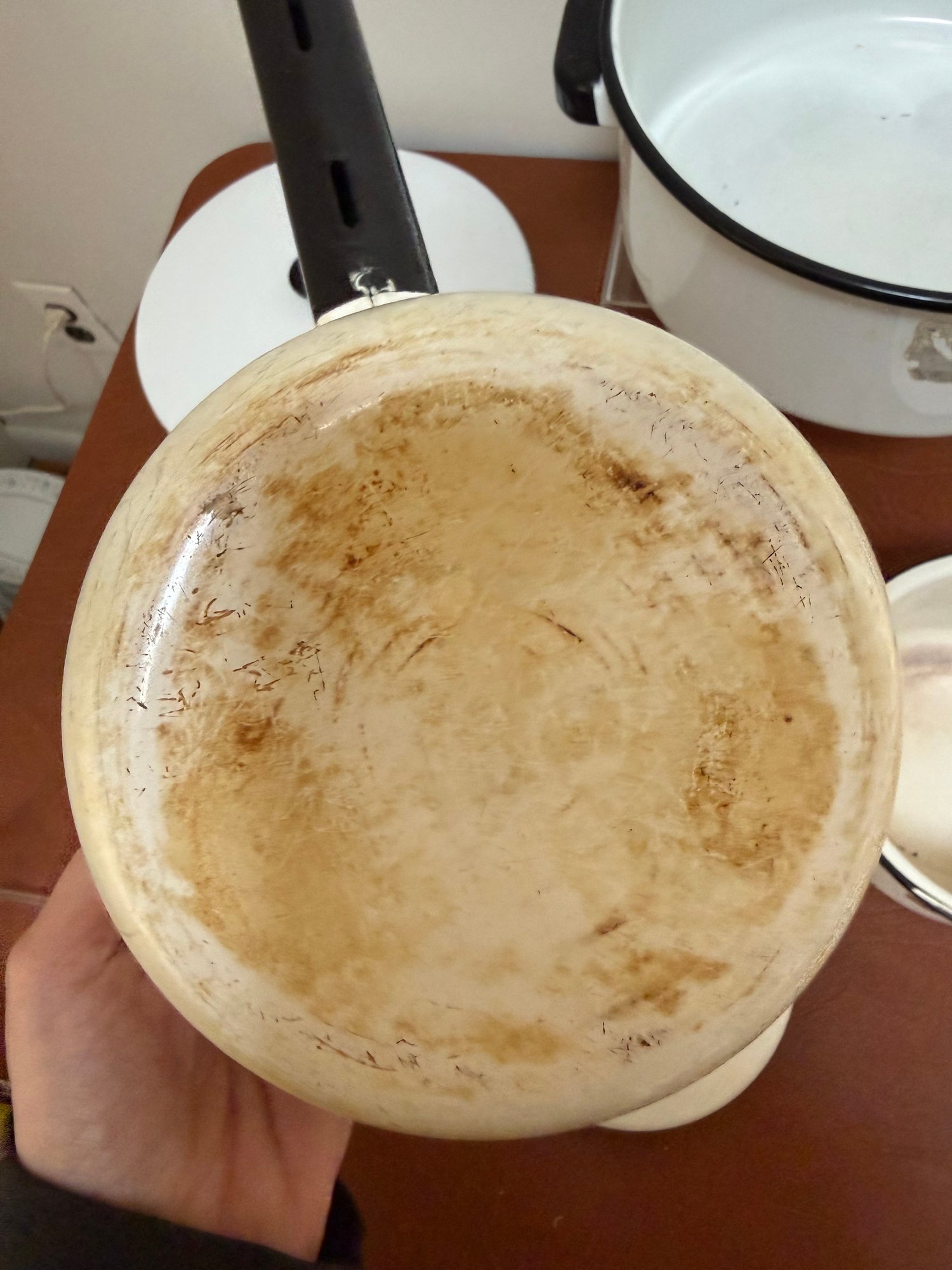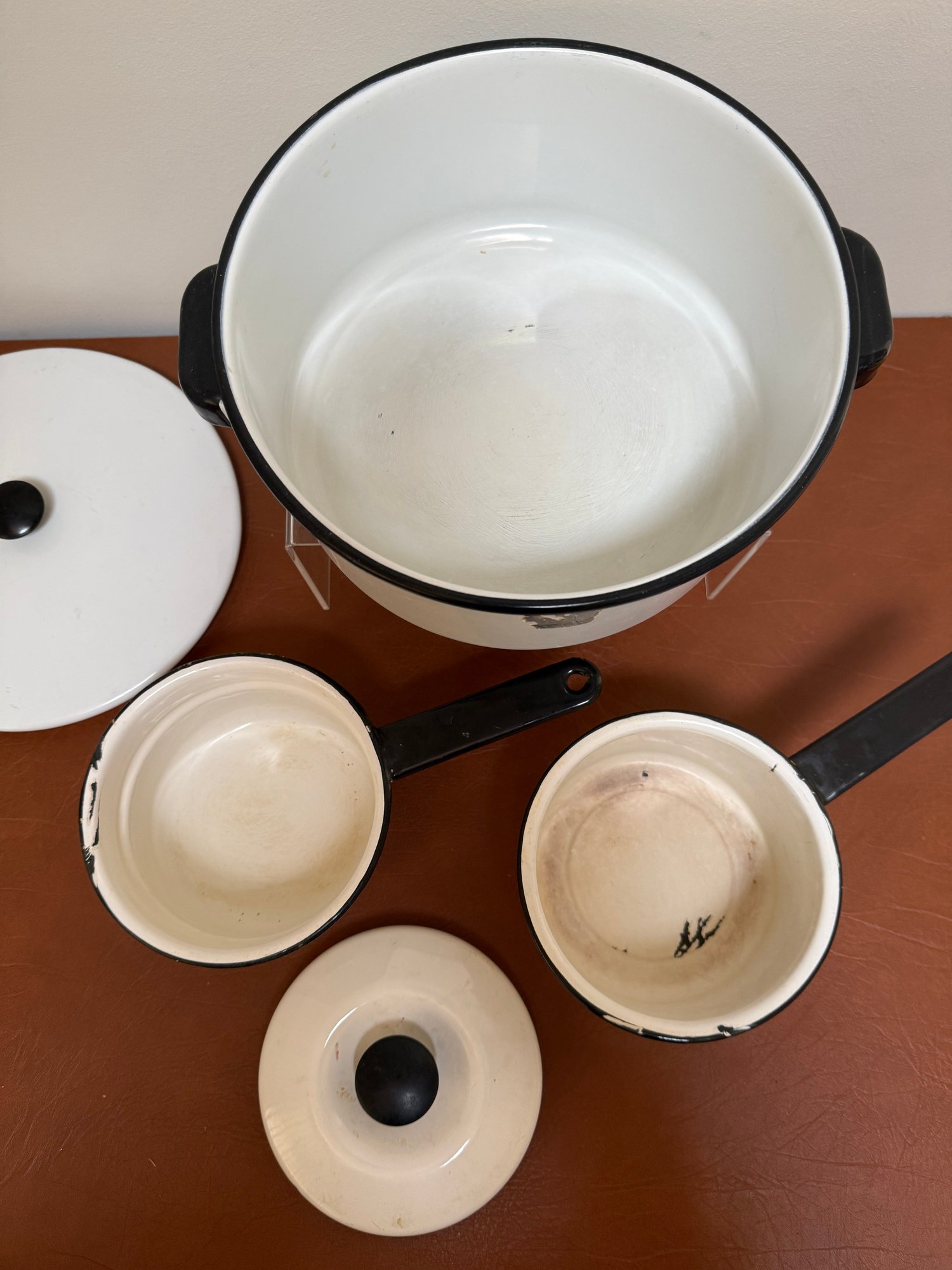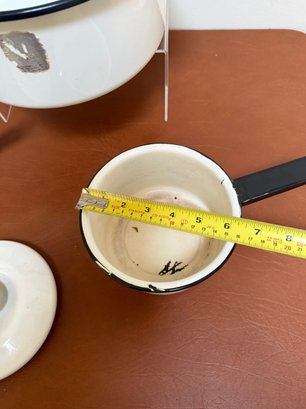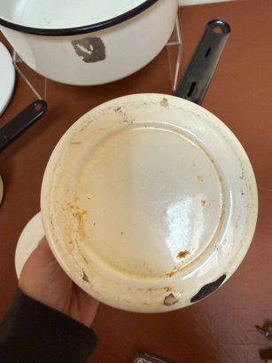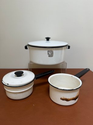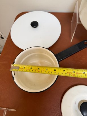Vintage White Enamelware Pots And Pans With Black Trim