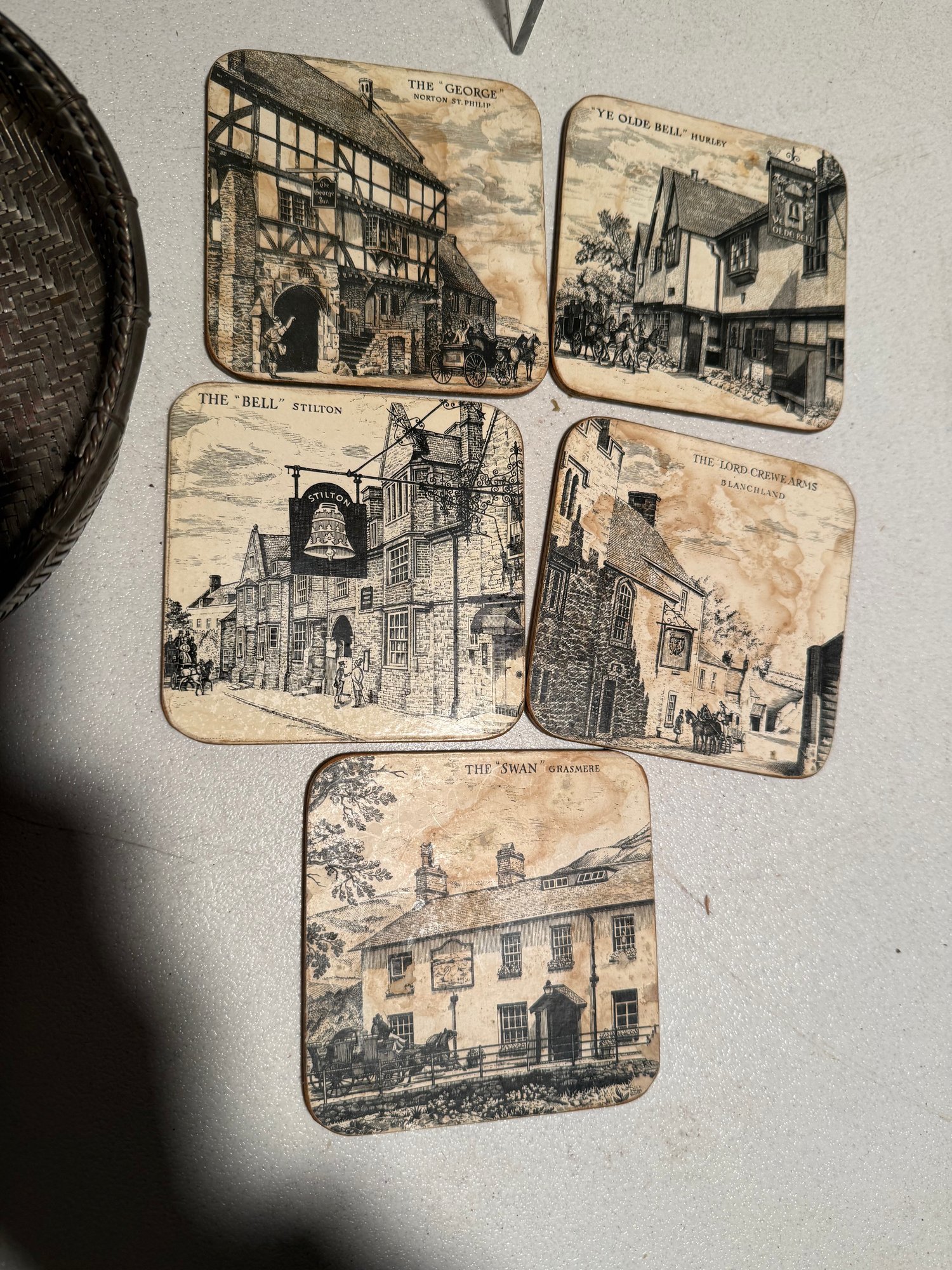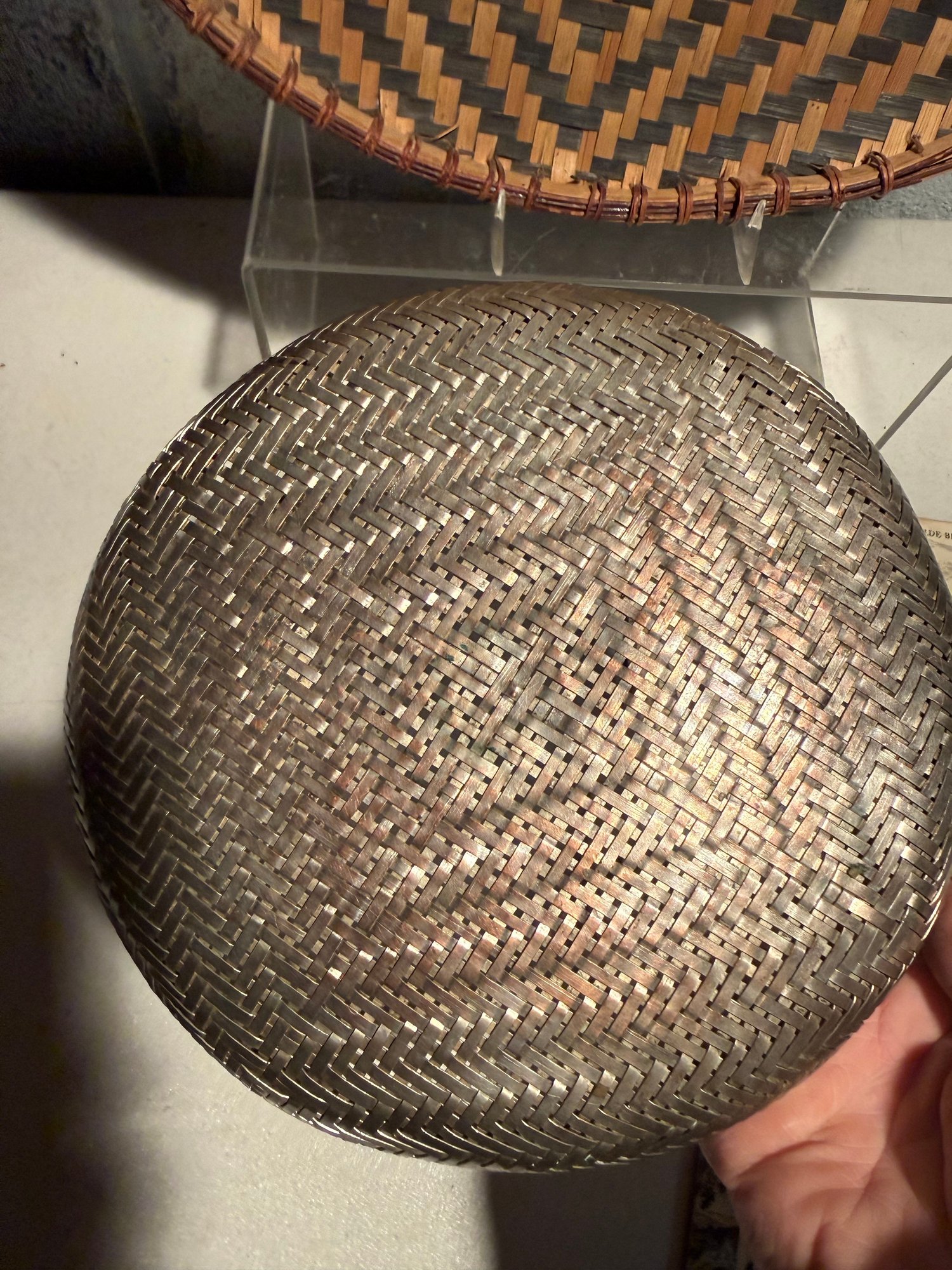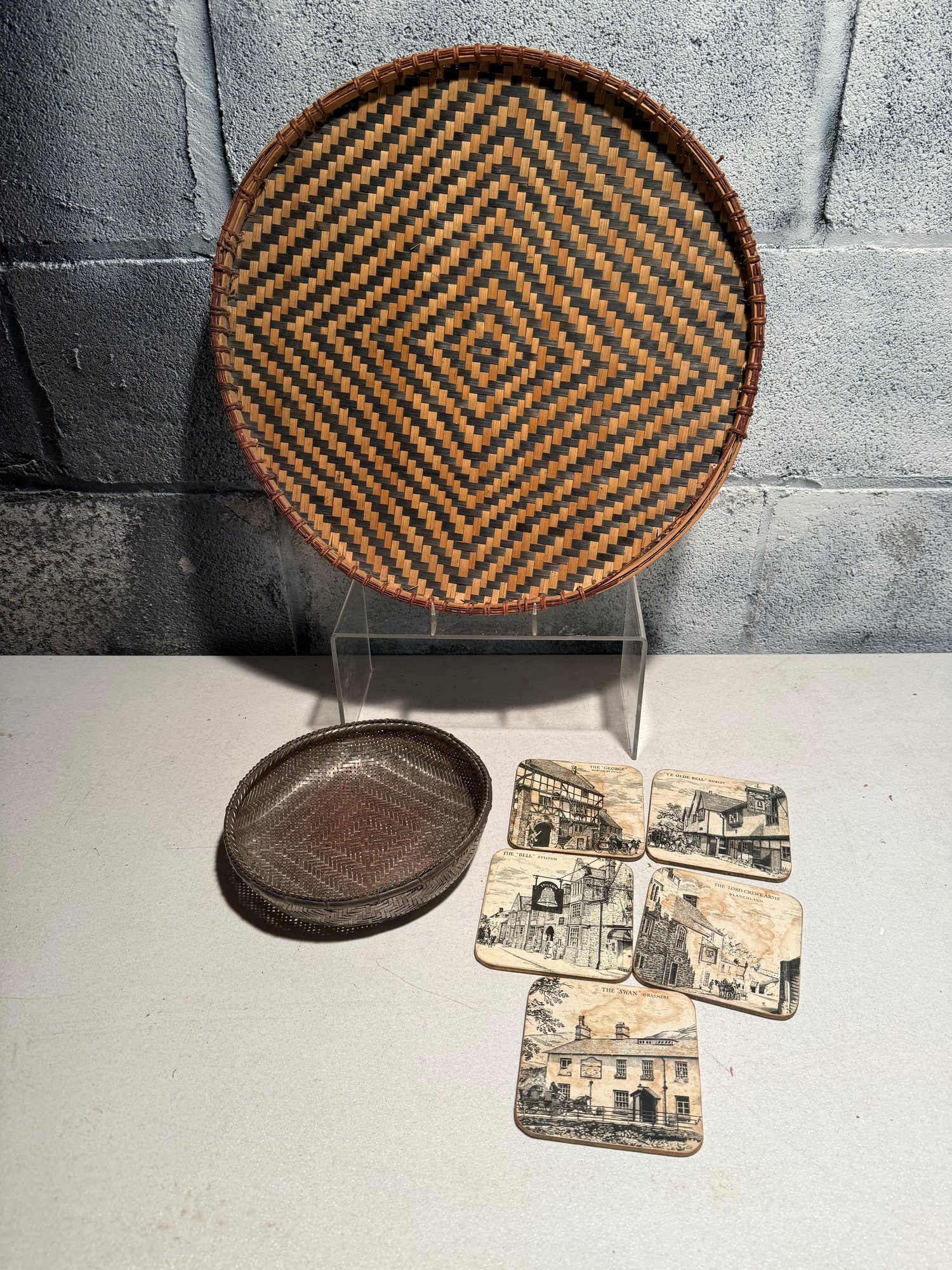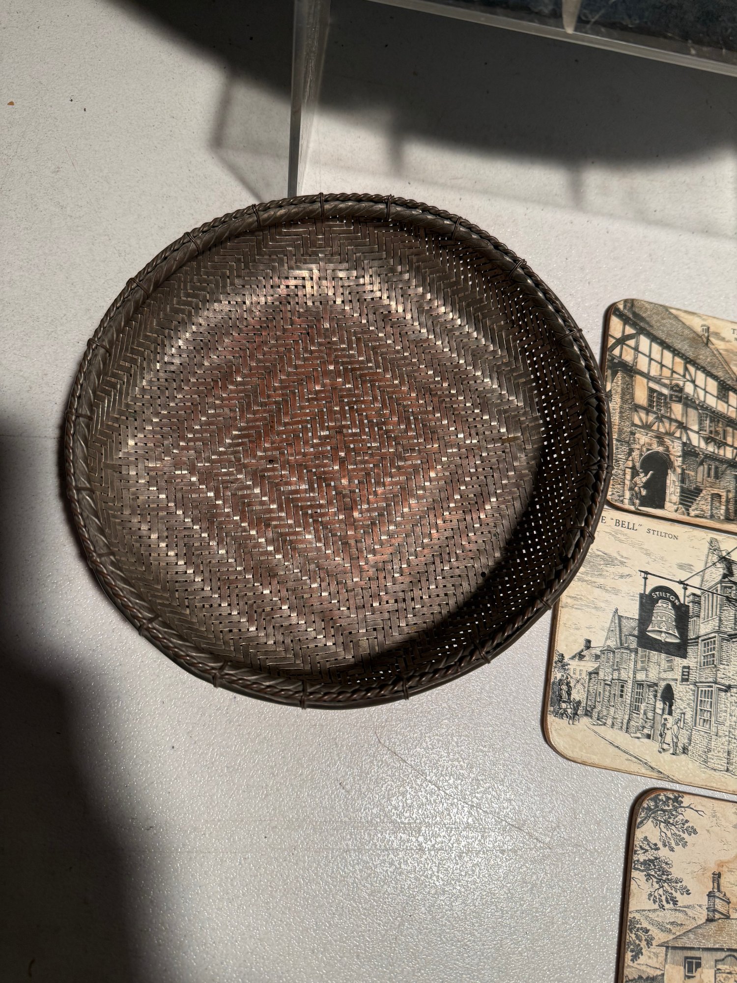 Vintage Woven Basket Wall Hanging, Chinese Silver Wire Woven Bread Basket & Historic British Coasters