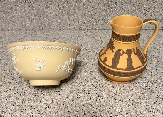 Wedgwood Jasperware Cane Yellow/taupe Brown Etruscan Jug & Bowl