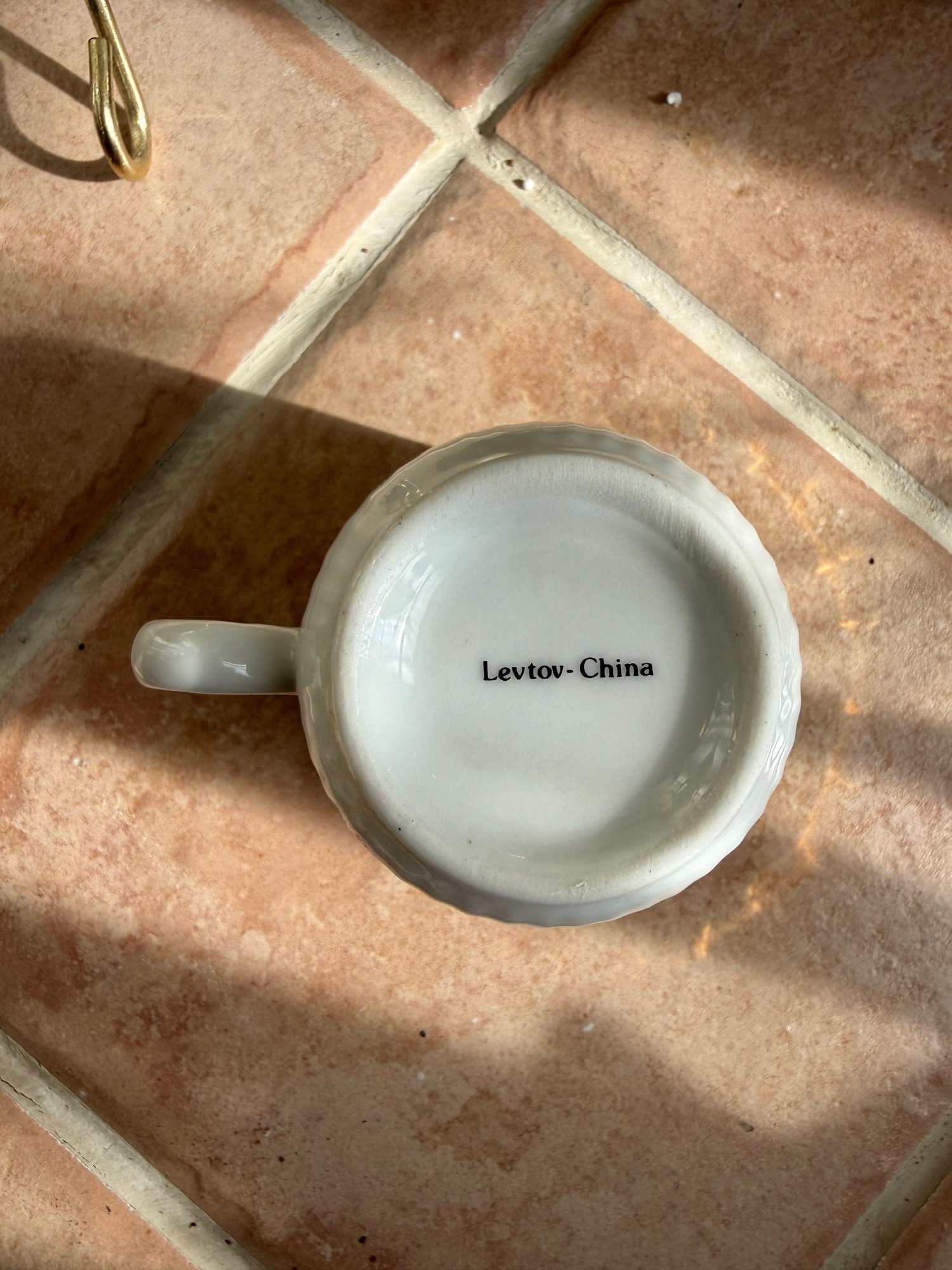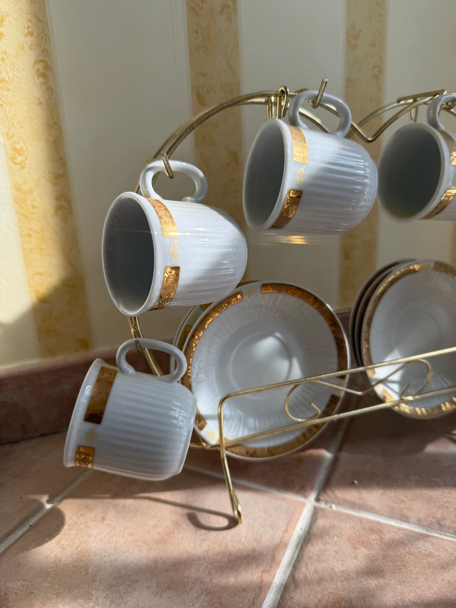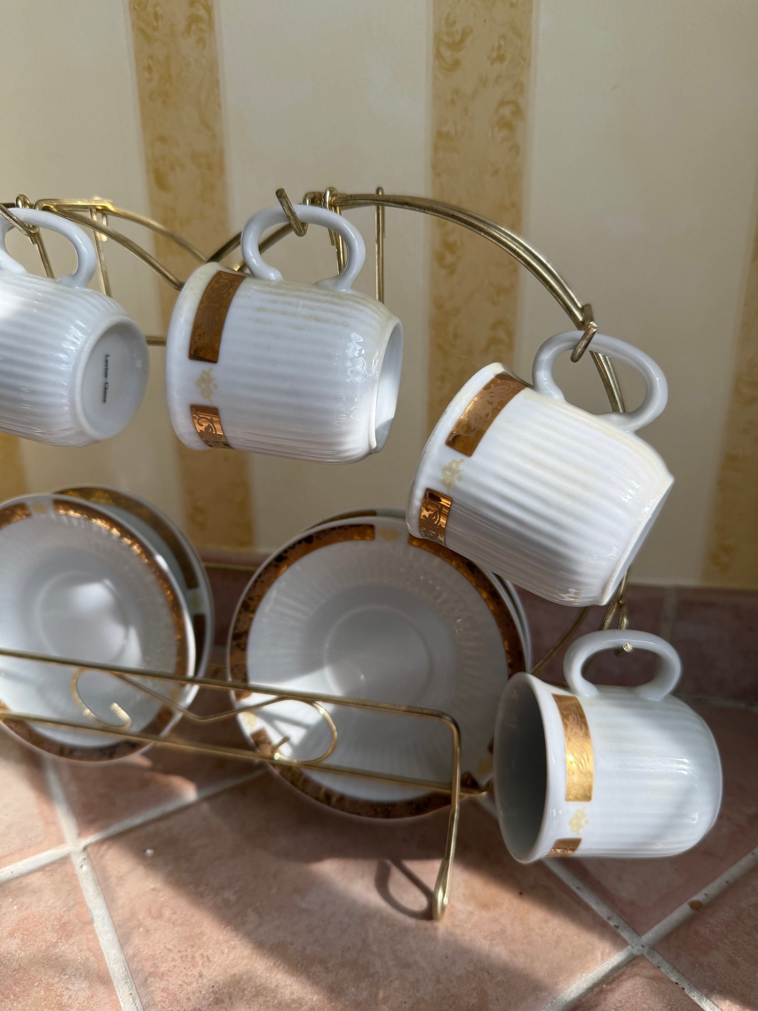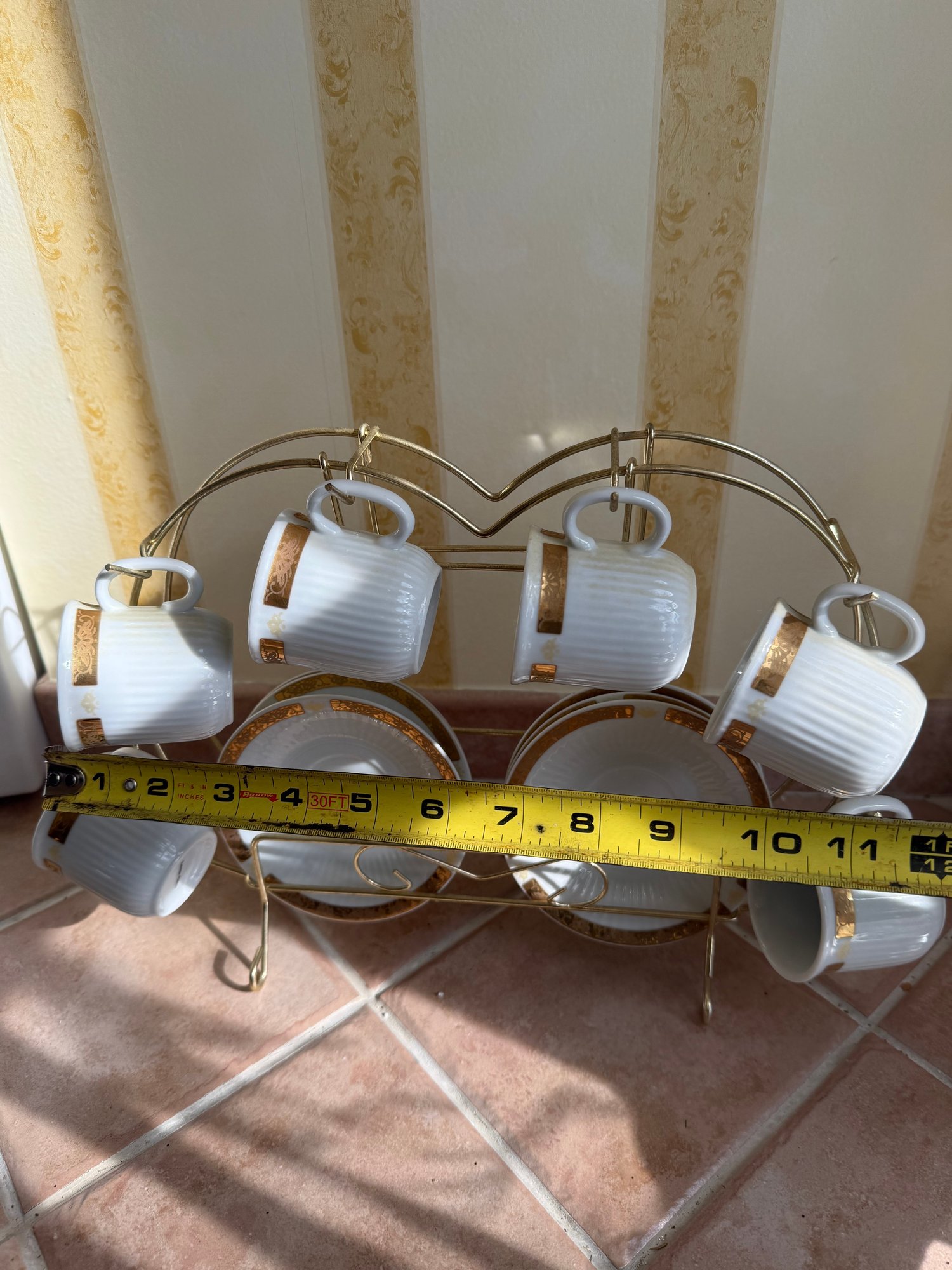 White Ribbed Teacups With Gold Rim Saucers, Arranged On A Heart-shaped Wire Display Rack
