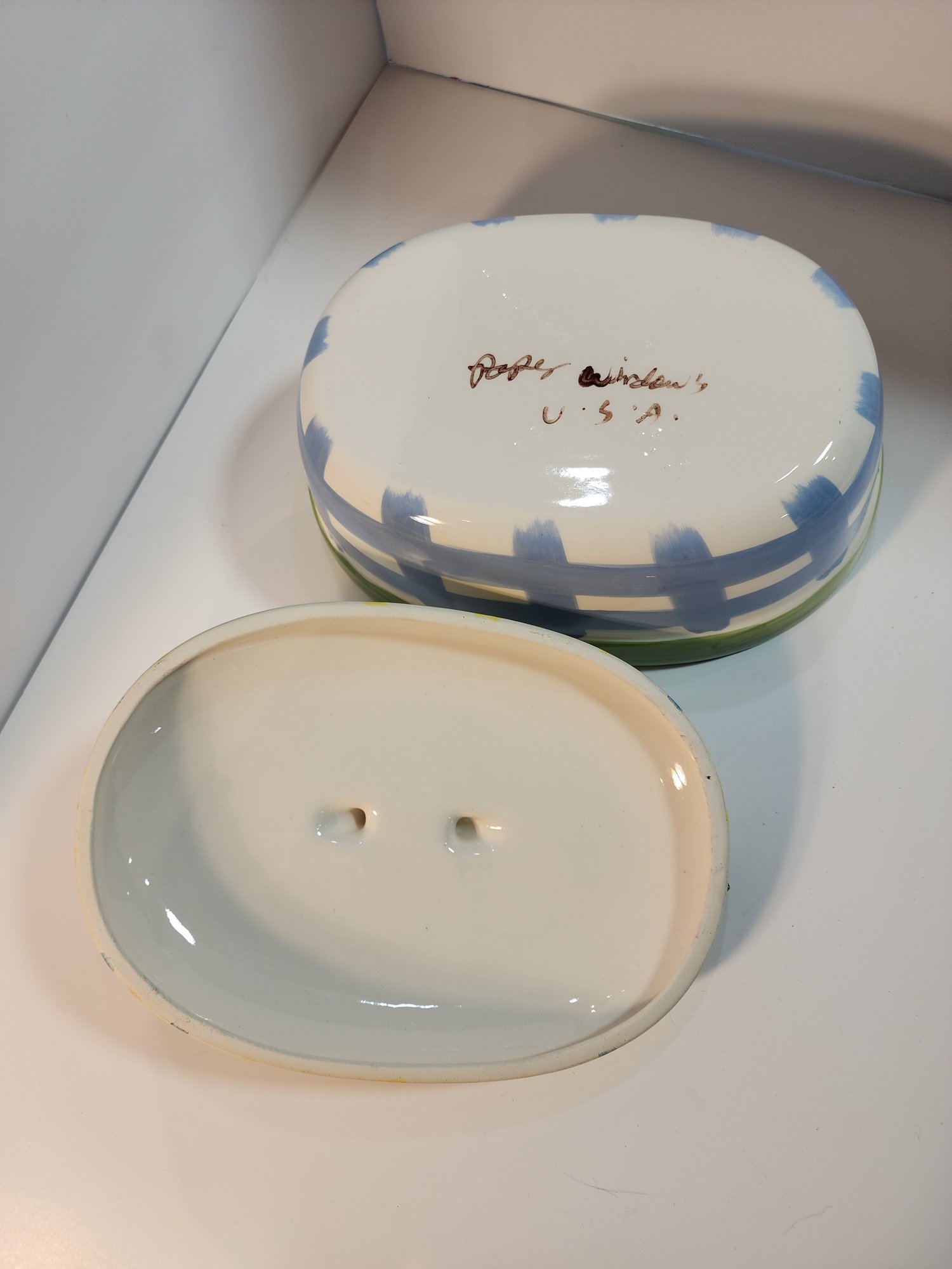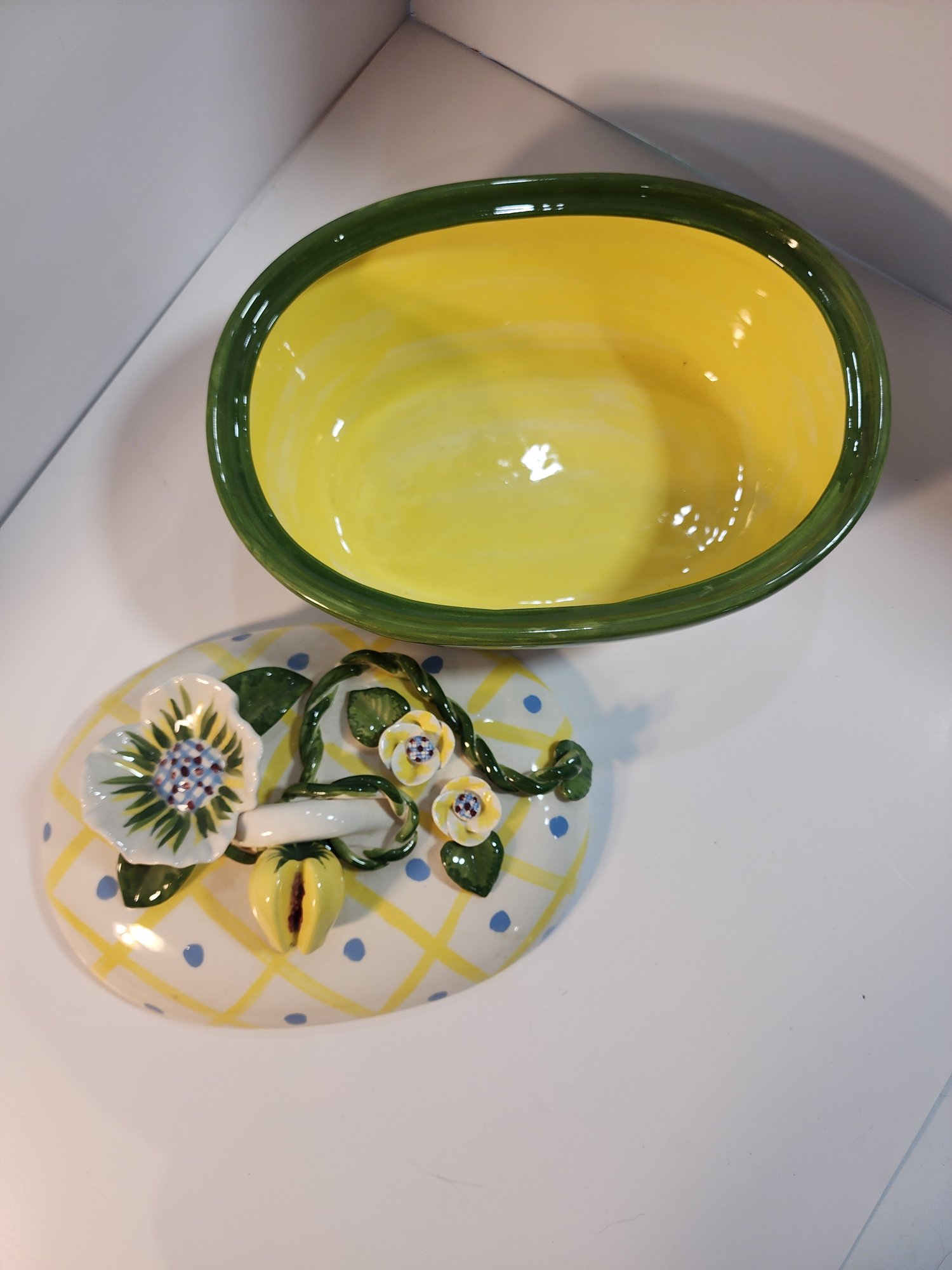 #125 HAND PAINTED AND SIGNED BLUE AND YELLOW CHECK SERVING DISH WITH LID