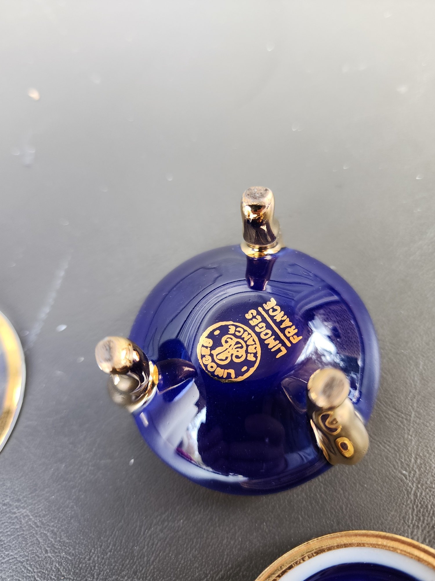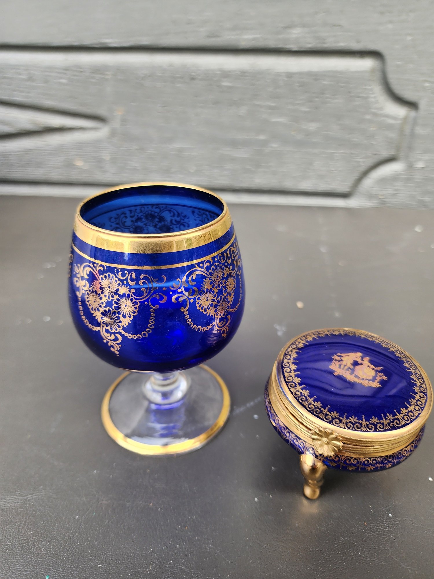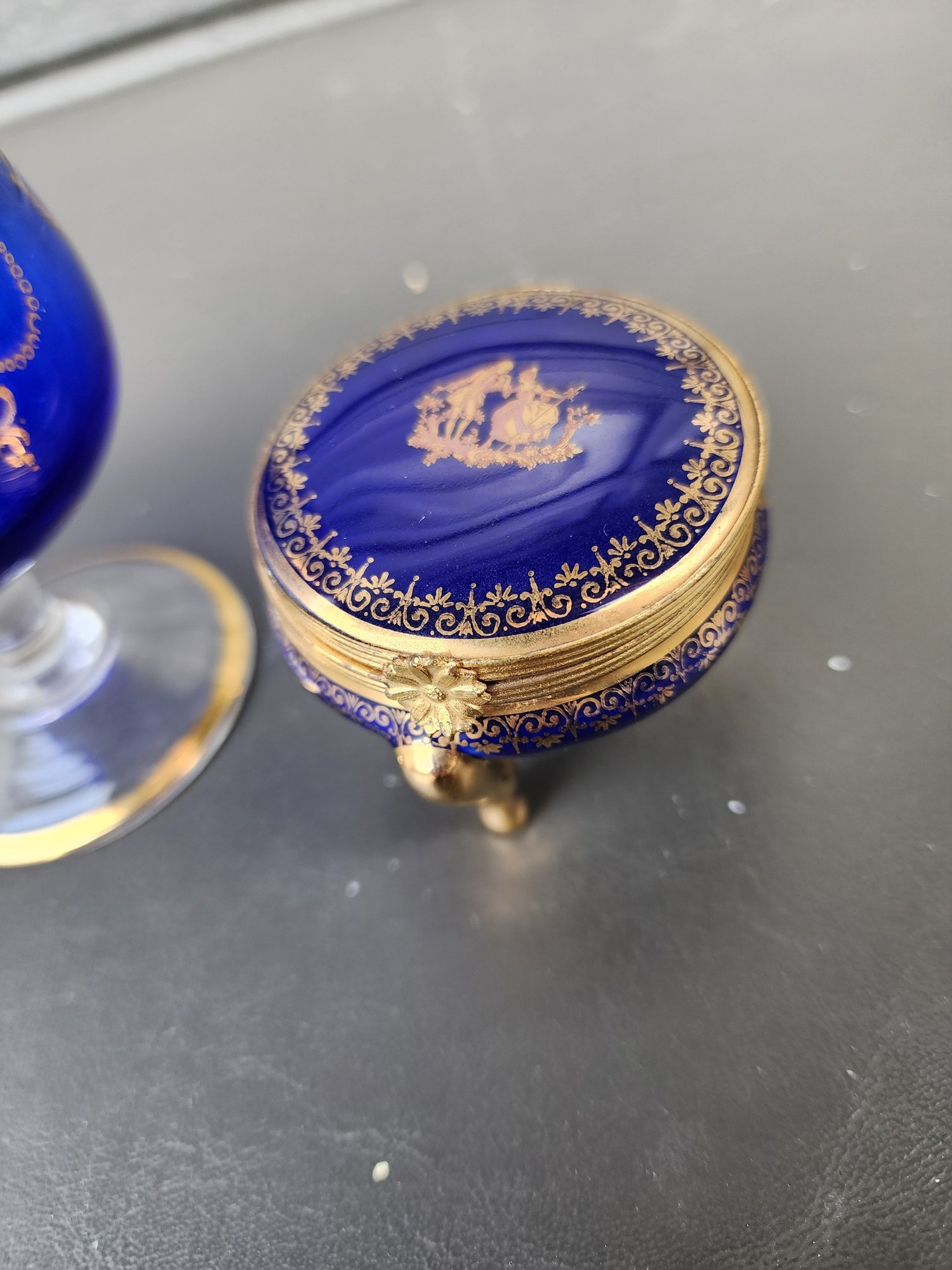 #129 Limoges Trinket Box And Matching Gold, Blue And Crystal Brandy Glass