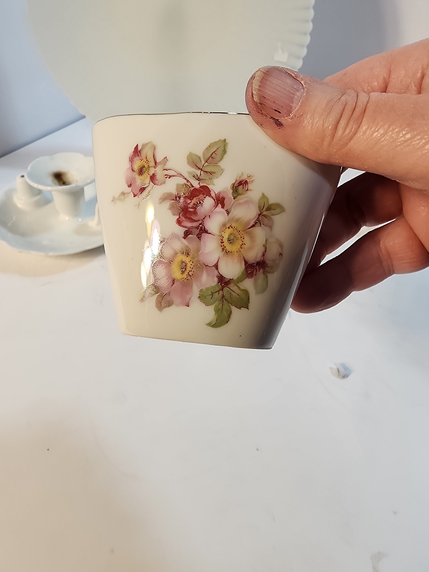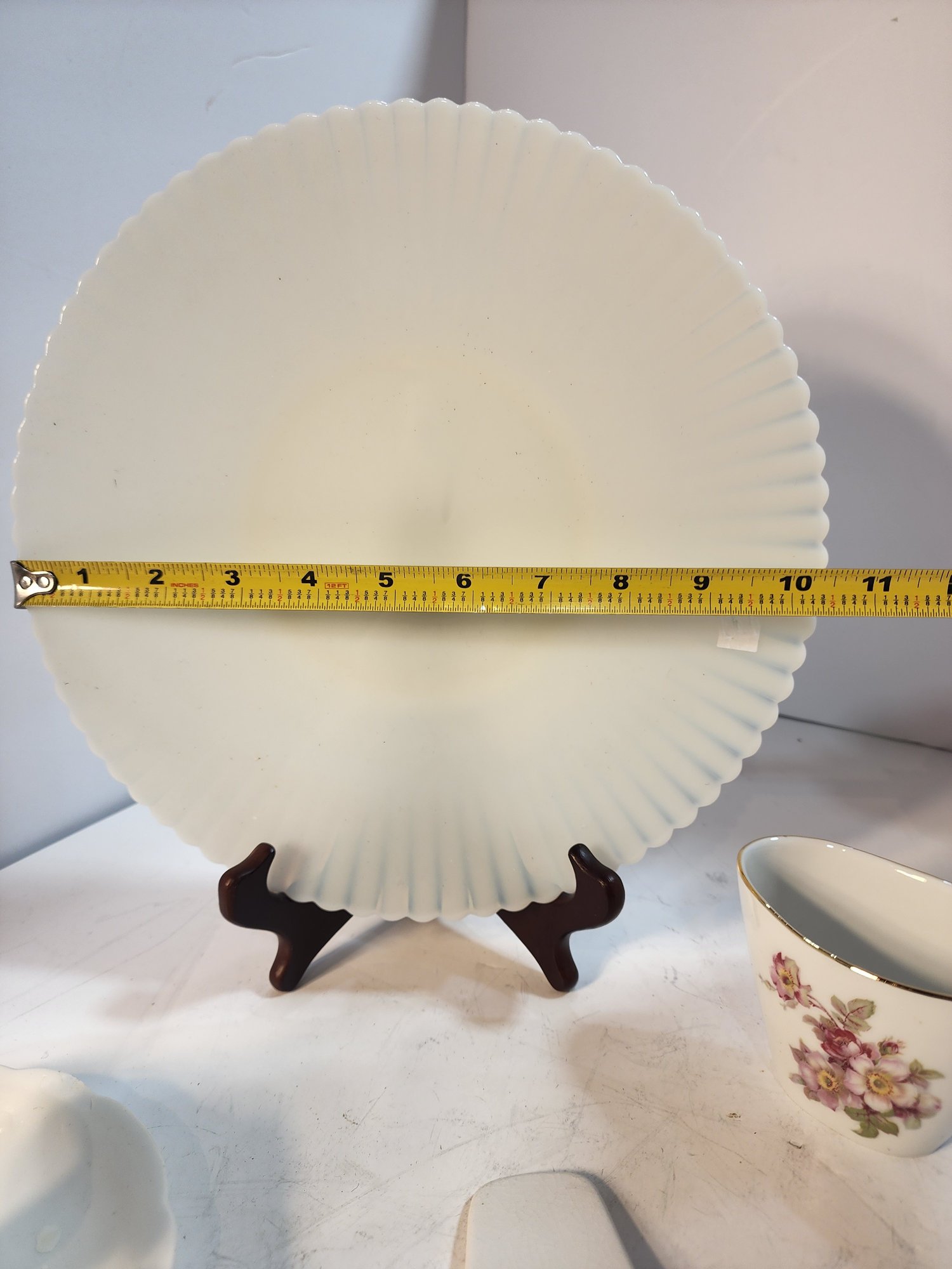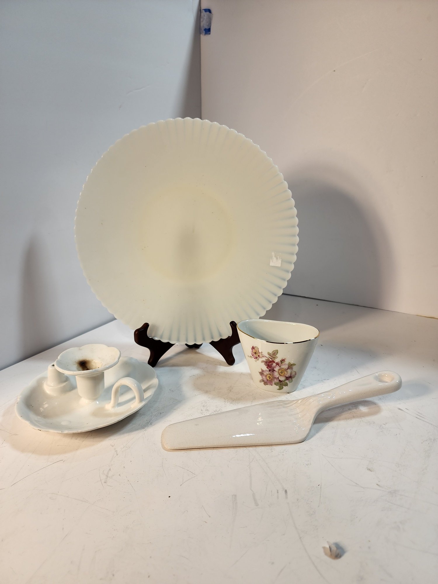#129 VINTAGE DEPRESSION GLASS PLATE, CANDLE HOLDER AND CAKE KNIFE