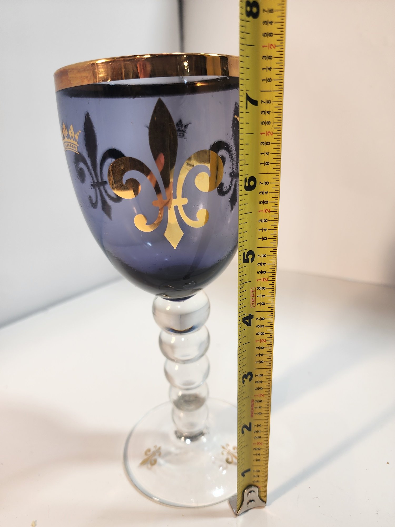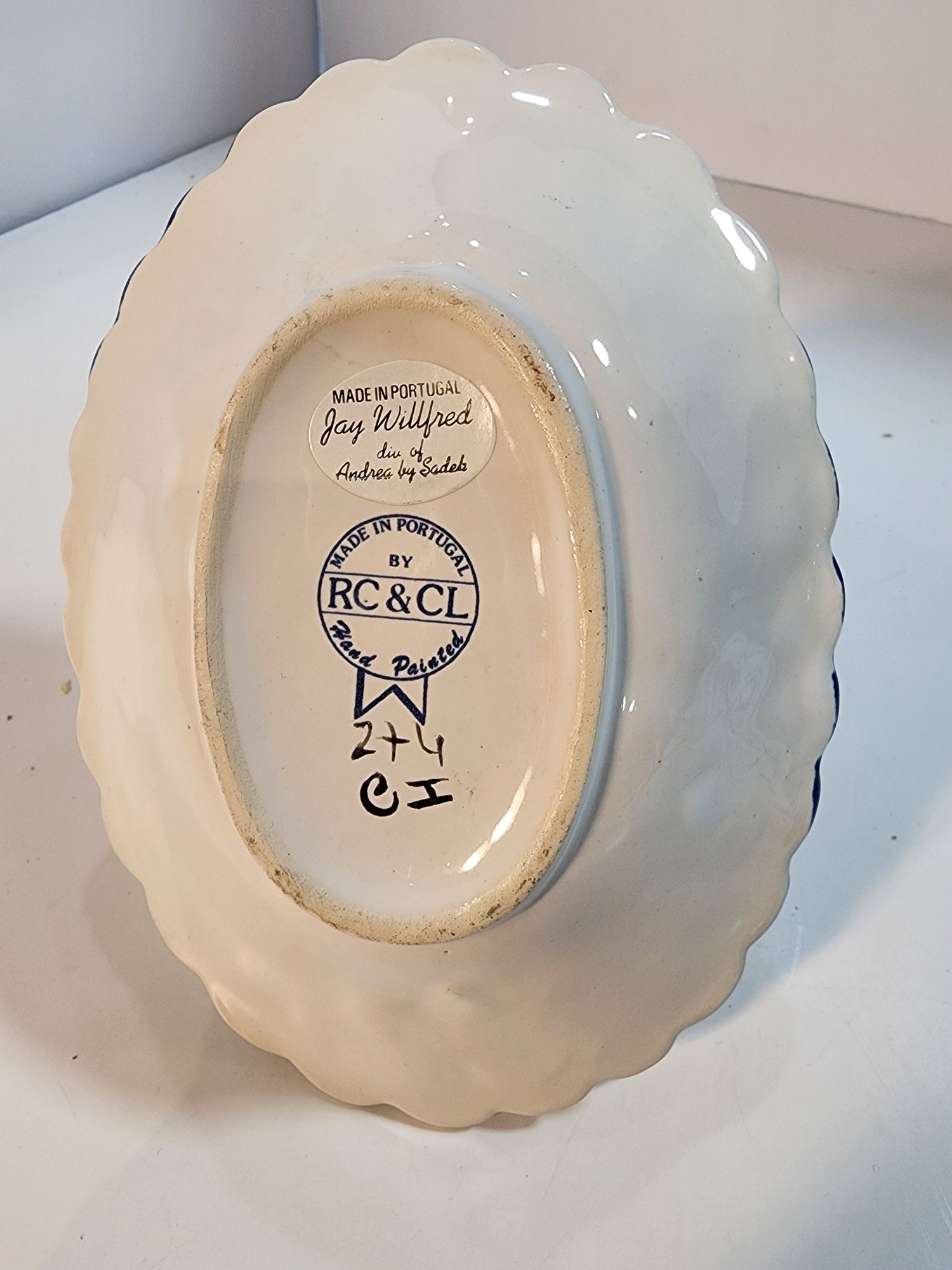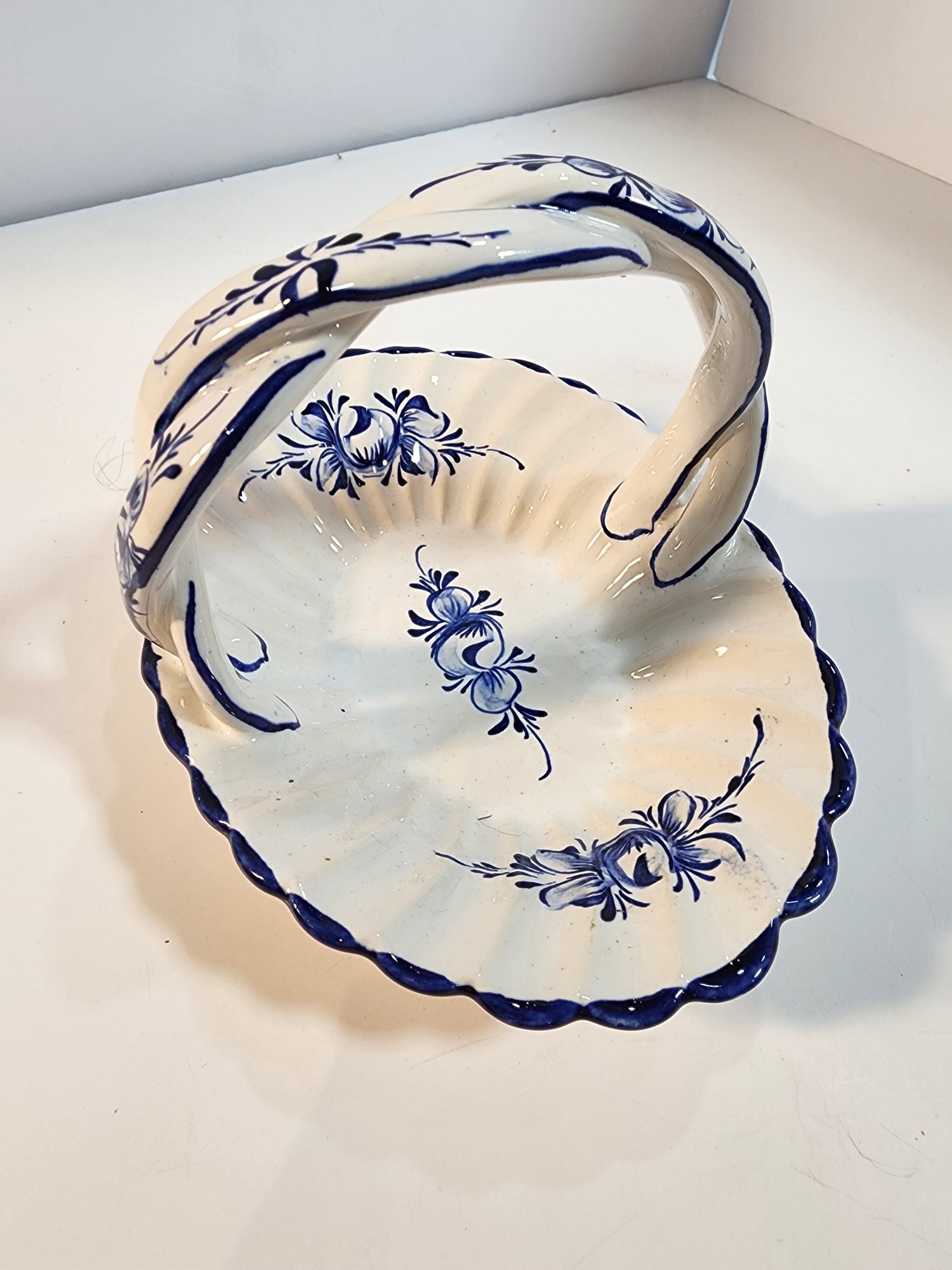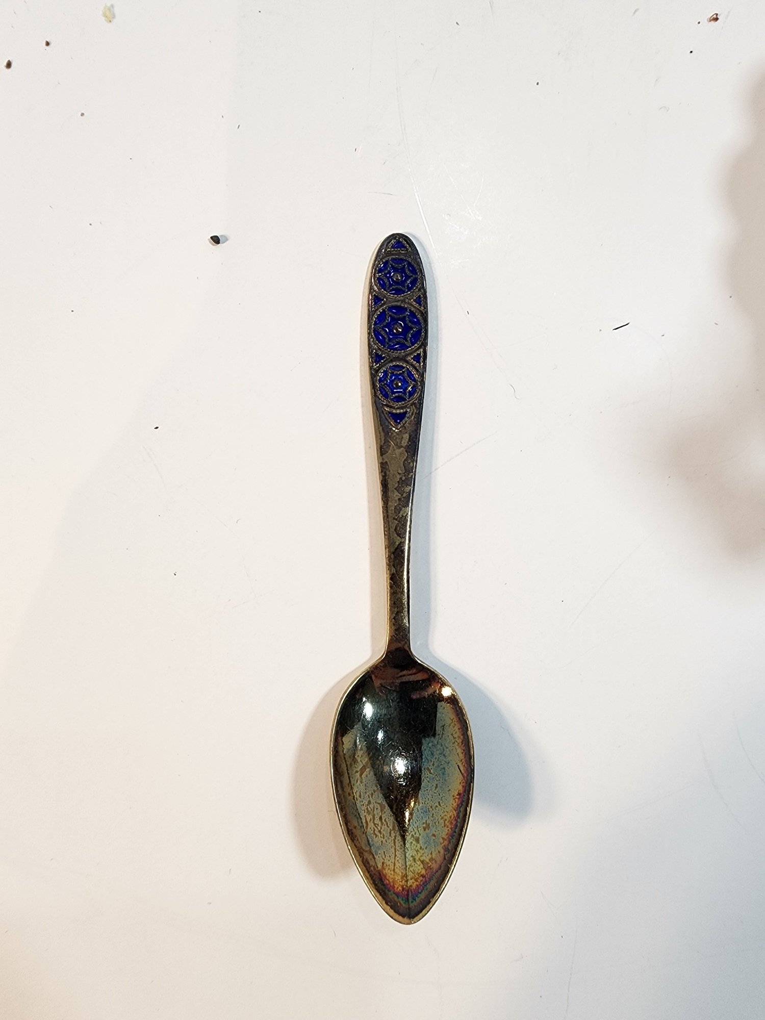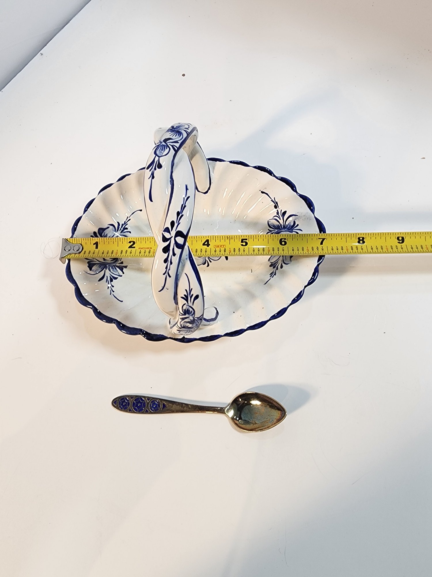 #134 HAND PAINTED PURPLE GLASS AND BLUE AND WHITE DISH WITH SPOON