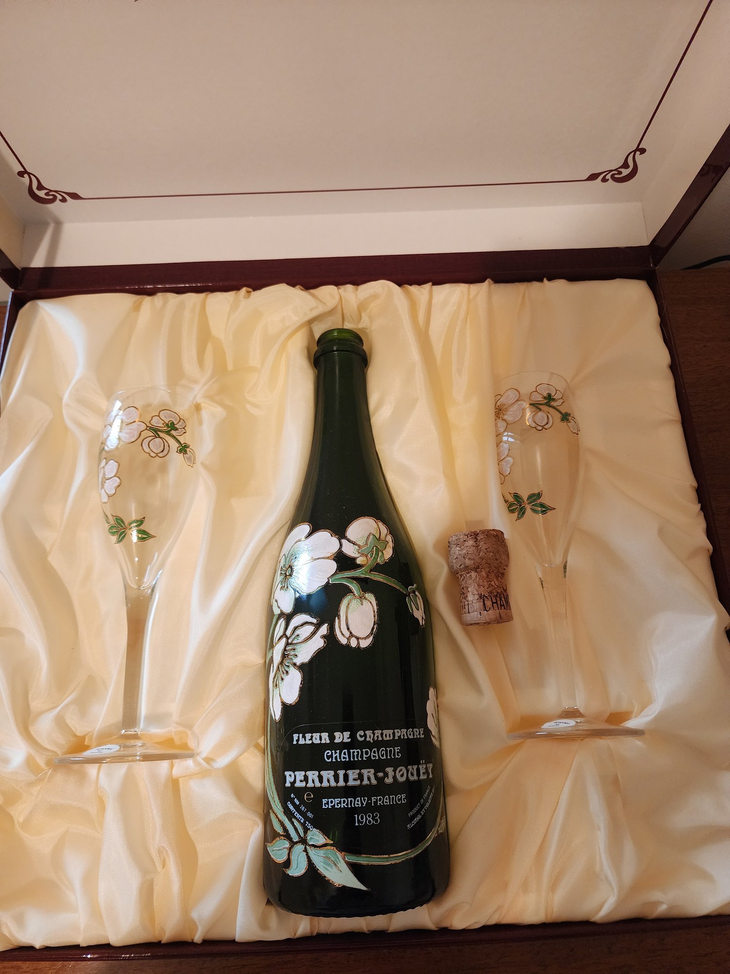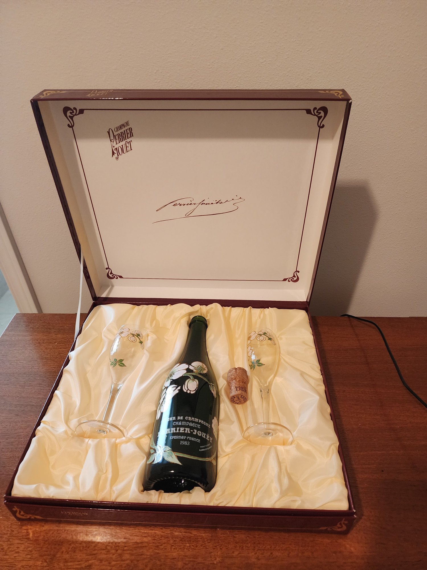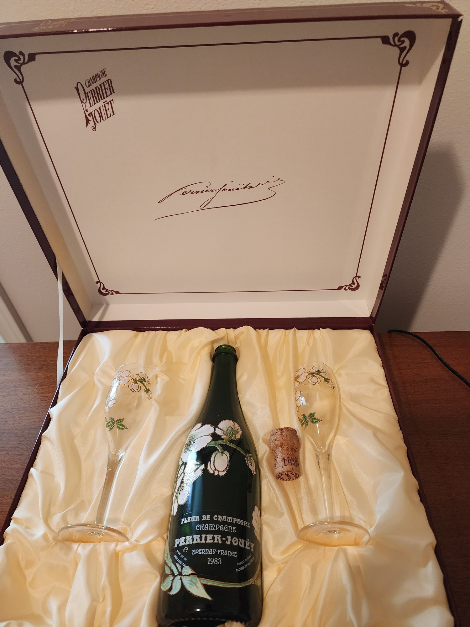 #178 Perrier-jouet Champagne Bottle (empty) In Box With 2 Wine Glasses