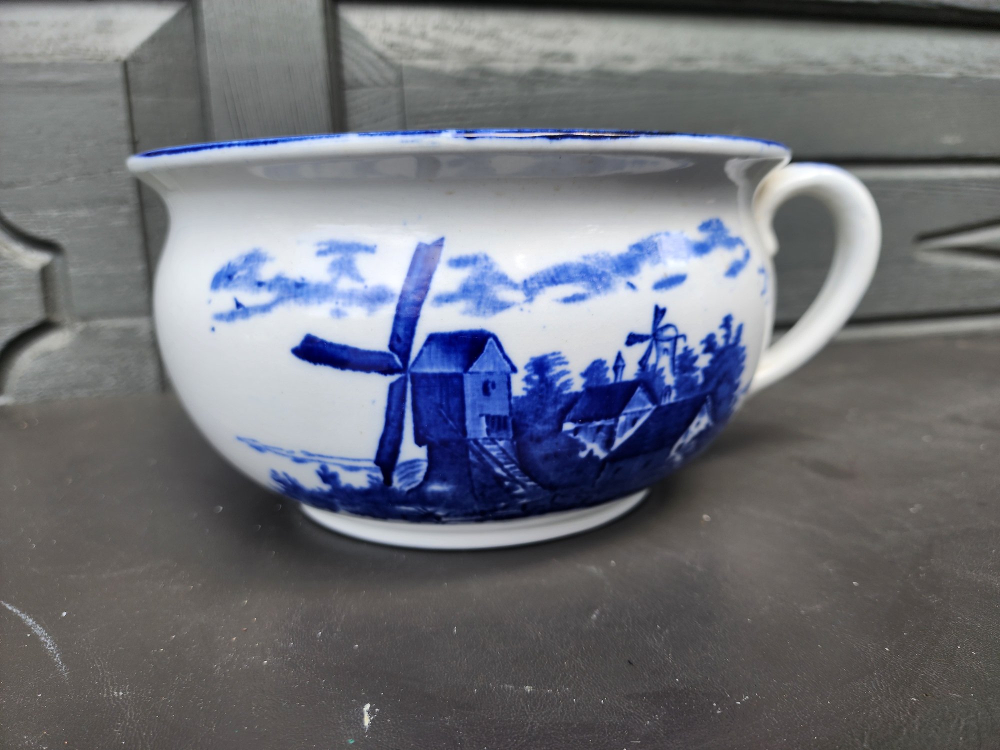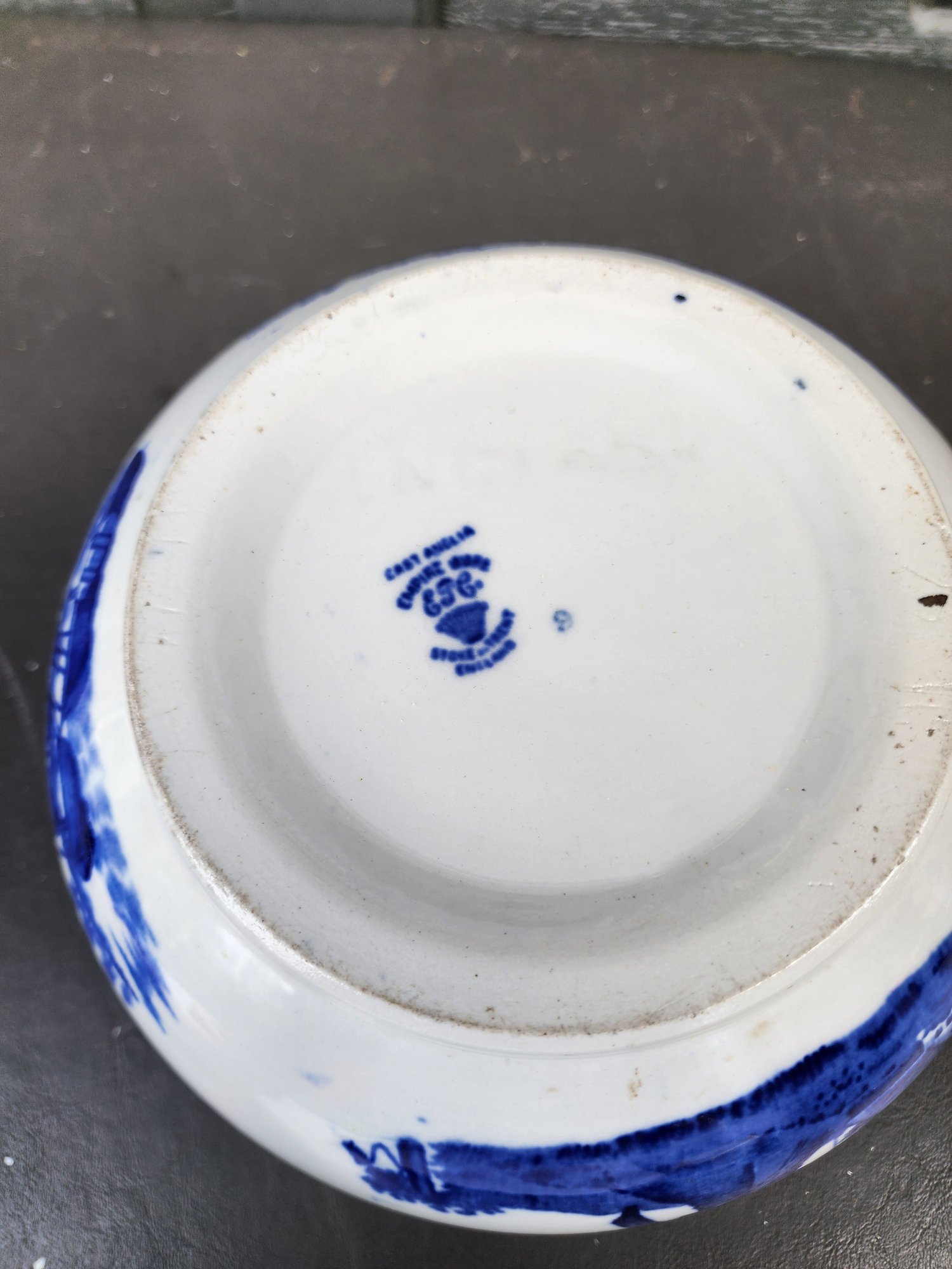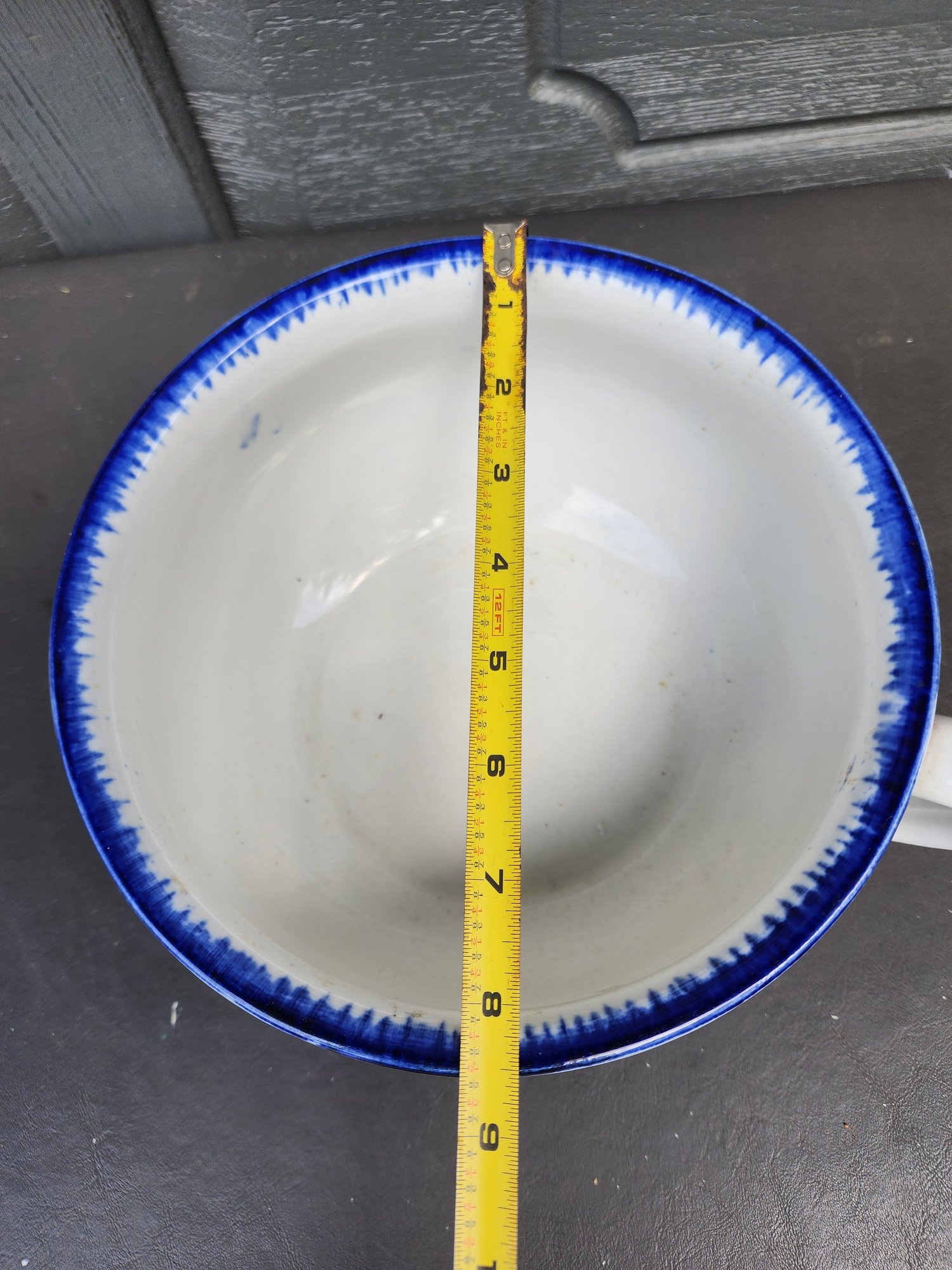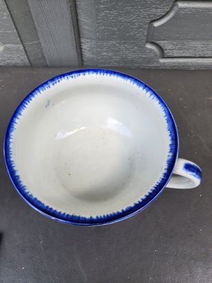 #194 Antique Blue And White English Stoneware Pot With Handle. Wonderful