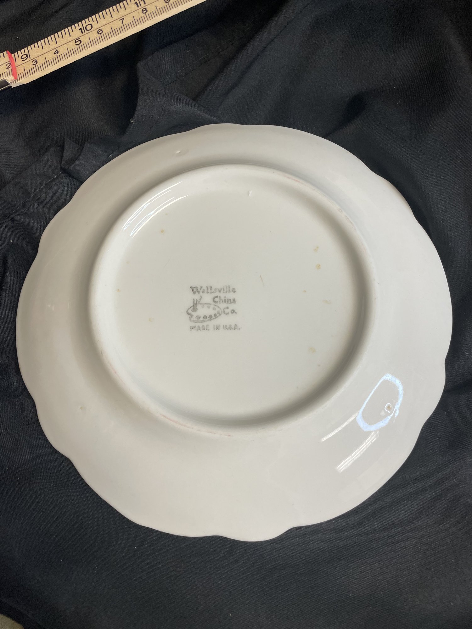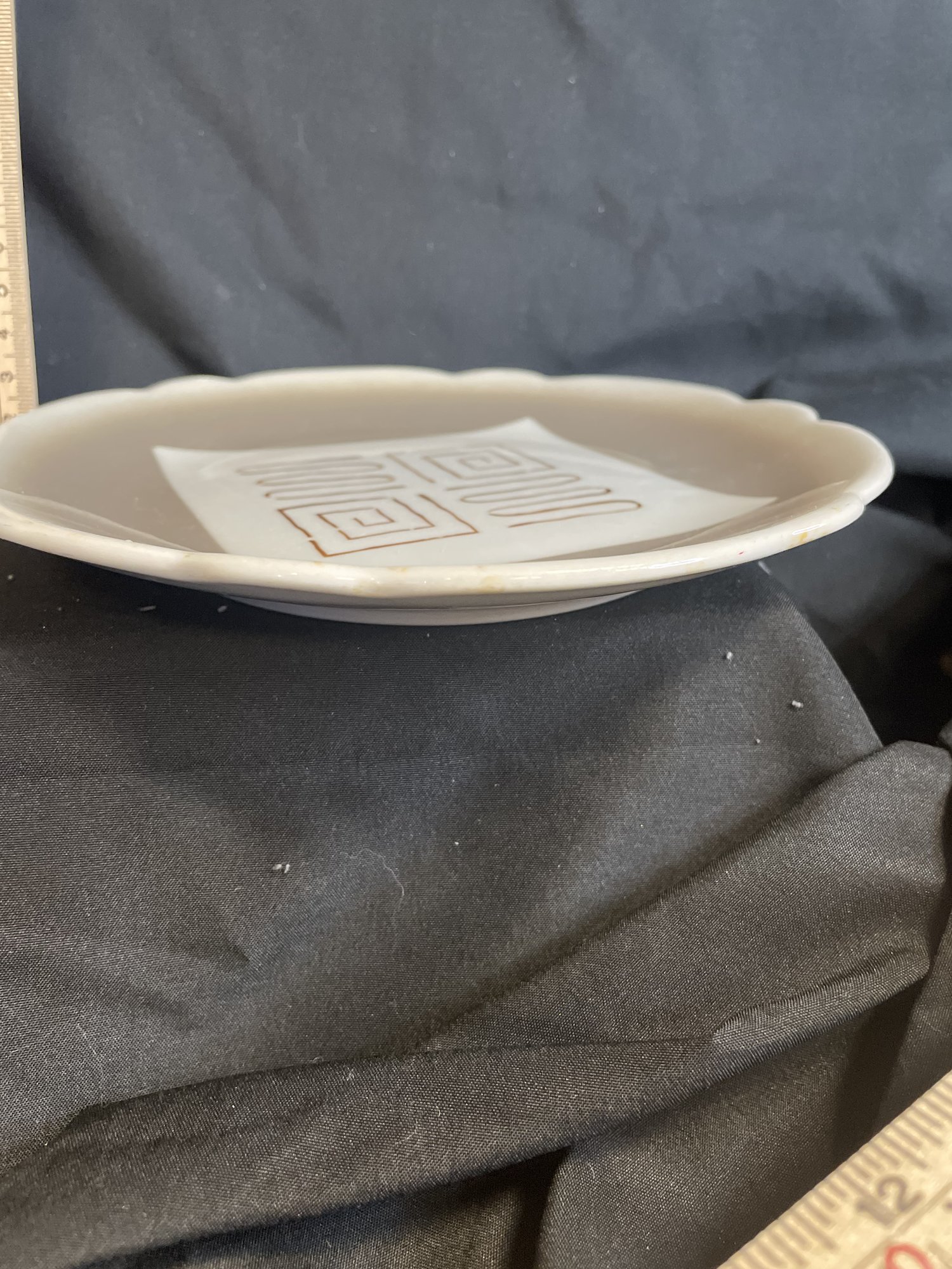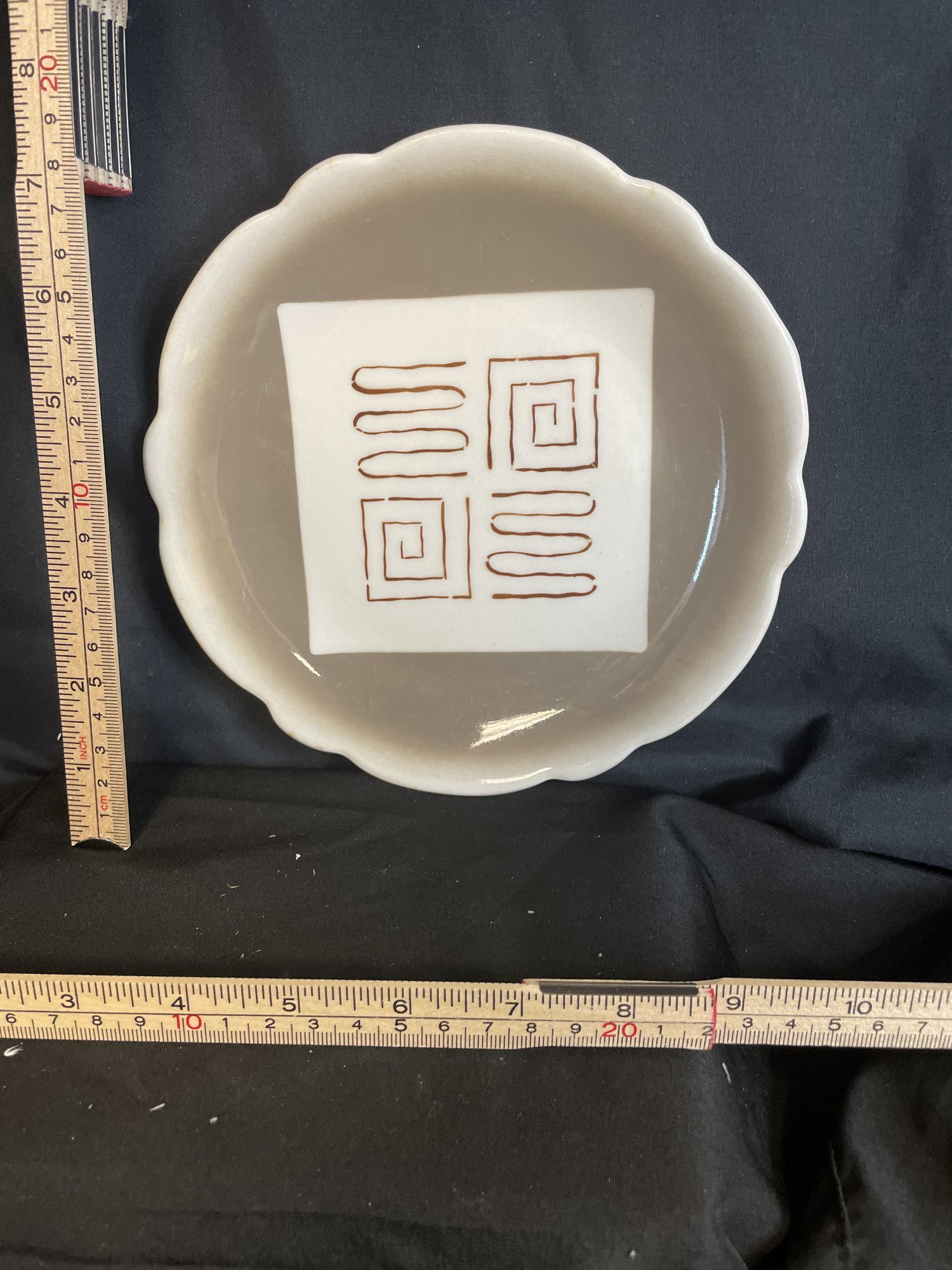 MADE IN USA CERAMIC SCALLOPED PLATE WITH MONDER DESIGN COLORS TAUPE CREAM AND BROWN