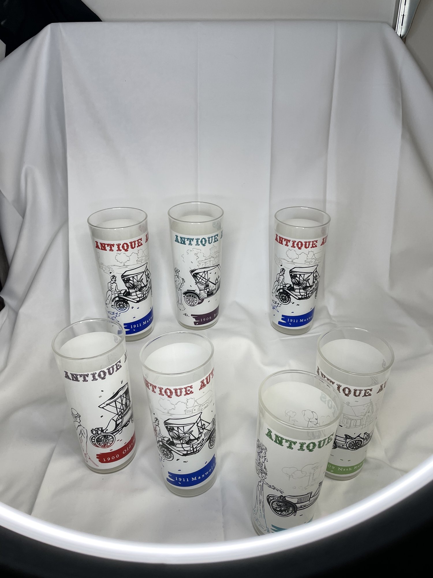 ANTIQUE AUTOS GLASSES FETURE FROSTED GLASS AND ILLISTRATIONS OF ANTIQUE CARS LIKE THE 1908 BUICK, STANLEY STEAMER, AND NASH RAMBLER