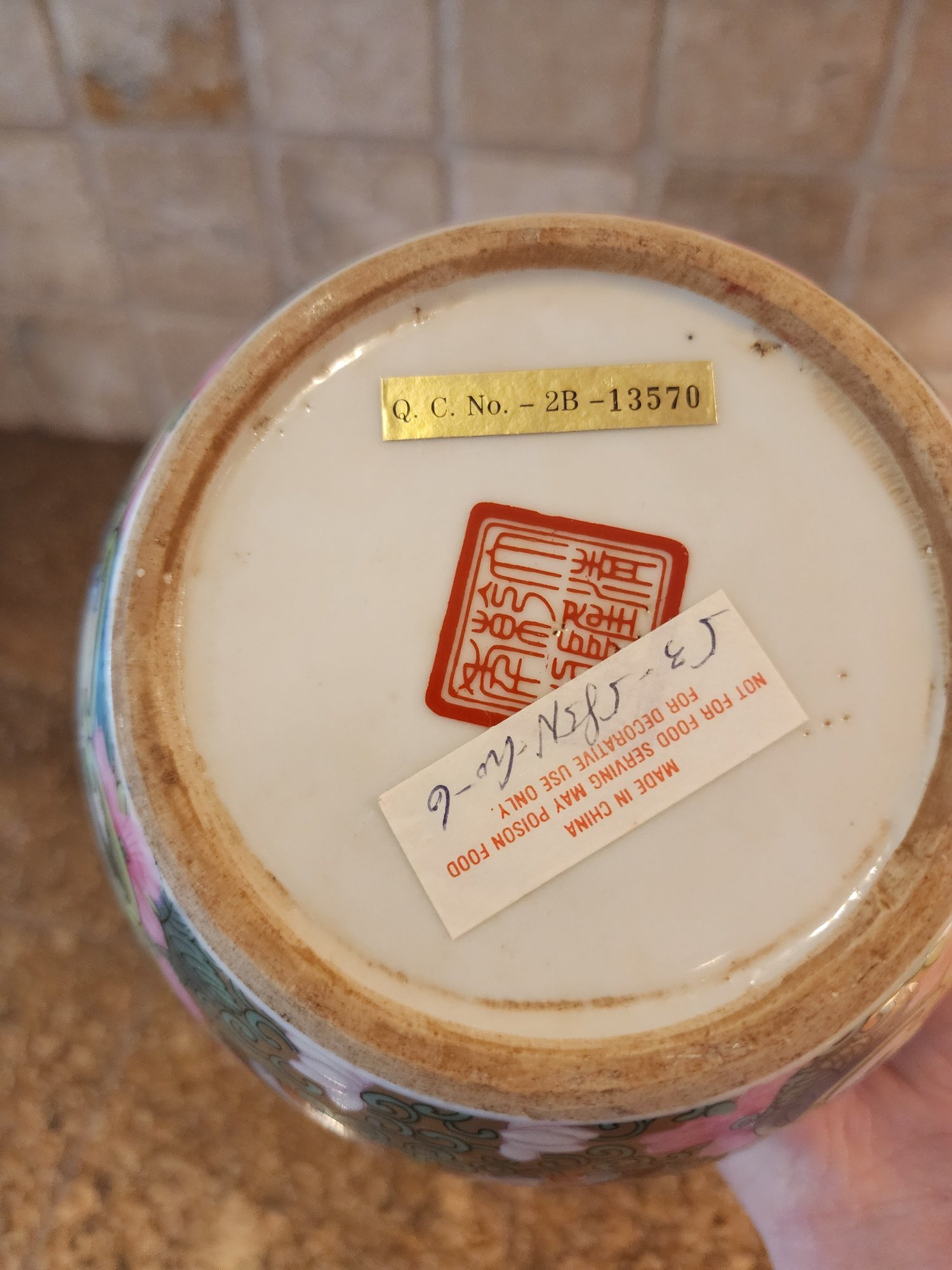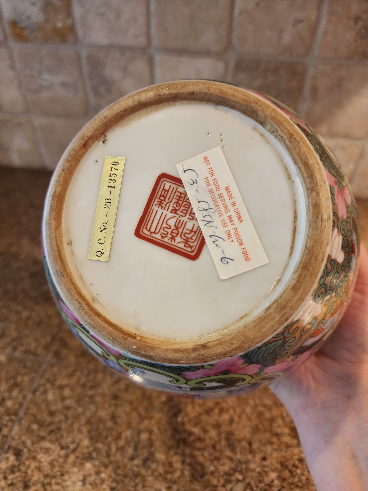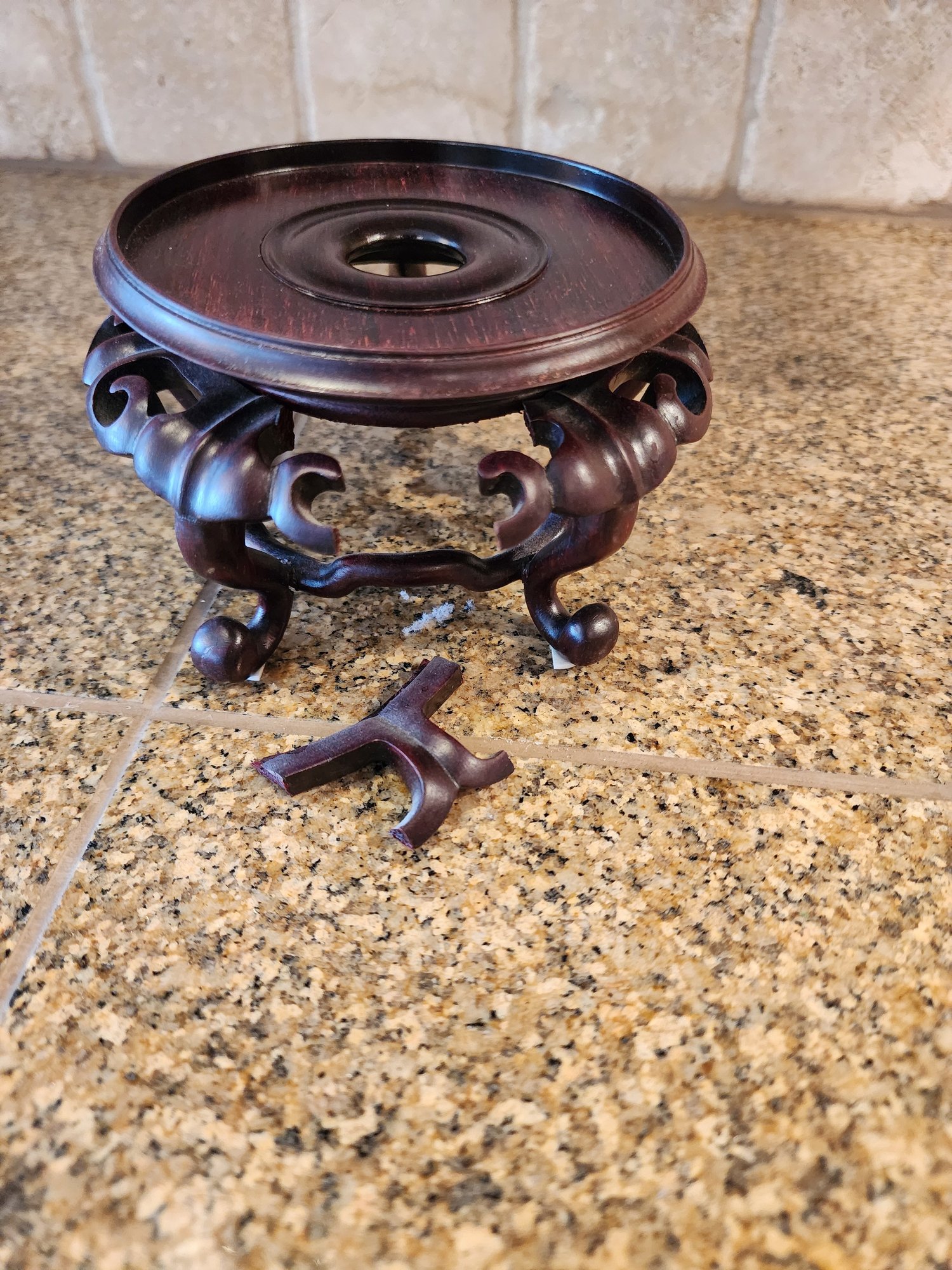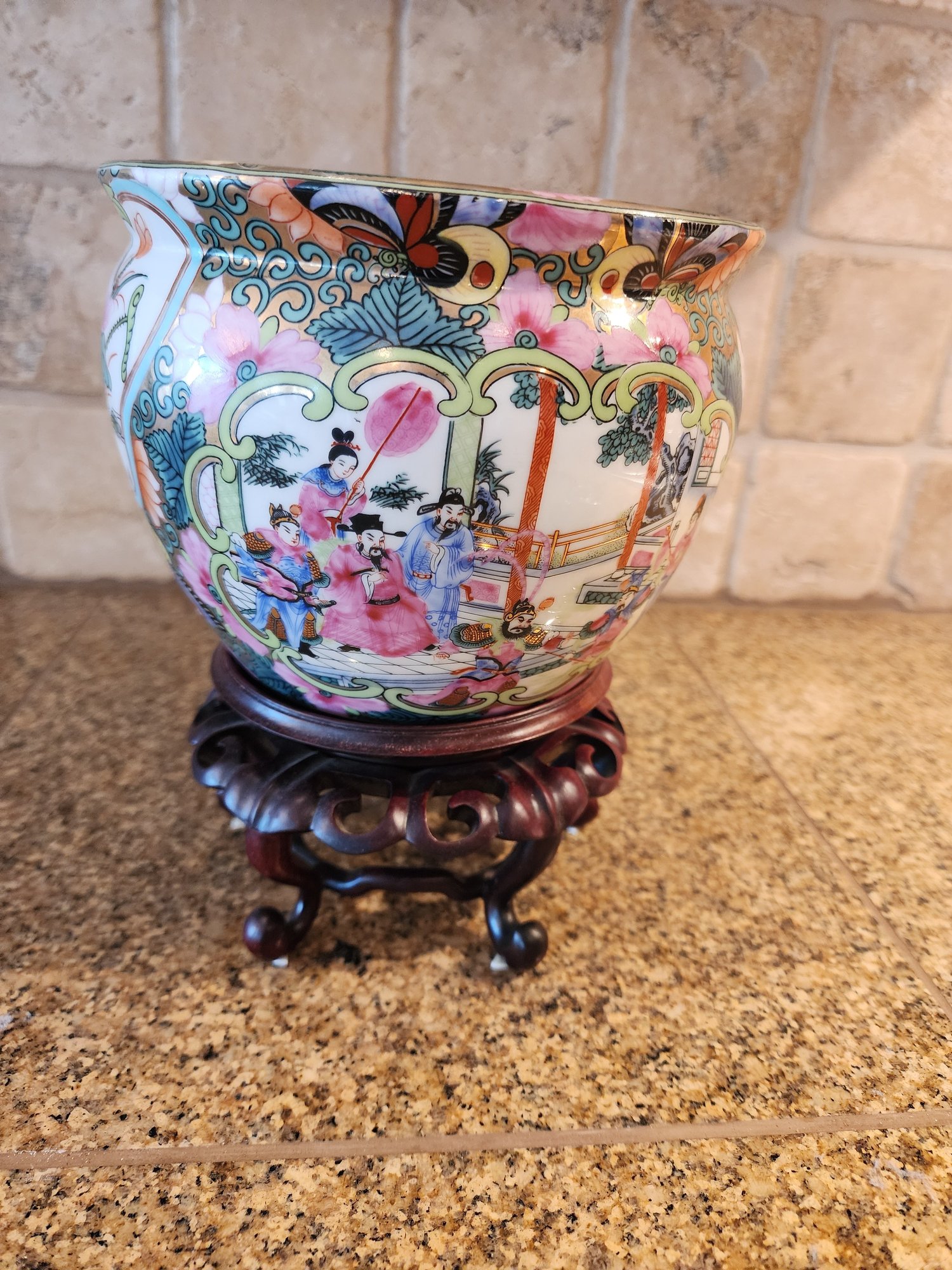 wood stand is broken on one spot. Pot is in very good condition