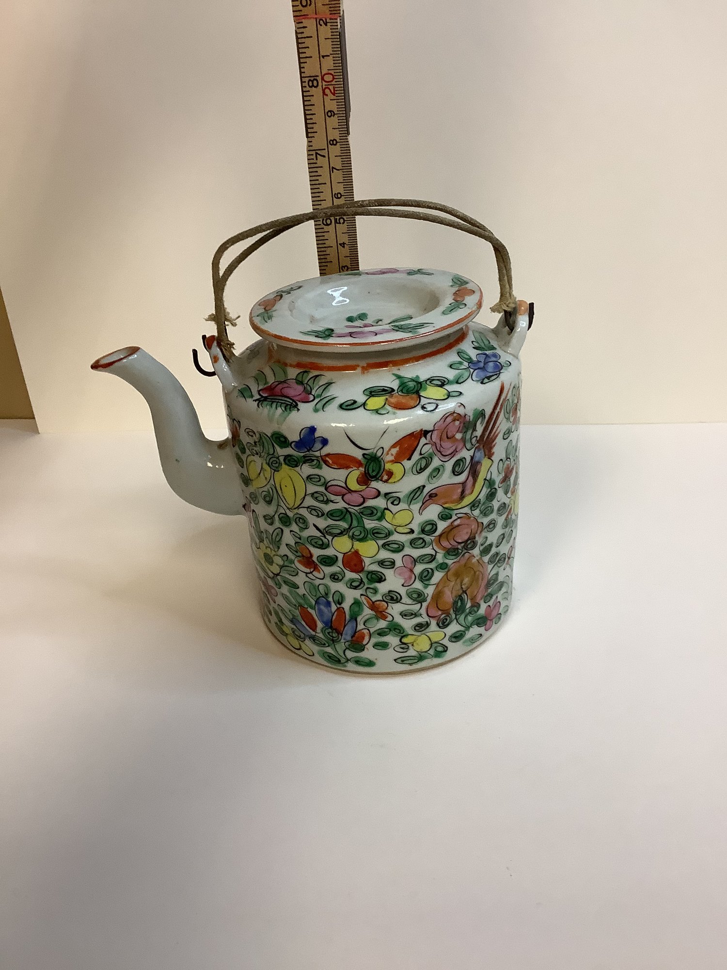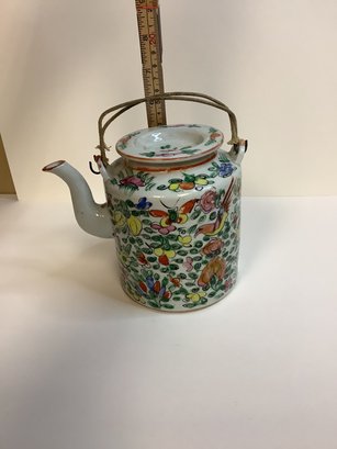 HAND PAINTED TRADITIONAL TEAPOT 5.5 X 6.5 FOLDING WIRE HANDLE WRAPED TO PROTECT FROM HEAT CIRCA 1850S