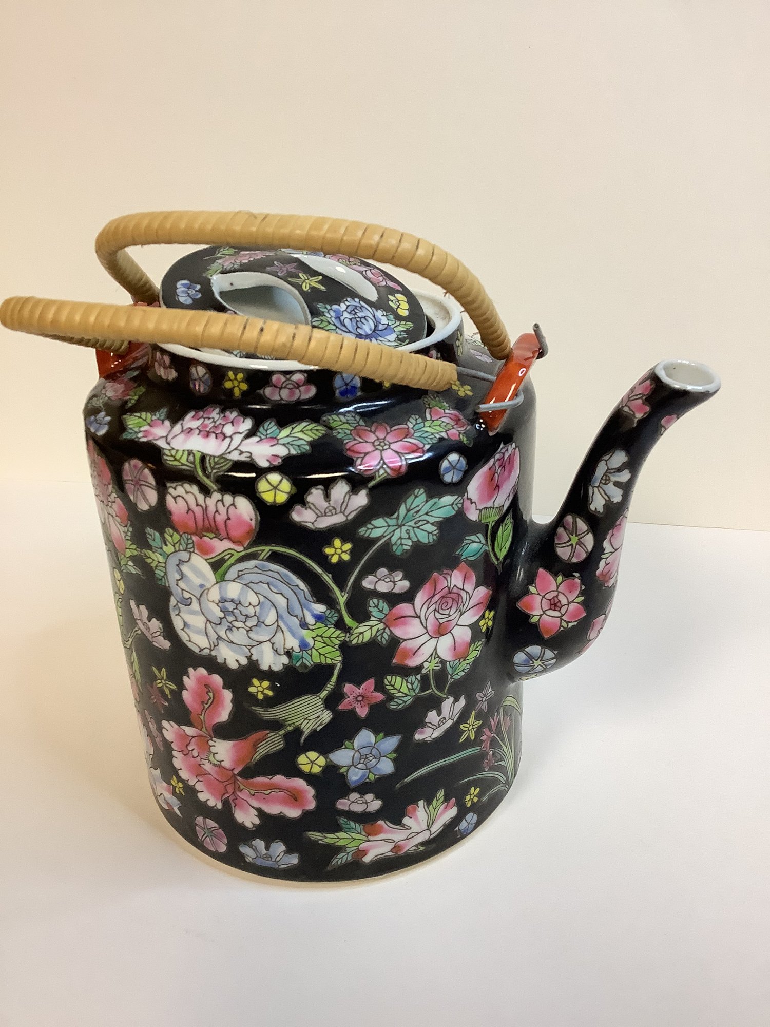 WITH LID 6.5 X6.75 WITH LID BEATITFUL FLORAL DESIGN LID WITH HANDLE HOLS RATTAN WRAPPED WIRE HANDLES. BLACK WITH BLUE AND PINK AND YELLOW.