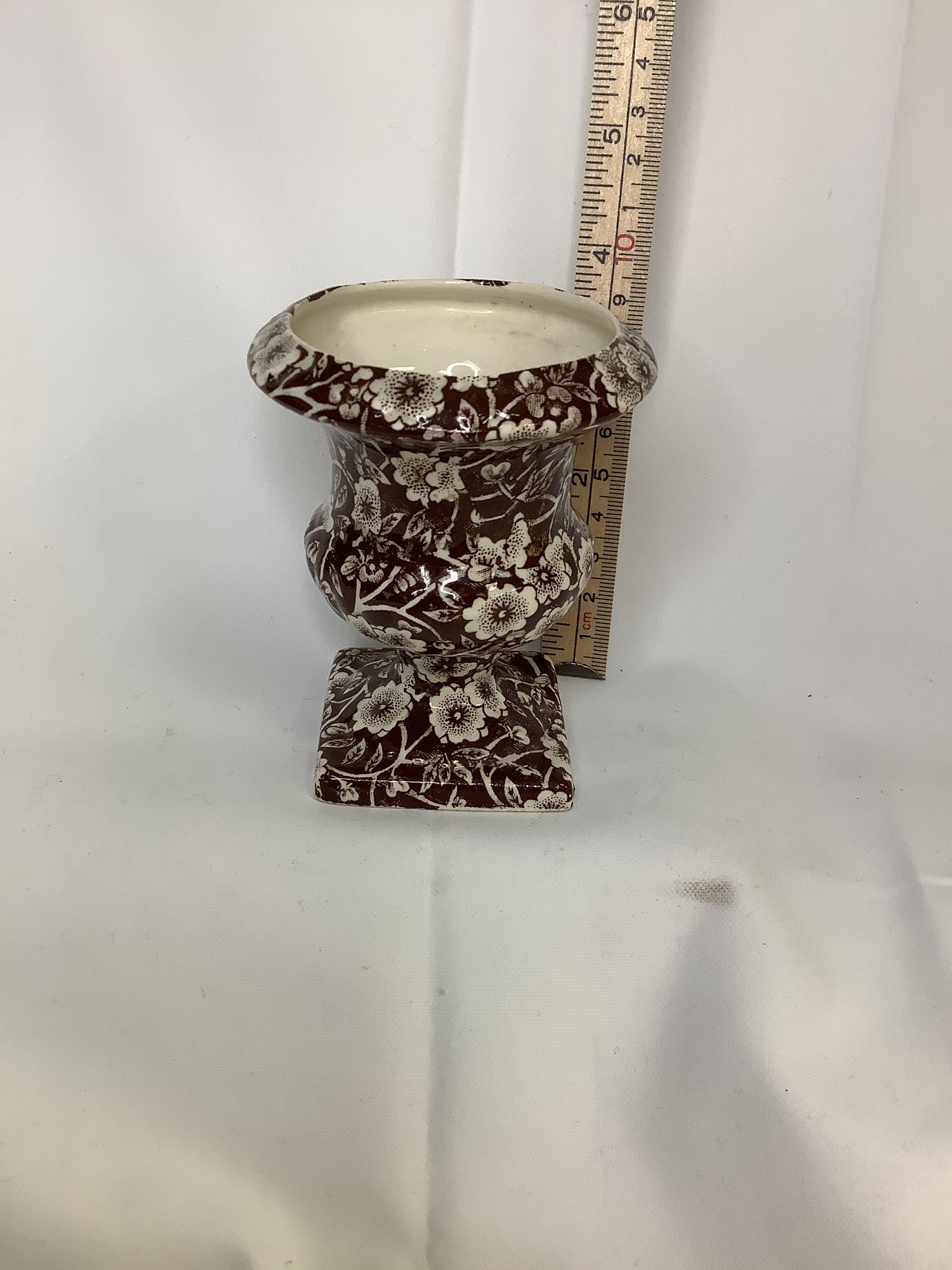 MANUFACTURE BY IRONSTONE IN ENGLAND MINI URN 4X3 ROUND URN ON SQUARE BASE CALICO BROWN AND CREAM DESIGN STAMPED ON THE BASE
