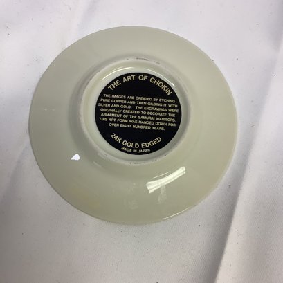 4 INCHED PROCELINE PLATE WITH CENTER IMAGE CREATED BY ETCHING COPPER AND GUILDED WITH SIVER AND GOLD. THE ENGRAVINGS WERE ORIGANALLY DESIGNED FOR THE ARMAMENT OF THE SAMERI