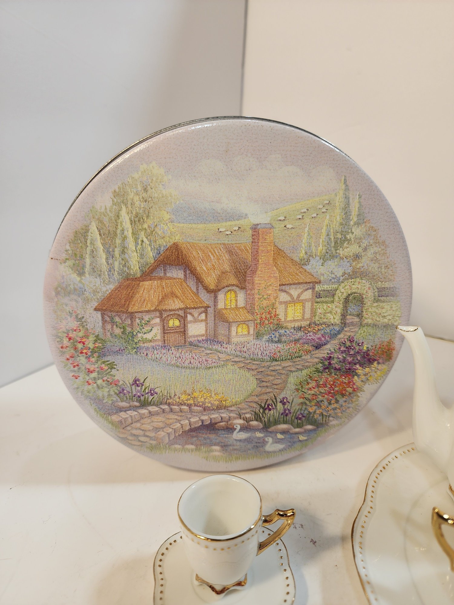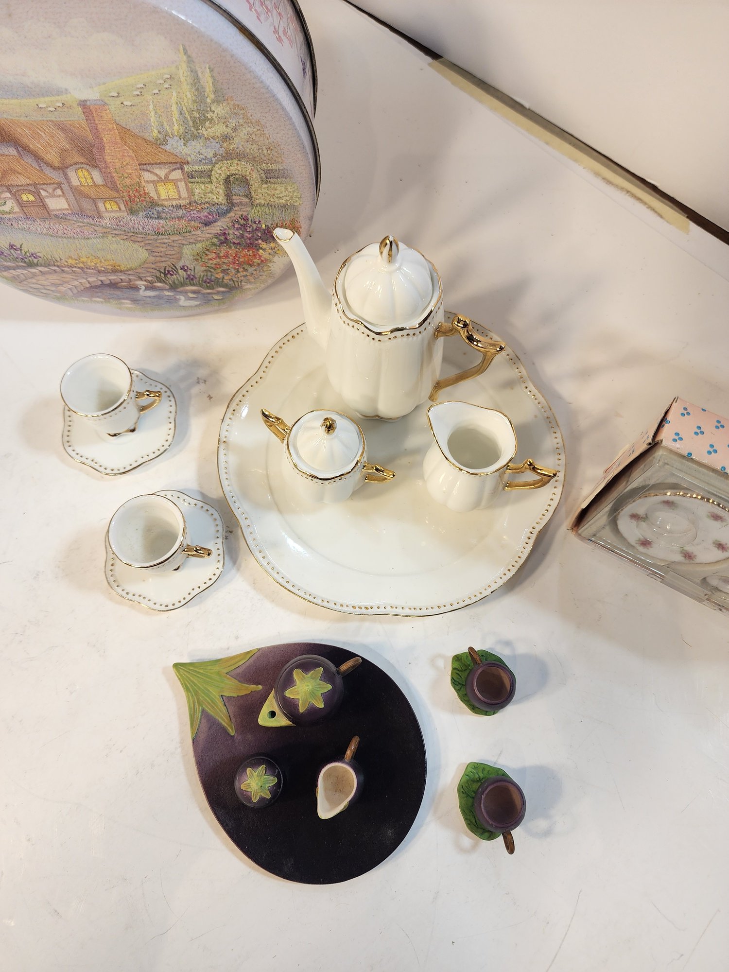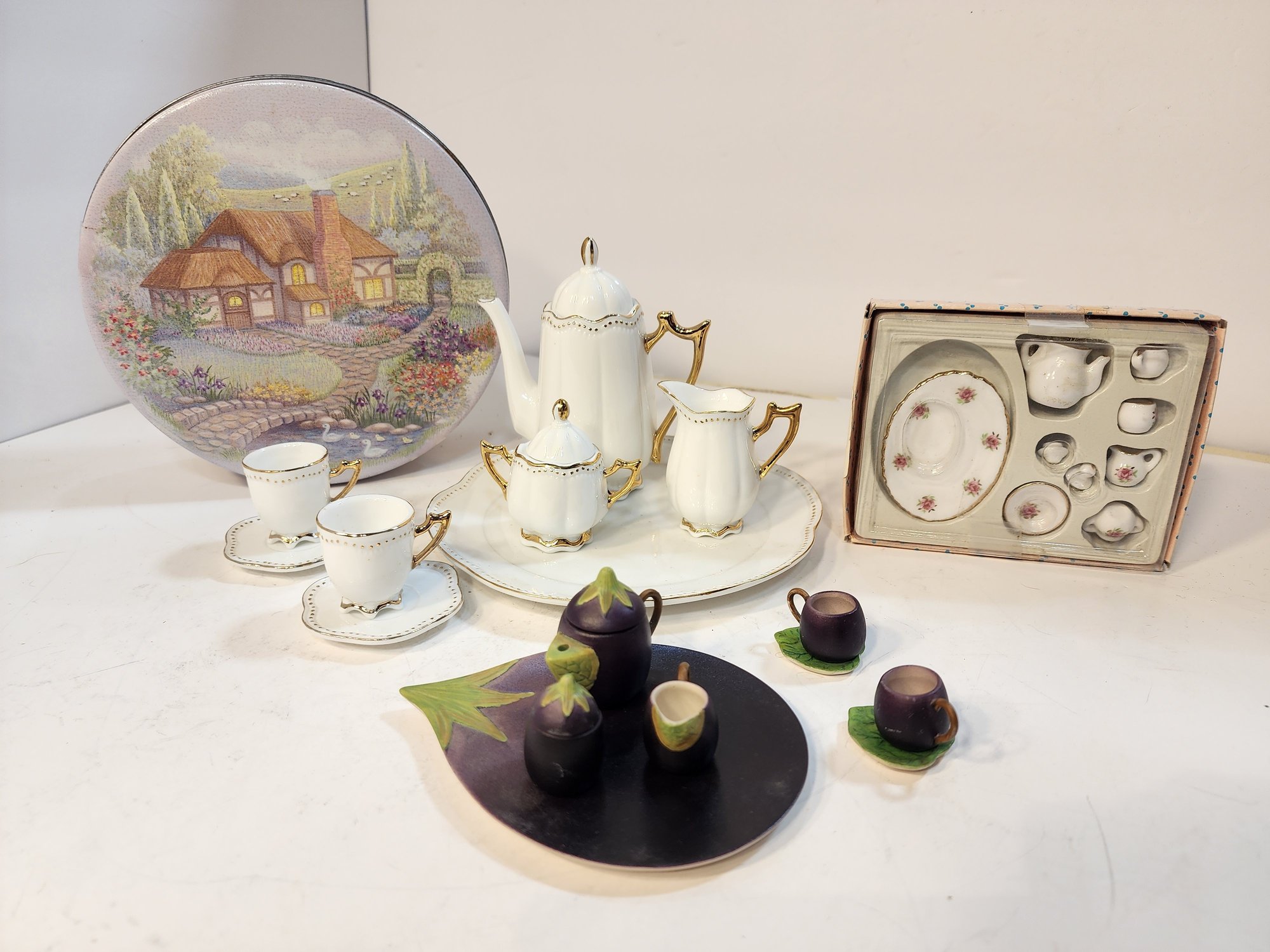 #75 3 Doll Toy Tea Sets And A Tin To Put Them In