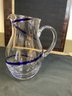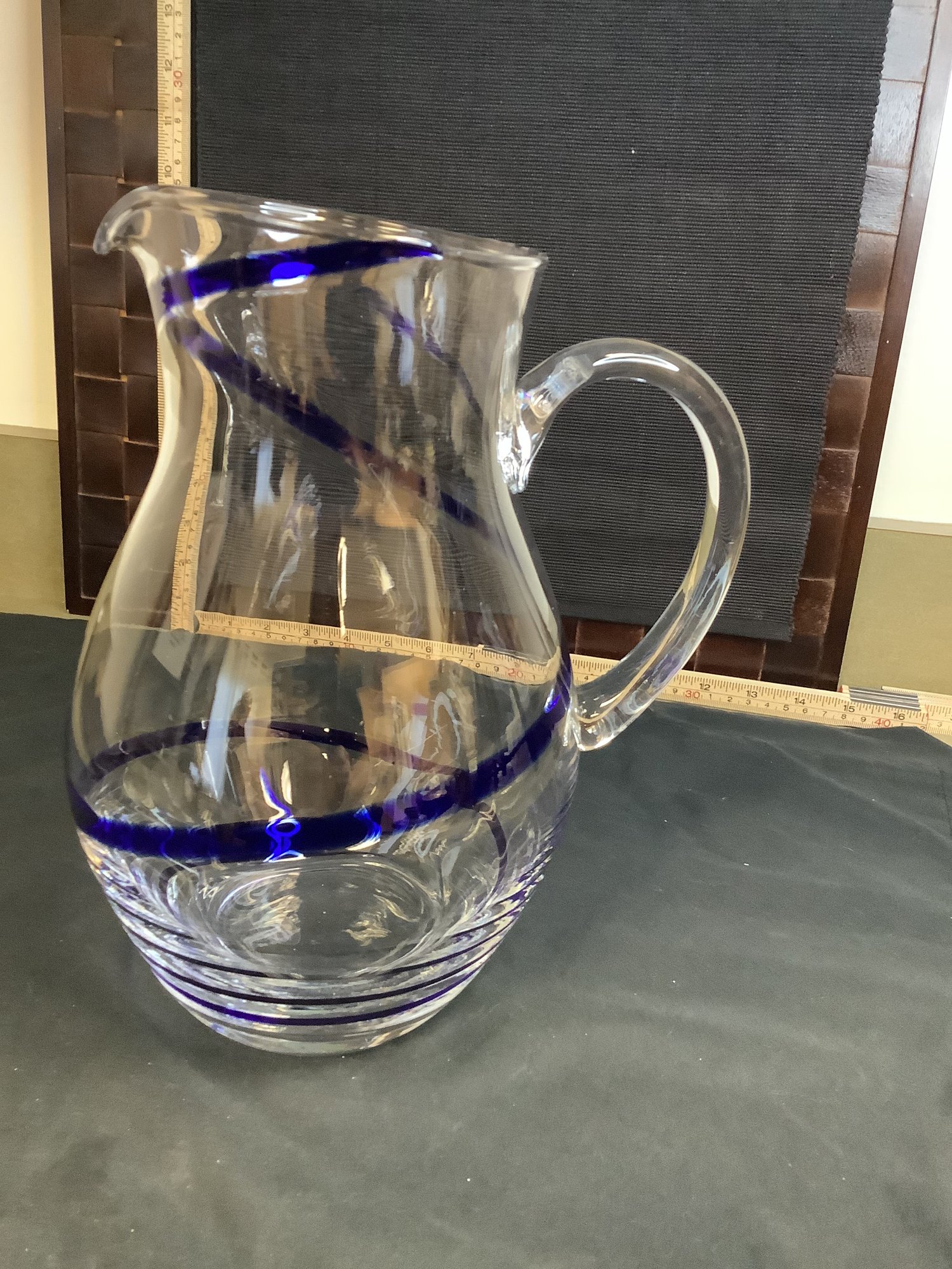 CLEAR AND COLBALT BLUE GLASS PITCHER. 2 QUART, WITH MINOR FLAWS FROM USE