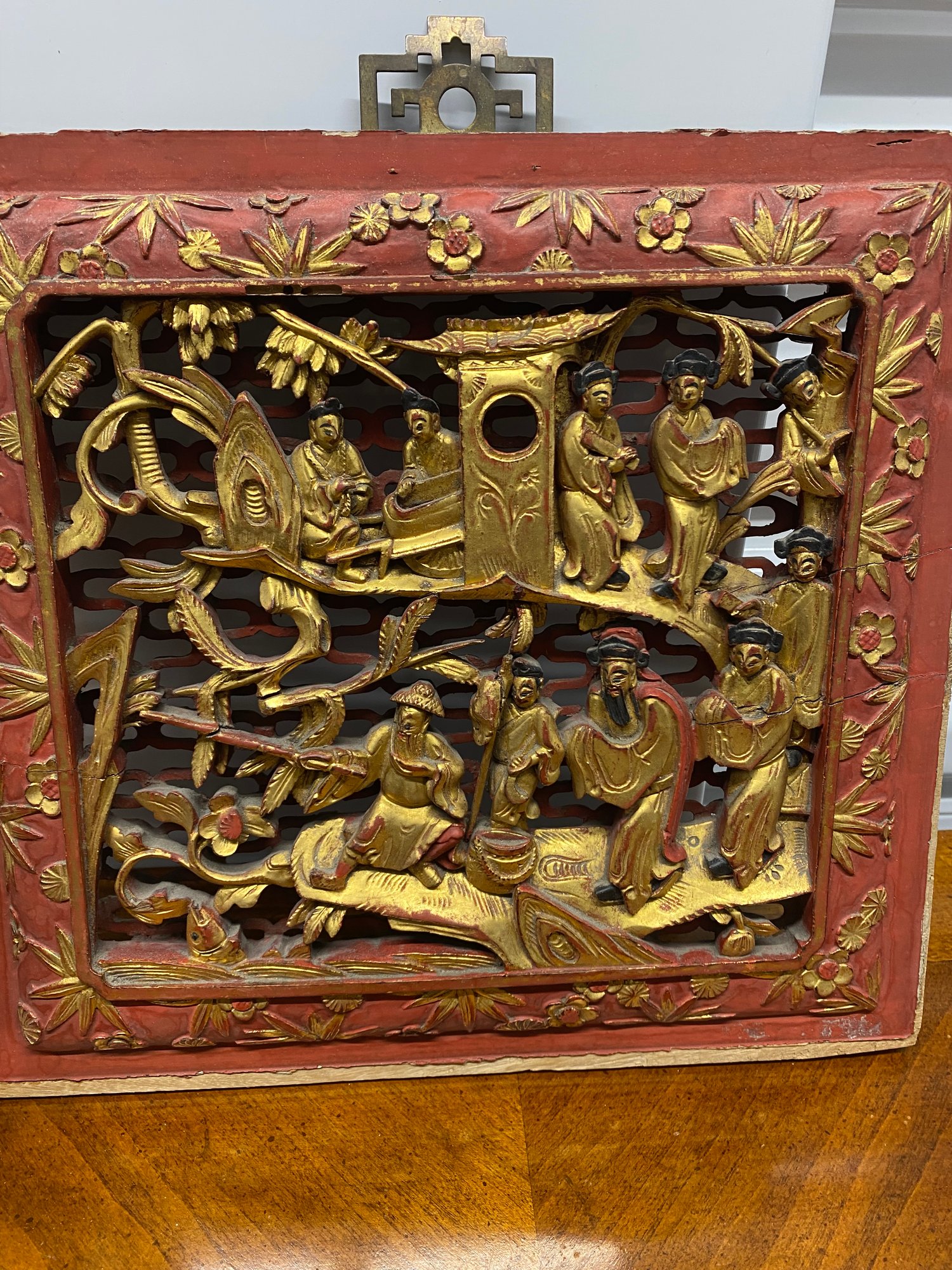 4 all different wood carvings panels with brass hooks all hand painted