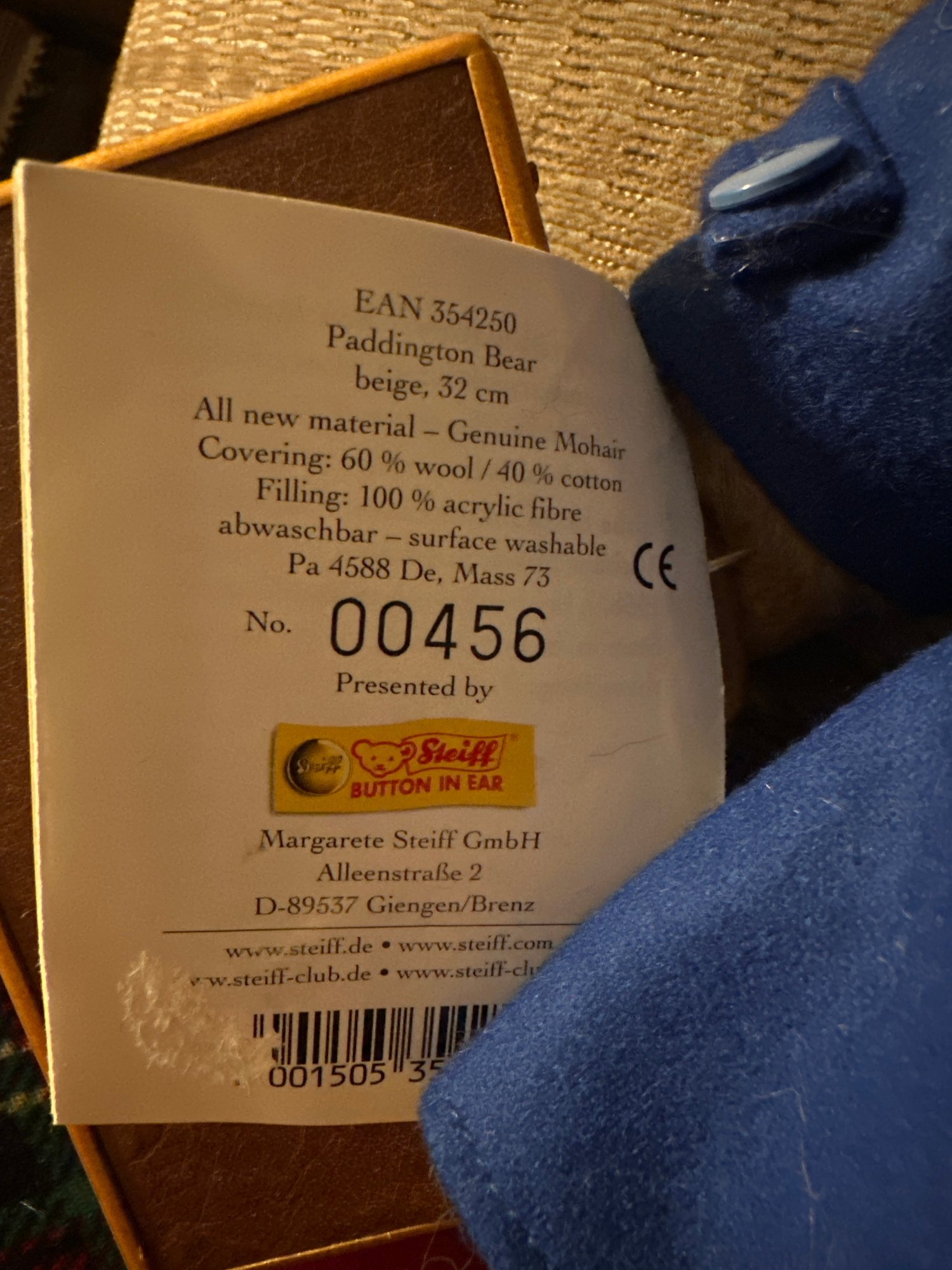 Paddington Bear stands 12” tall and is made of mohair. Limited Edition 456/5000.
