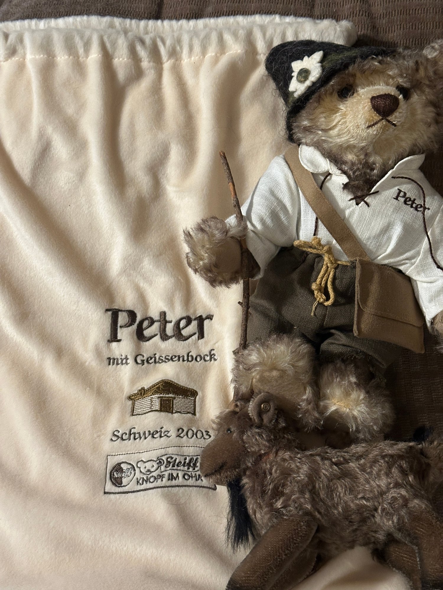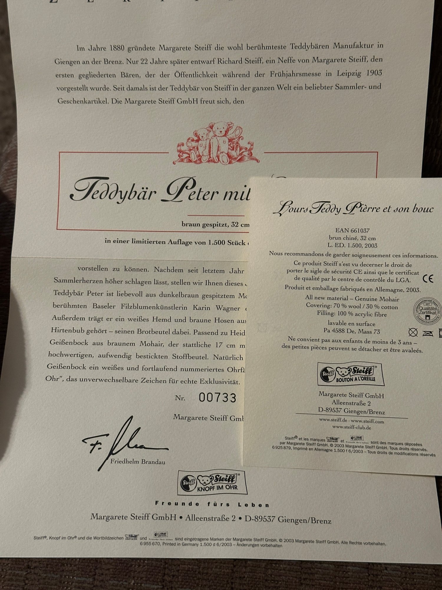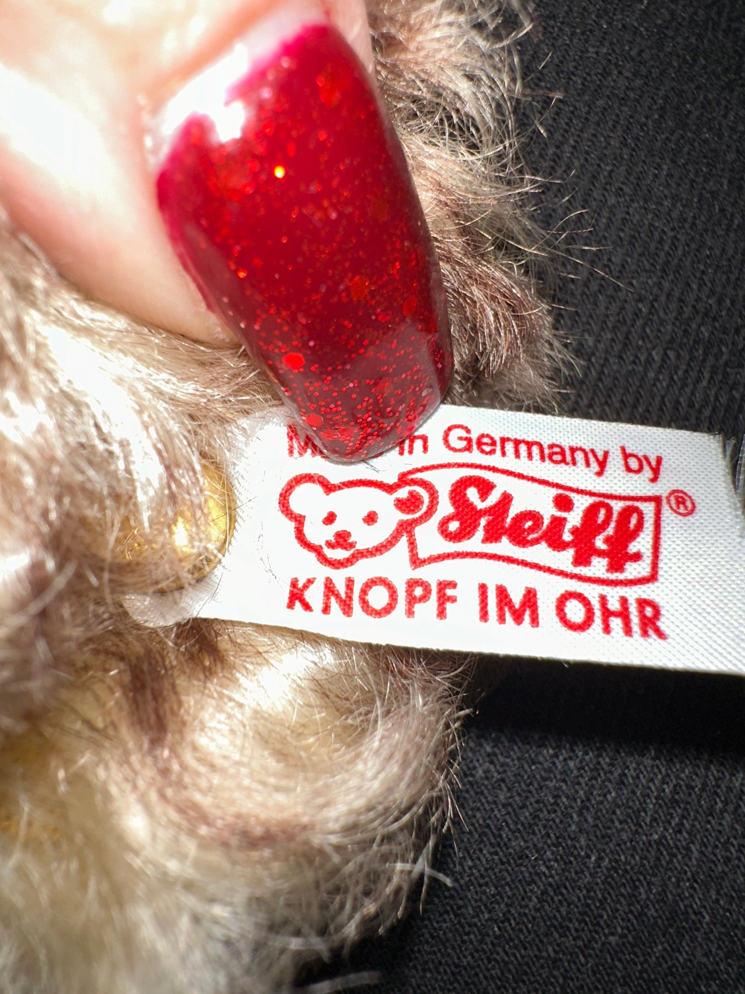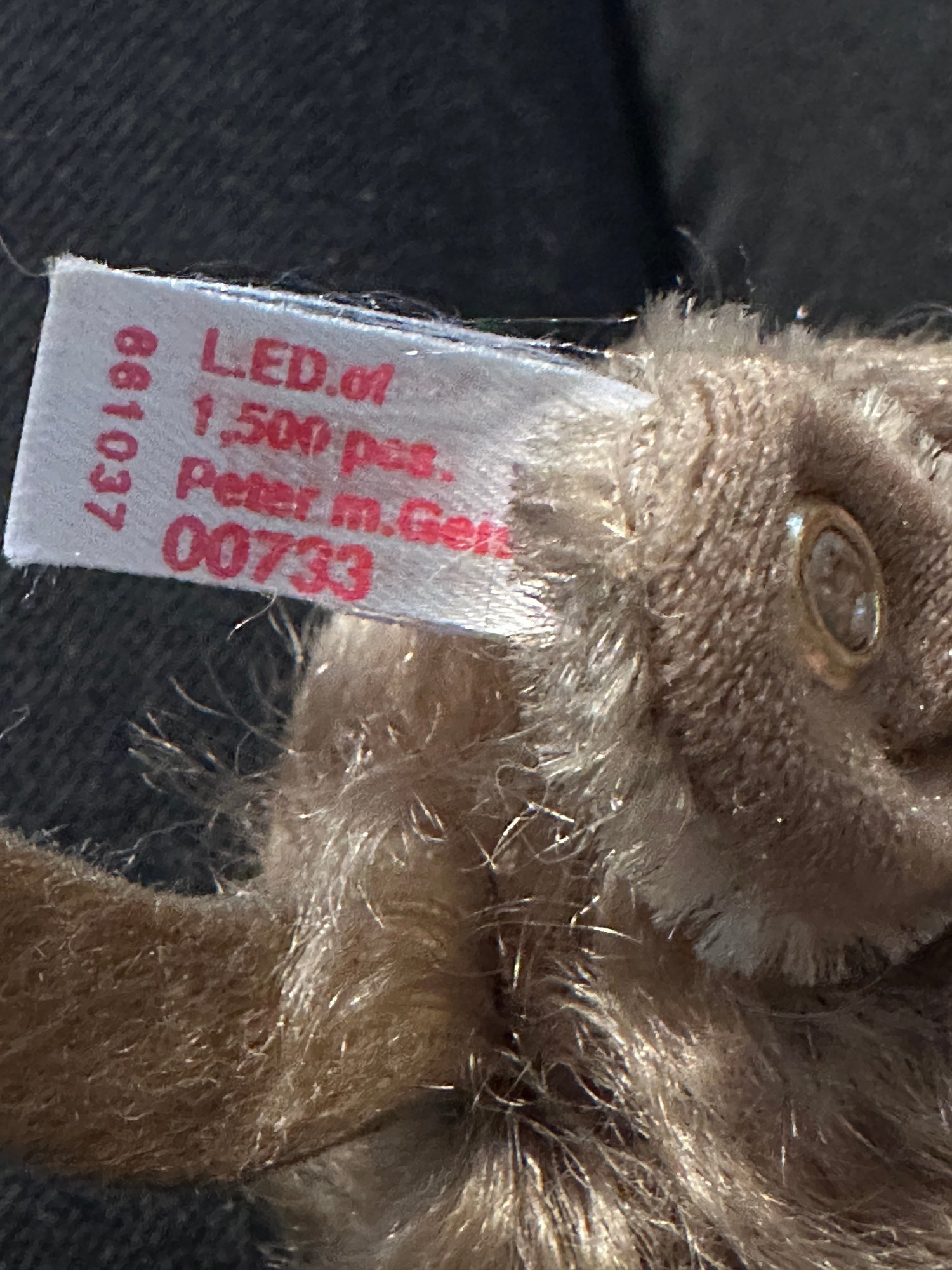 This Swiss exclusive is limited edition 733/1500. amazingly crafted mohair. He’s 12” tall comes with his COA inner and outer boxes. Also has a beautiful embroidered dust bag.